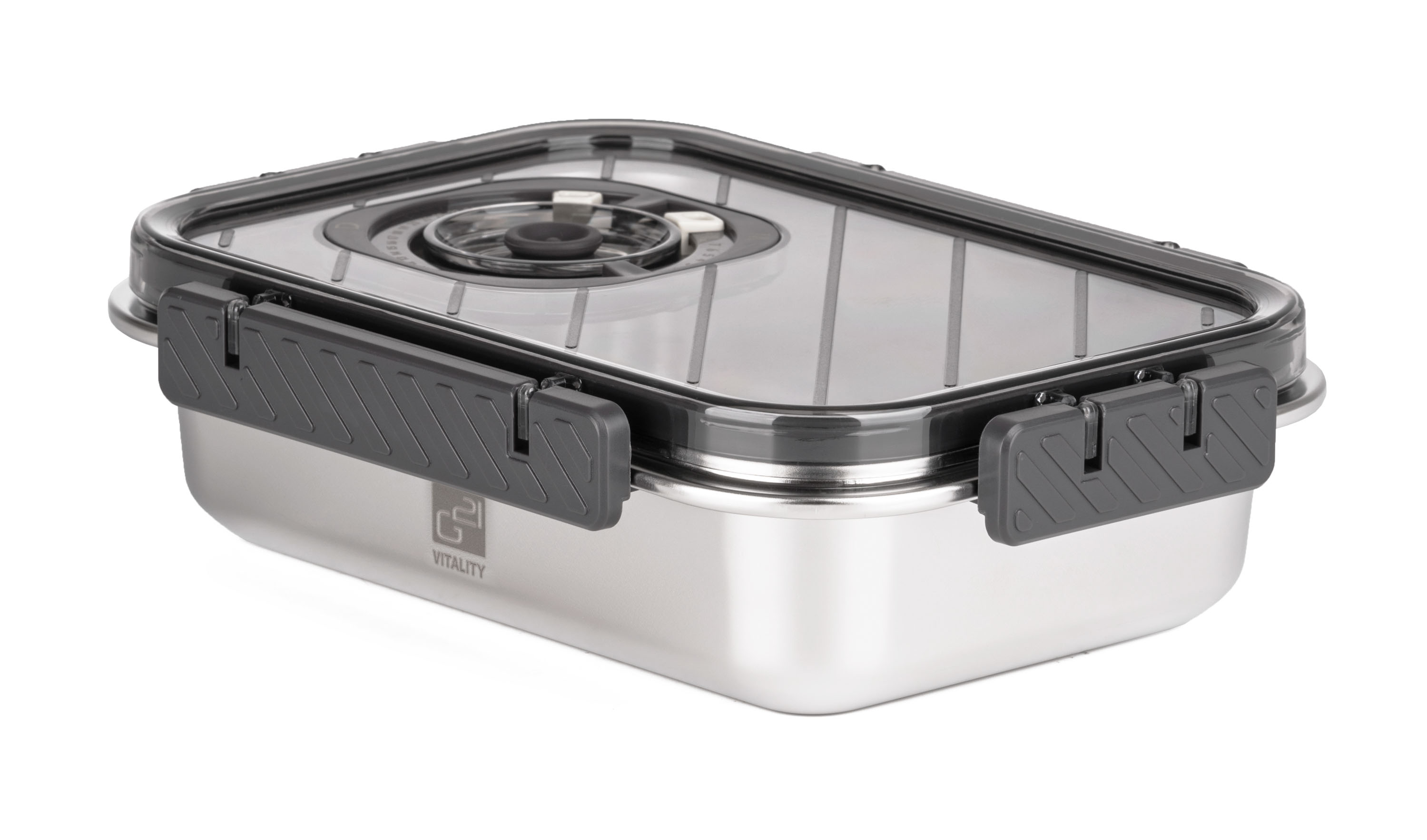 Nerezová vakuovací dóza o objemu 680 ml, víko s vakuovým ventilem, teplotní odolnost -100 až +400 °C, bezpečný hygienický nerez materiál, kompatibilní s vakuovačkami G21.