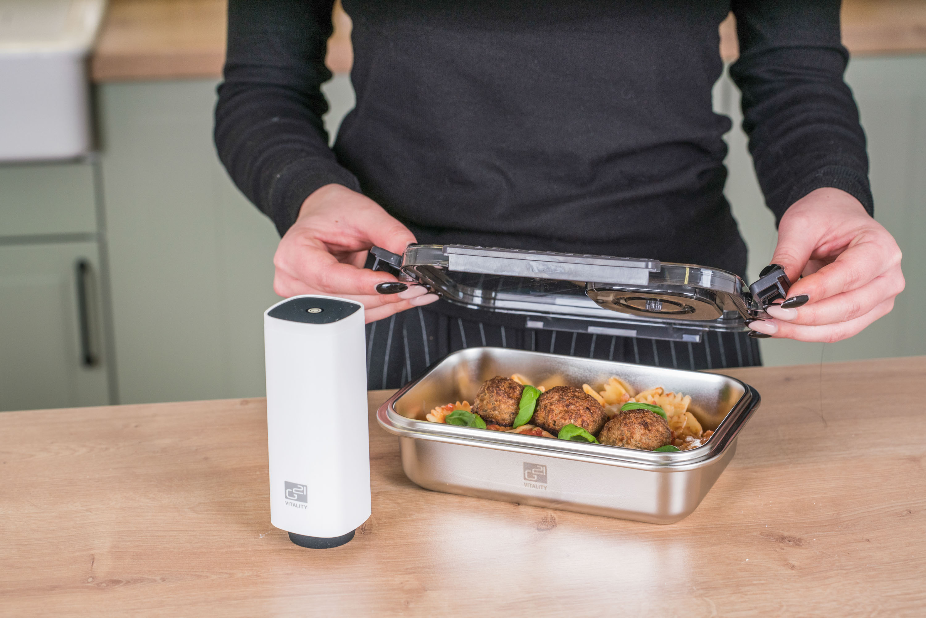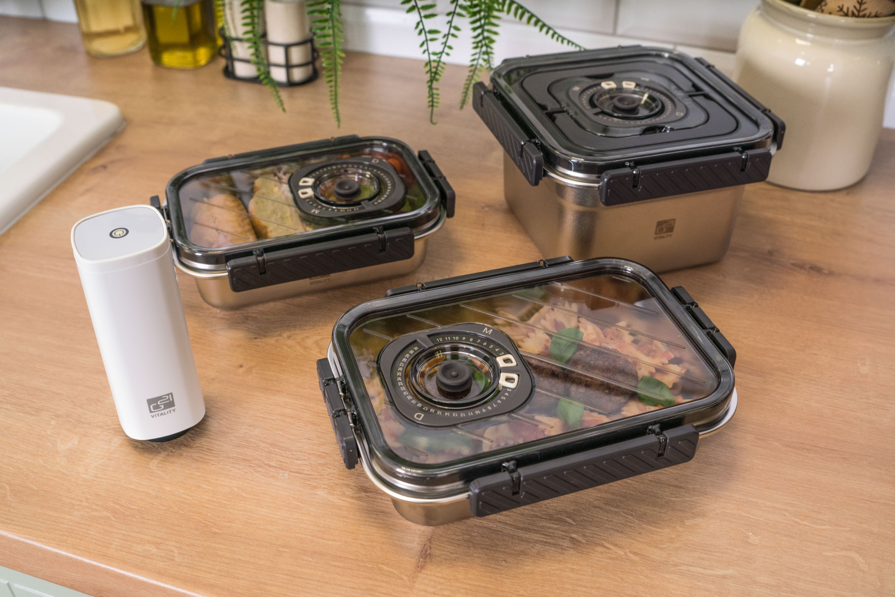 Prodloužení trvanlivosti potravin a zachování čerstvosti, vakuování, chlazení i mražení, skleněné borosilikátové tělo, víko BPA Free, nastavení data, teplotní odolnost dózy -20 až + 400 °C.