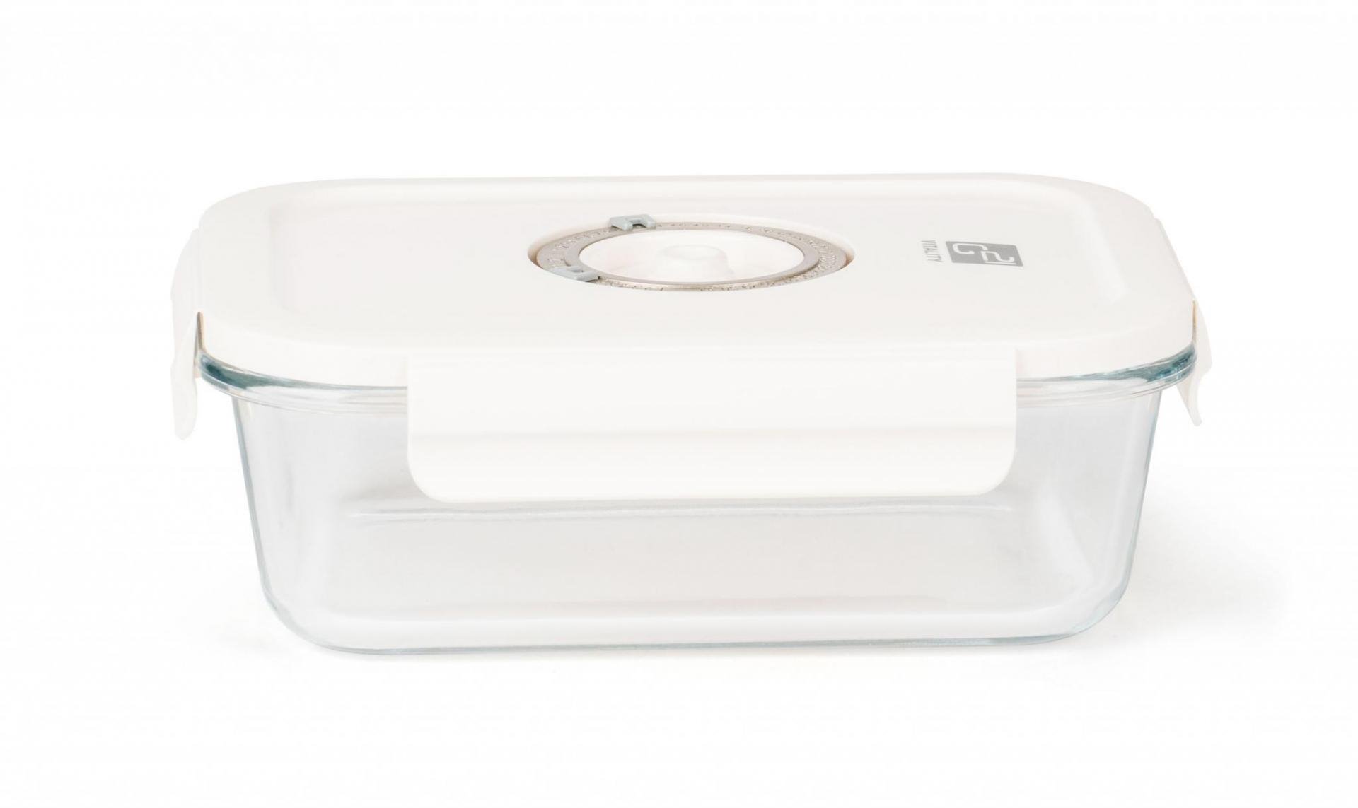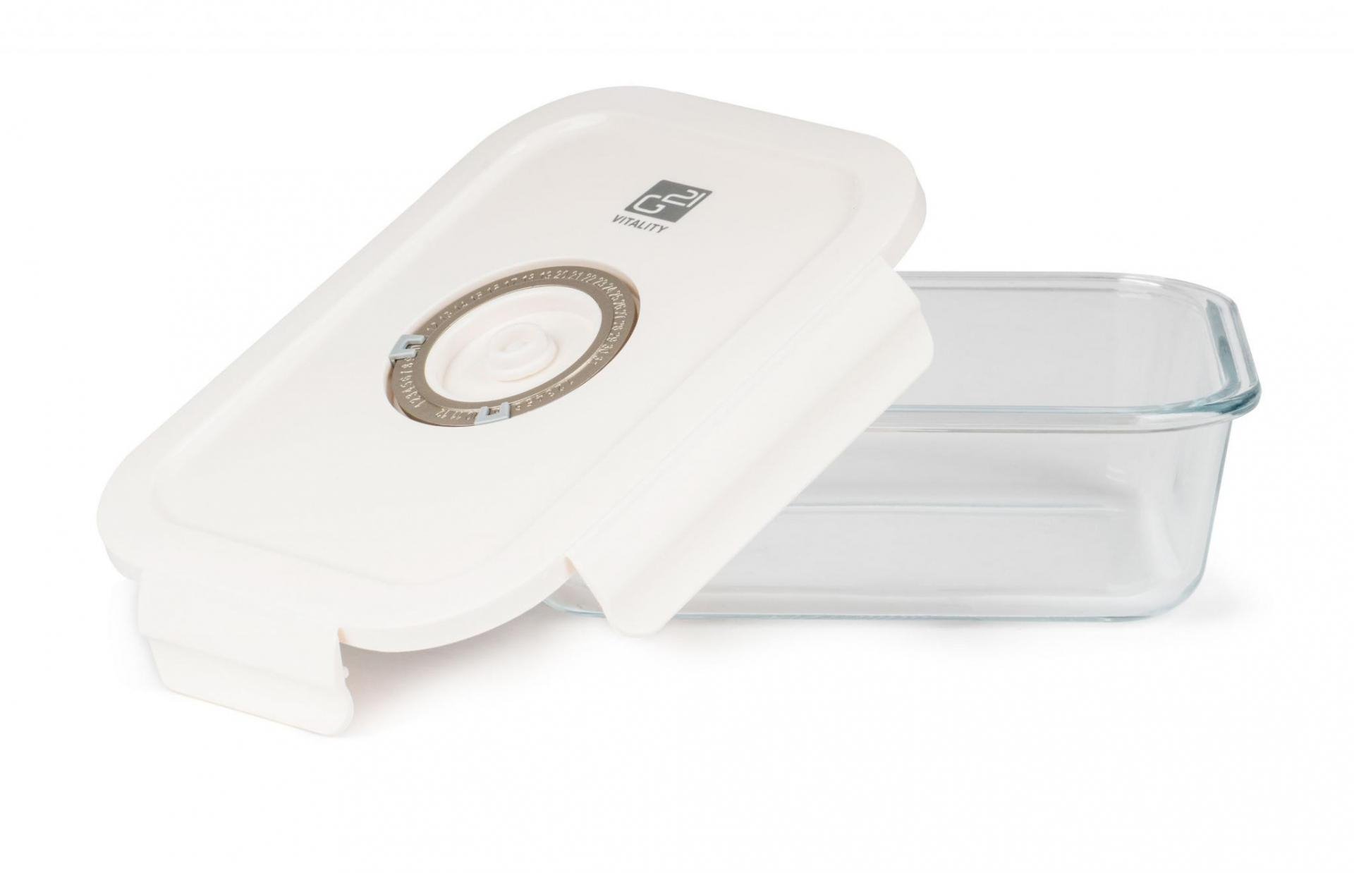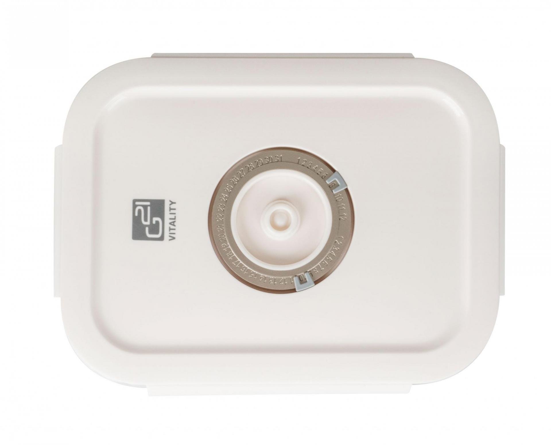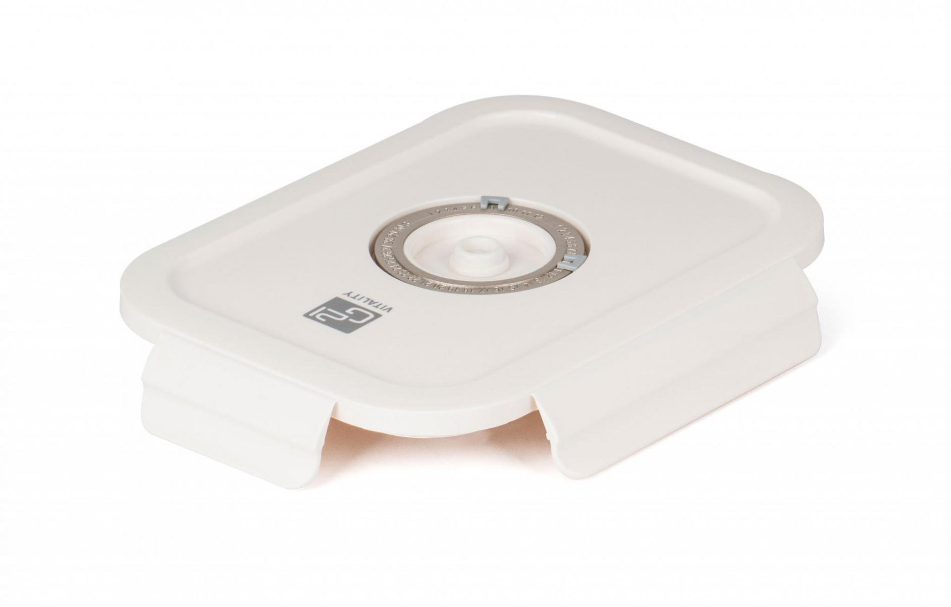 Plastové víko je vybaveno vakuovacím ventilem a praktickým nastavováním data. Budete tak vědět, kdy byly potraviny vakuovány nebo do kdy se mají spotřebovat. Ventil uprostřed víka lze jemně zmáčknout pro snadné uvolnění vakua.