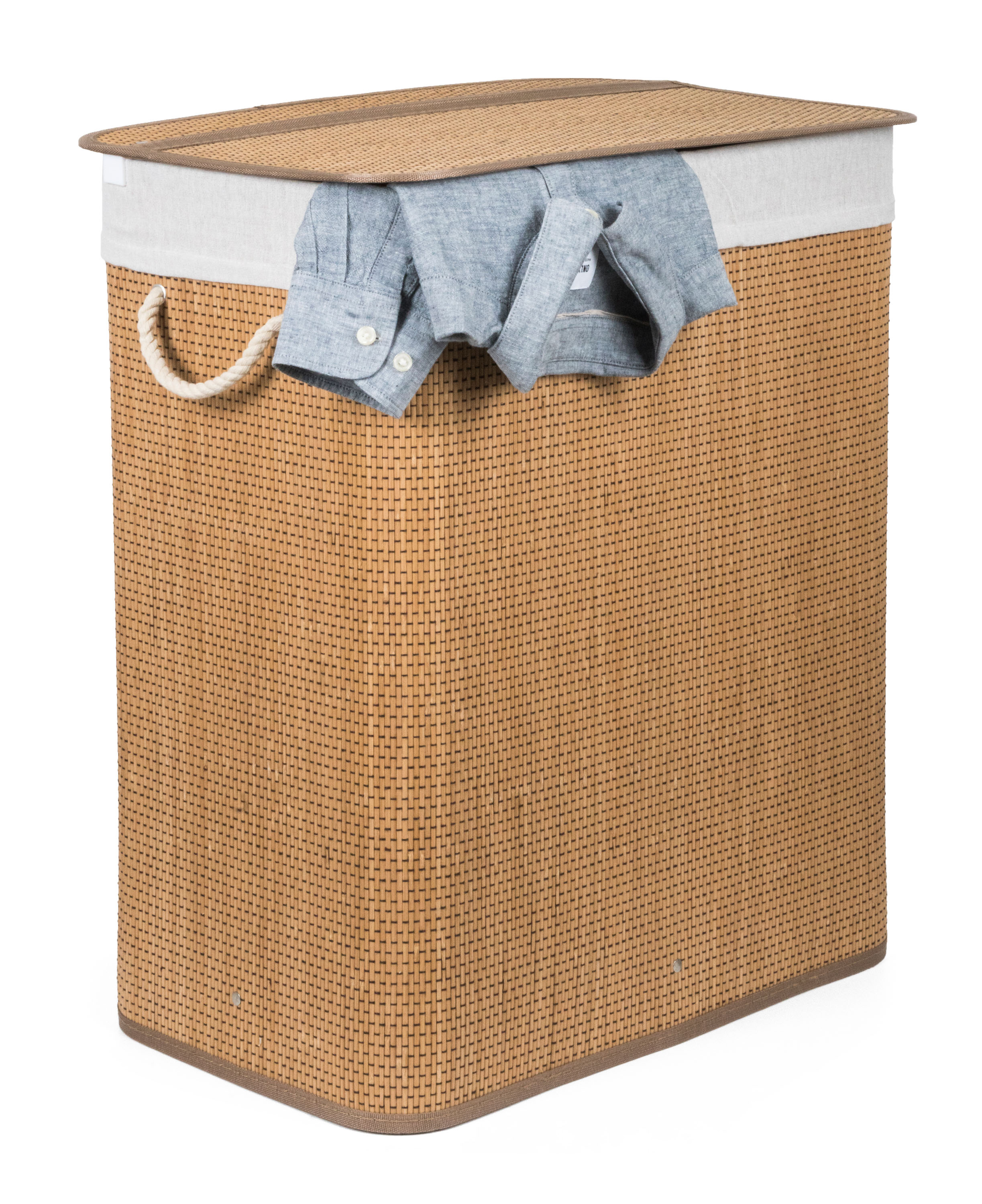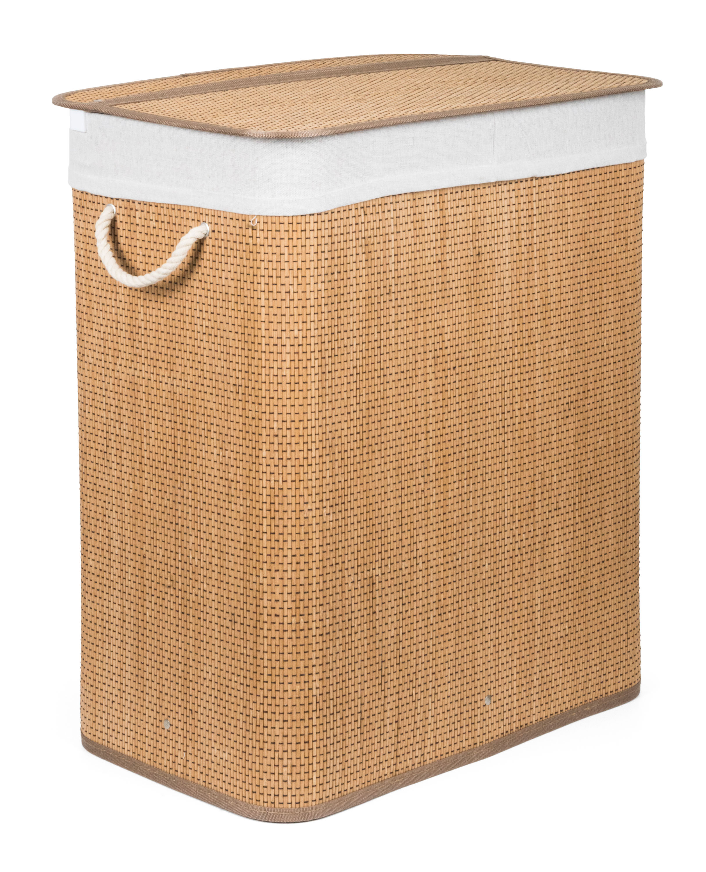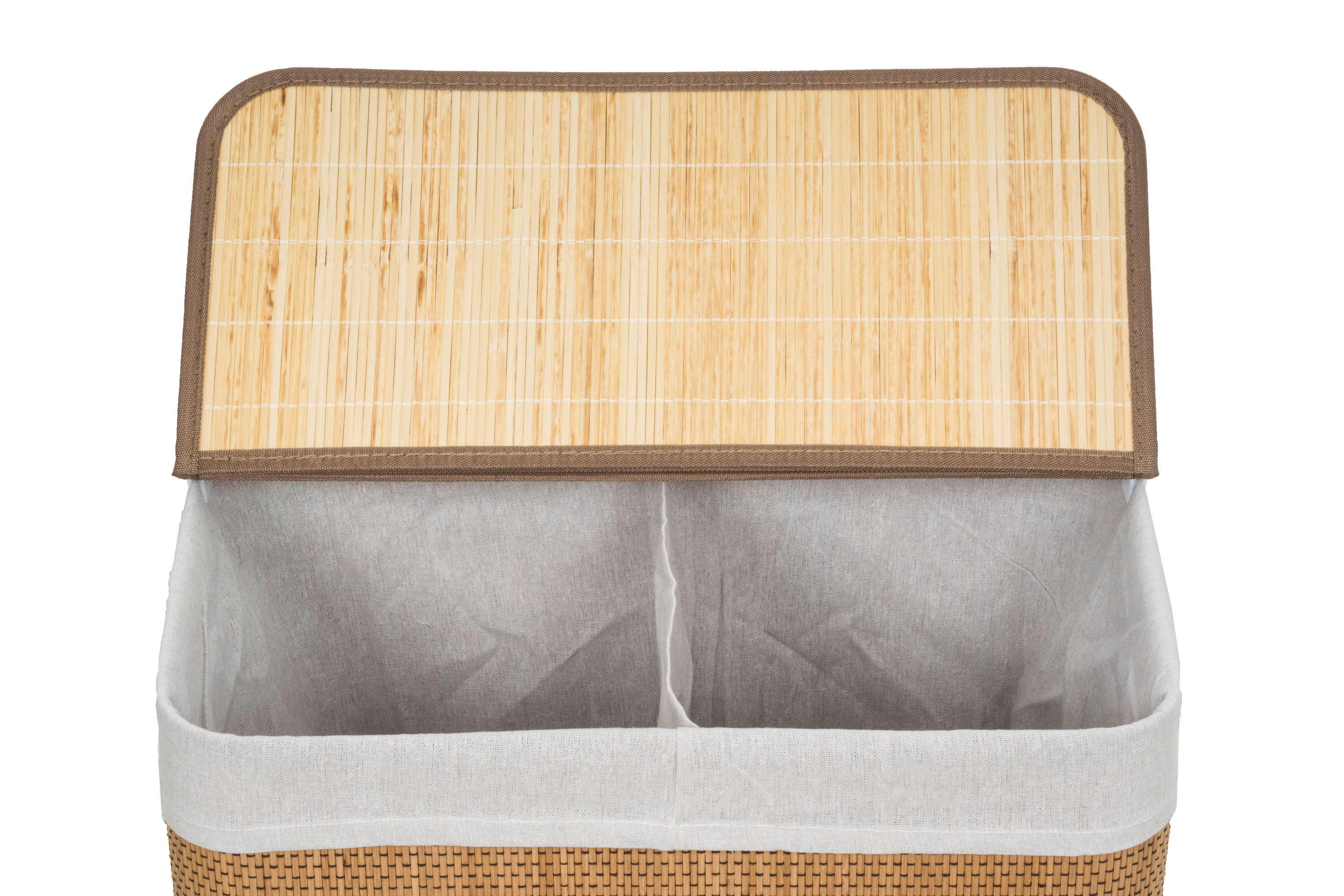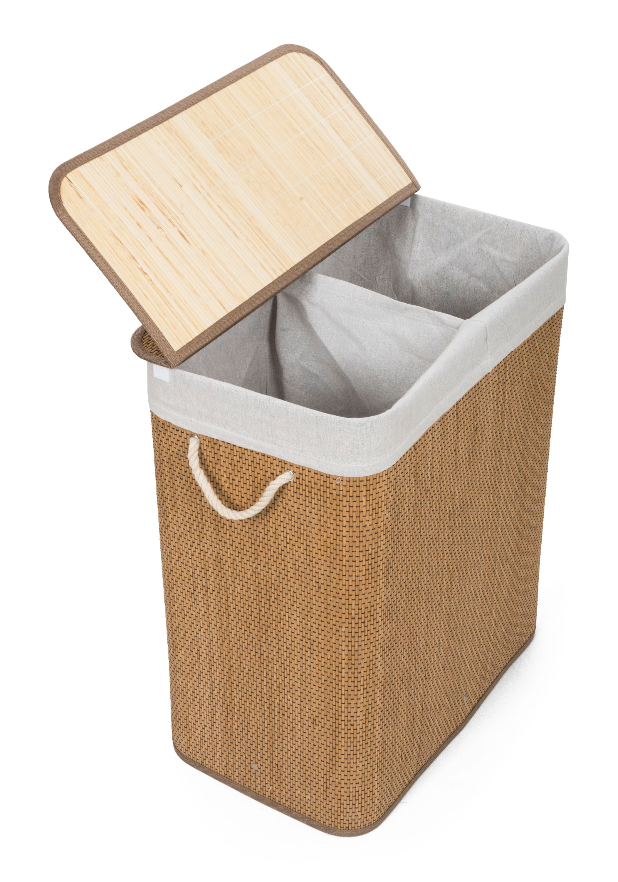 Bambusový koš G21 s pevným víkem má pratelnou látkovou vložku, rozdělenou na dva samostatné oddíly. Špinavé prádlo tak můžete třídit už před praním a umístit zvlášť kousky podle materiálu nebo barvy.