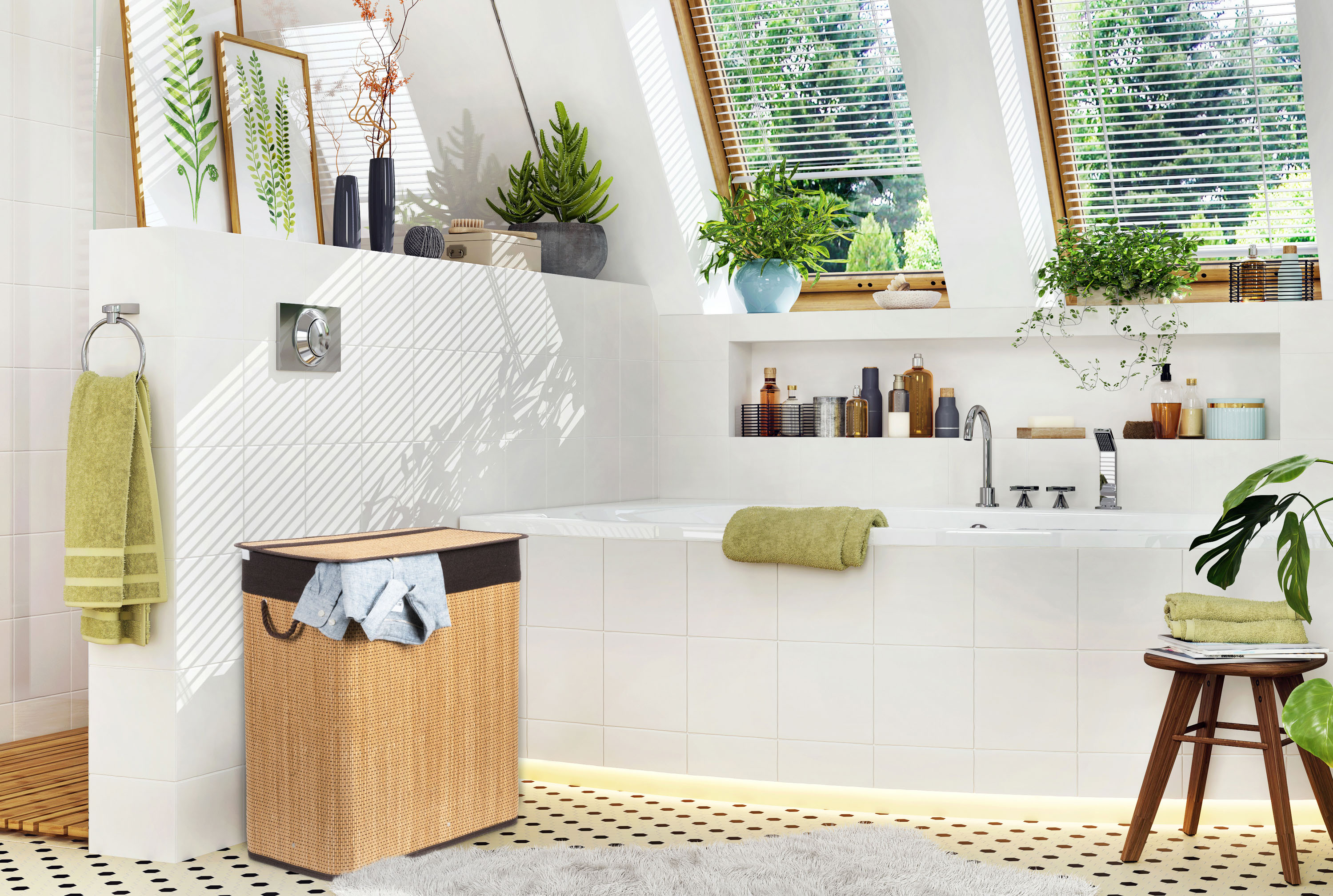 Jak vybrat nejlepší koš na špinavé prádlo? Co se materiálu koše týče, doporučujeme jednoznačně bambus. Je odolný vůči vlhkosti, takže jej můžete bez obav umístit do koupelny nebo servisní místnosti s pračkou. Zároveň je i vizuálně velmi příjemný – kombinace přírodního materiálu a barevně sladěné vložce a držadlům evokuje pocit čistoty, navíc se i hodí k jakémukoliv interiéru.