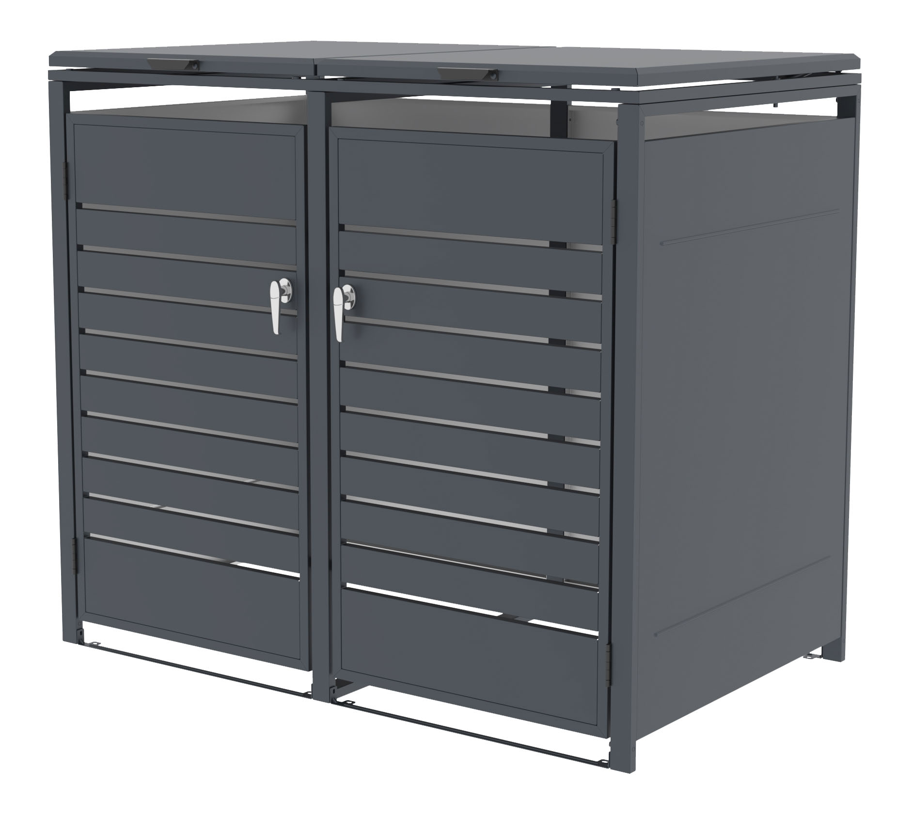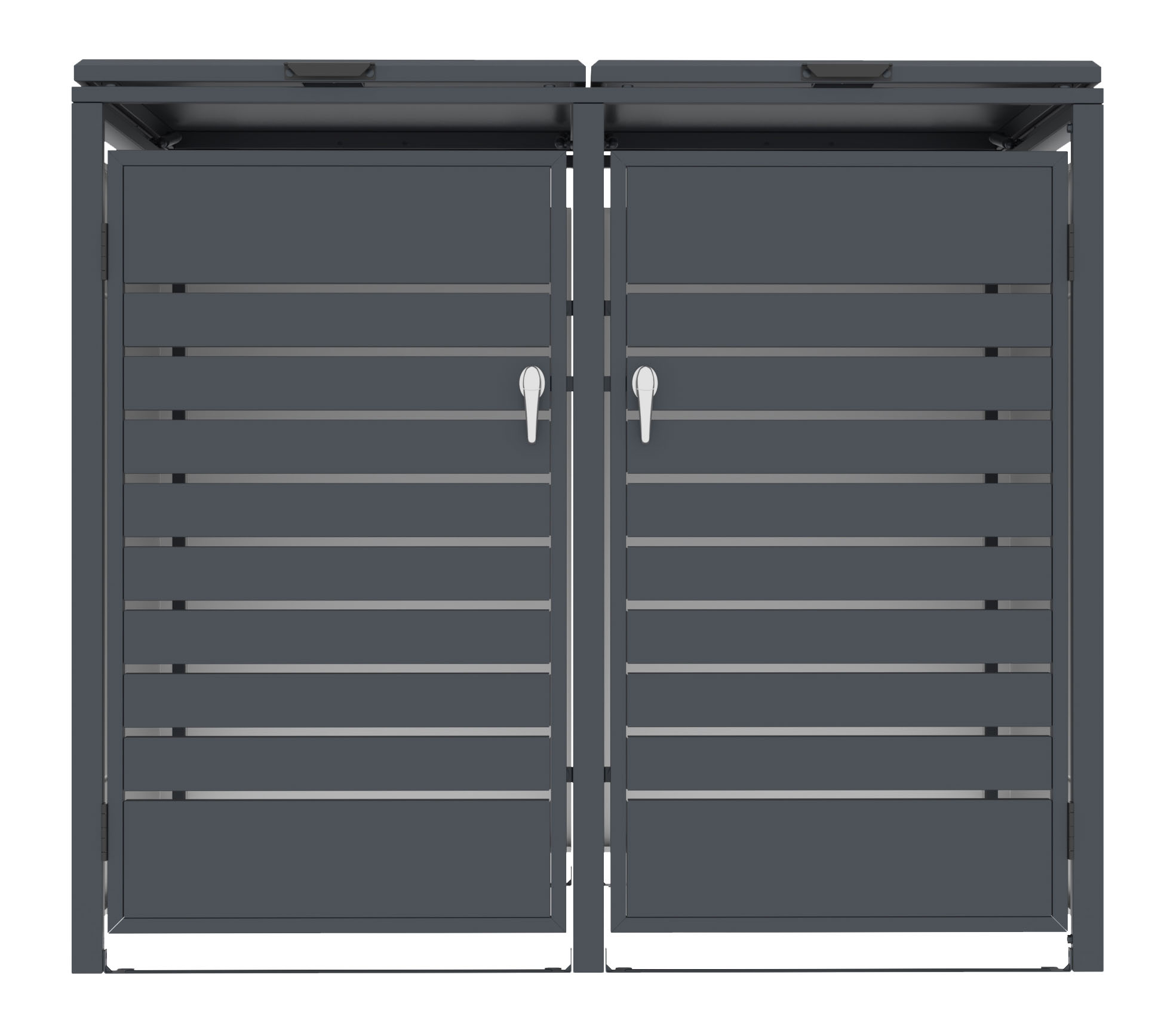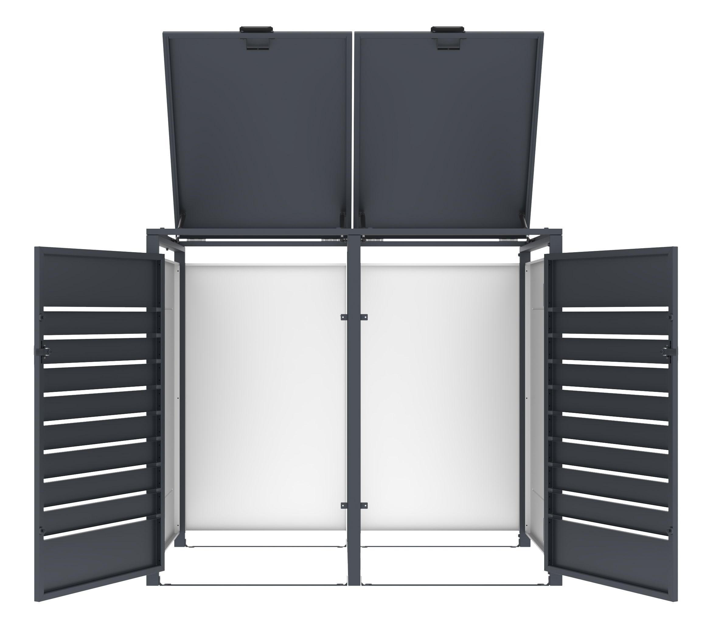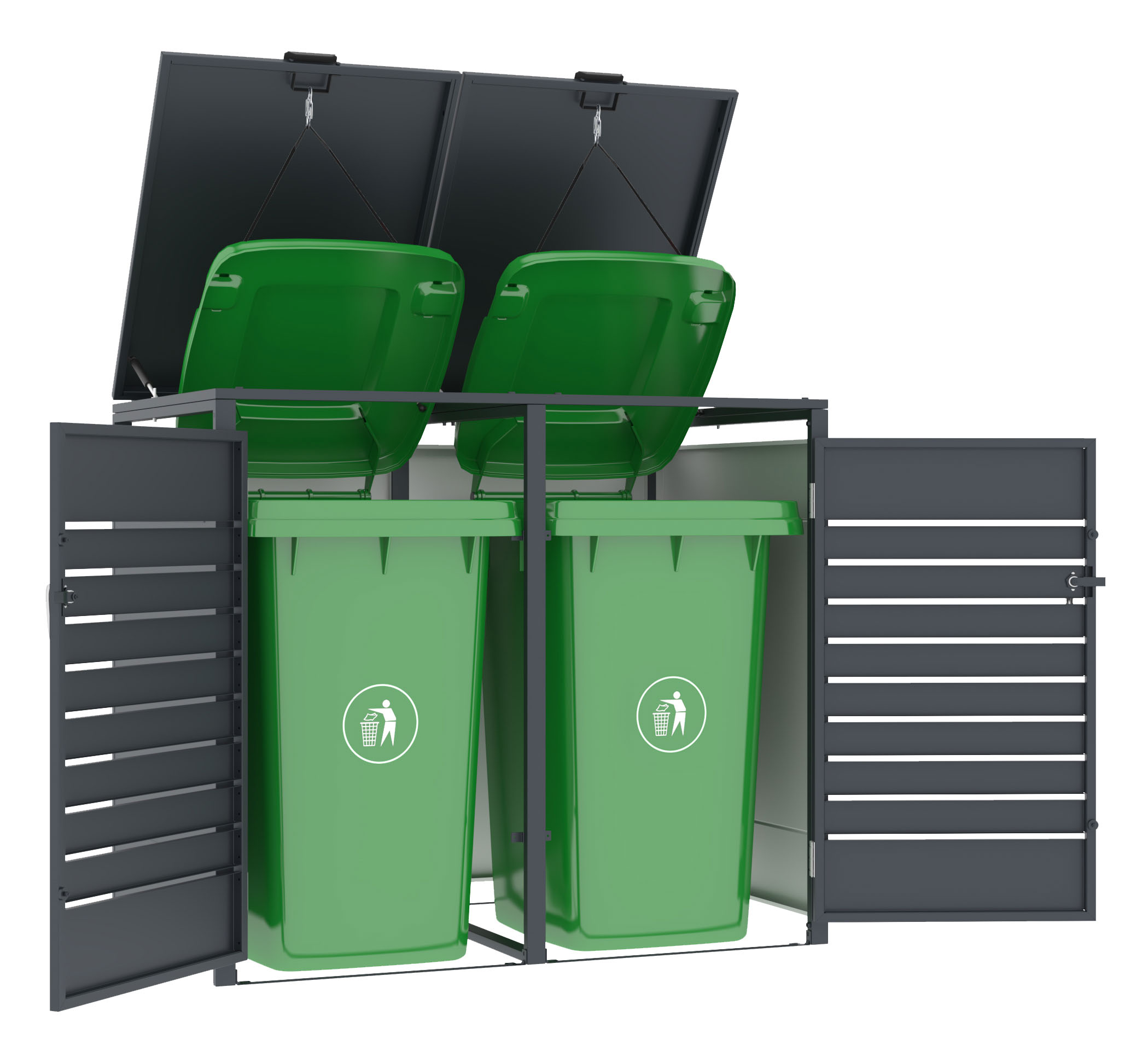 Prémiová ocel o síle 0,8 mm, plynové vzpěry, plná záda pro umístění do prostoru, určený na 2 popelnice do objemu 240 l, antracitová barva.
