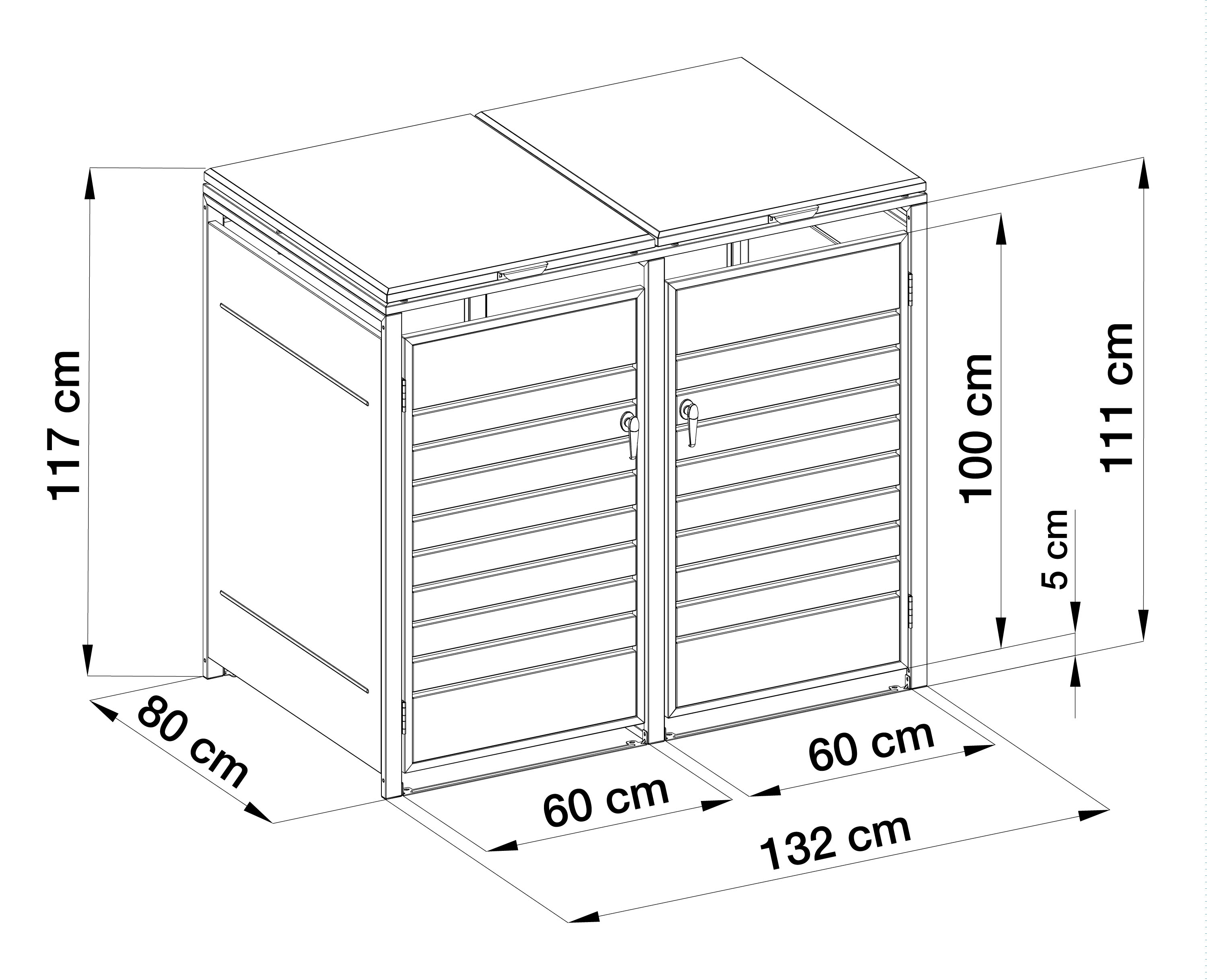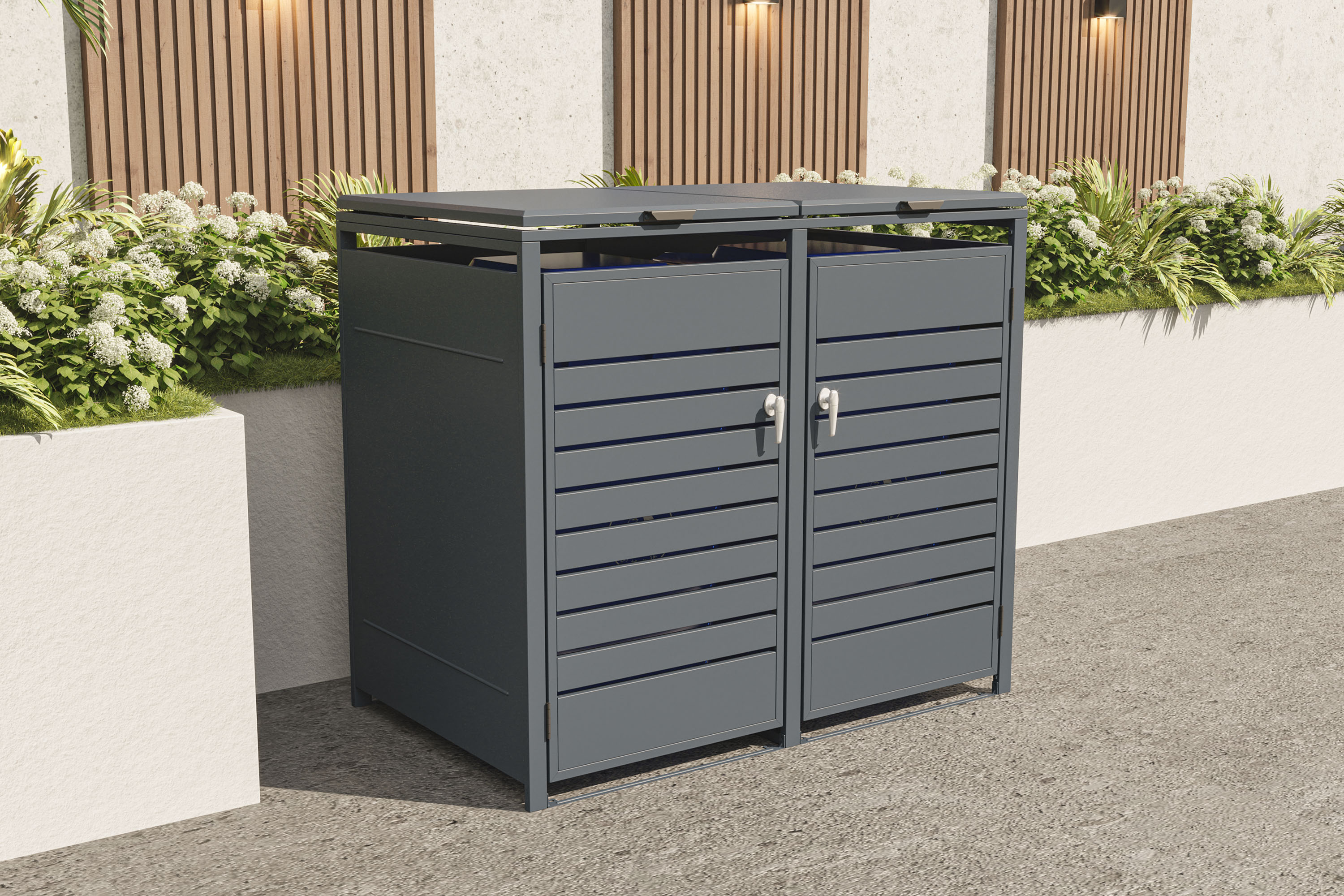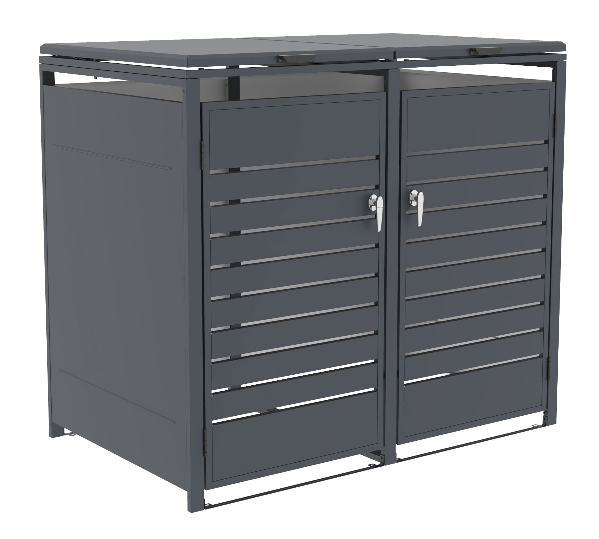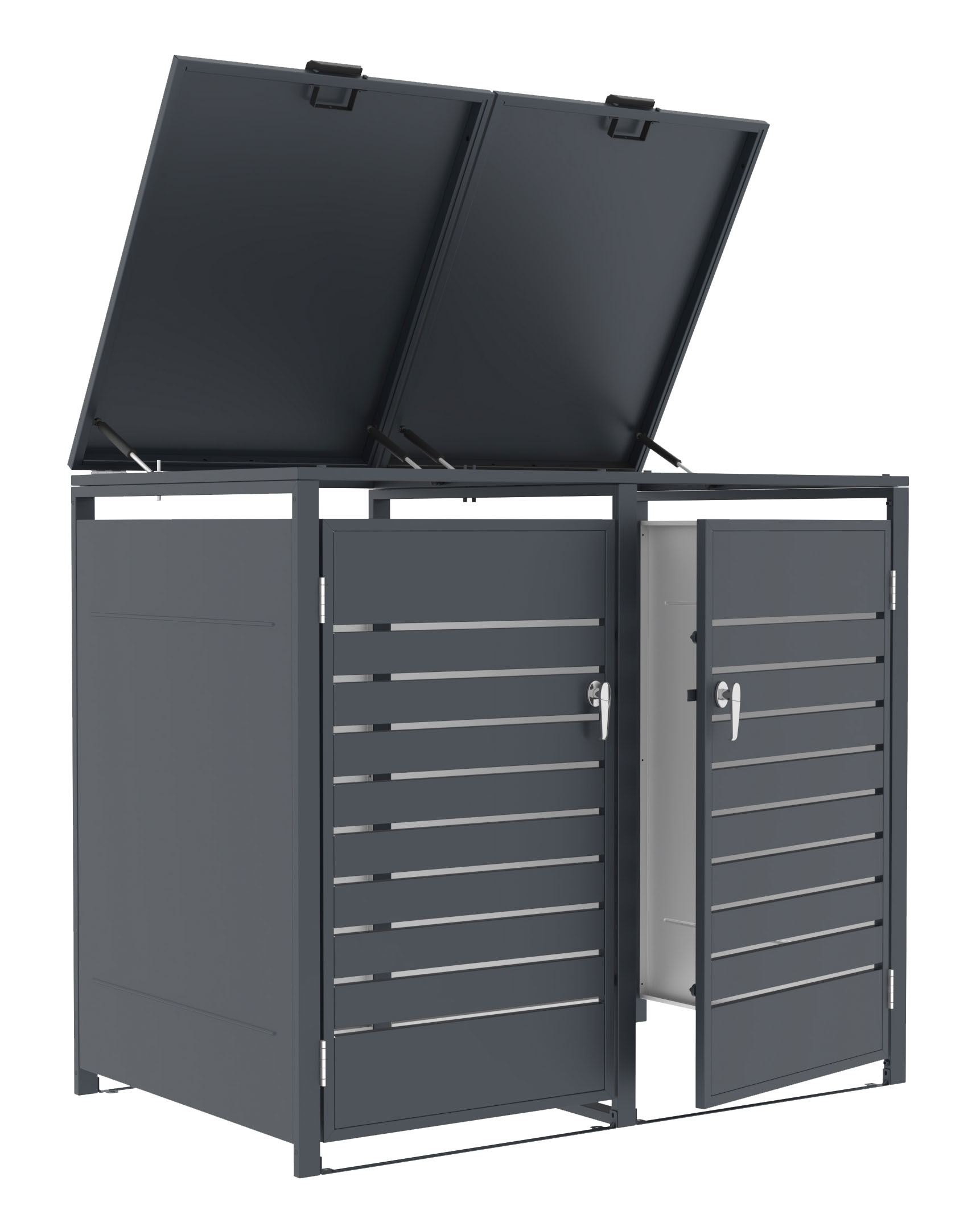Prémiová ocel o síle 0,8 mm, plynové vzpěry, plná záda pro umístění do prostoru, určený na 2 popelnice do objemu 240 l, antracitová barva.