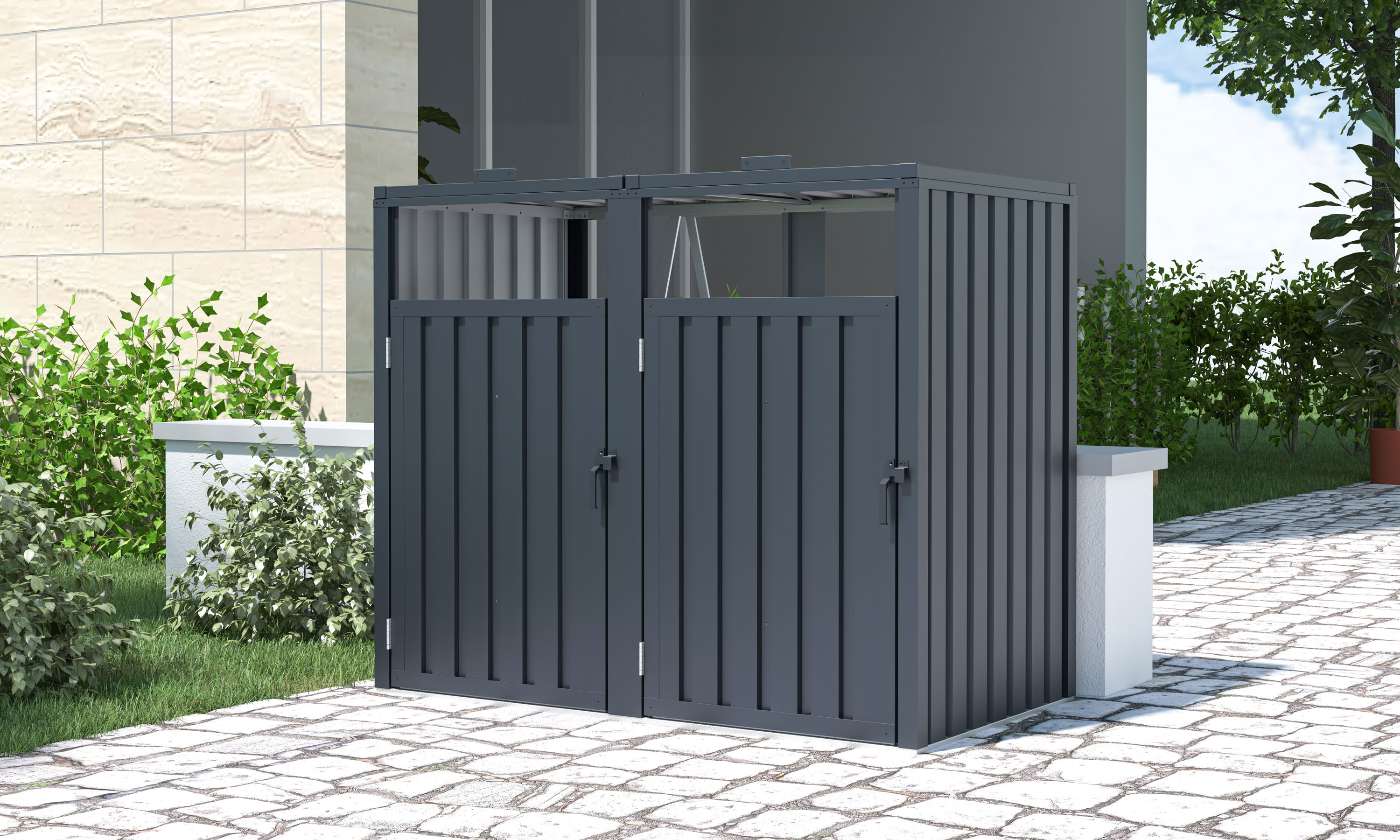 Stylový přístřešek z pozinkované oceli – pro 1 popelnici o objemu až 240 l, odolný proti povětrnostním vlivům, snadná montáž, moderní antracitový design, praktické otevírání shora i z čela, pojistka proti samovolnému otevření.