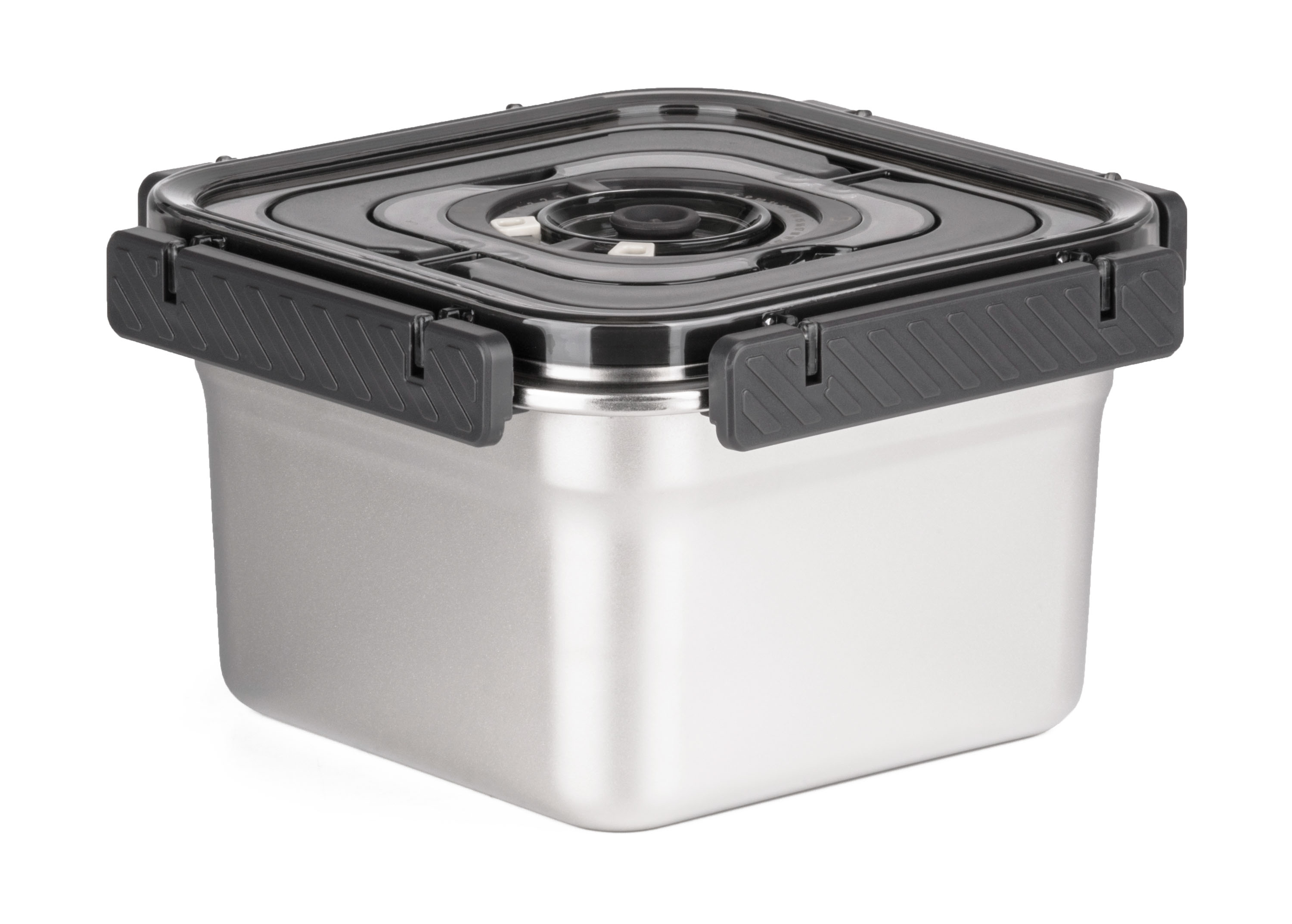 Nerezová vakuovací dóza o objemu 680 ml, víko s vakuovým ventilem, teplotní odolnost -100 až +400 °C, bezpečný hygienický nerez materiál, kompatibilní s vakuovačkami G21.