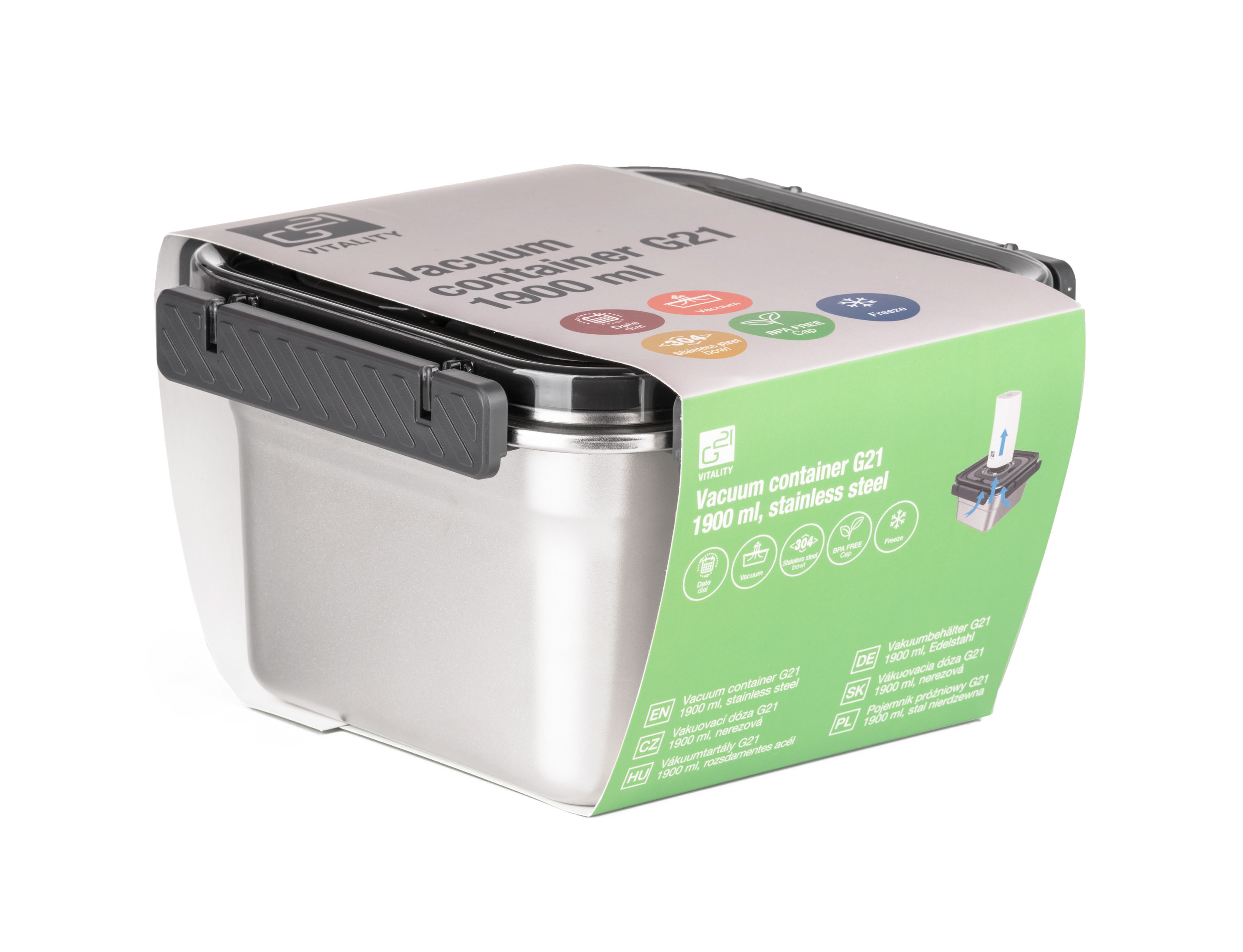 Bezpečné, odolné a hygienické skladování potravin. Nerezová vakuovací dóza G21 s objemem 1900 ml je ideální pro prodloužení čerstvosti potravin i praktické uskladnění v ledničce, mrazáku nebo pečení bez víka. Využijete ji každý den a pro každou situaci – doma i na cestách.