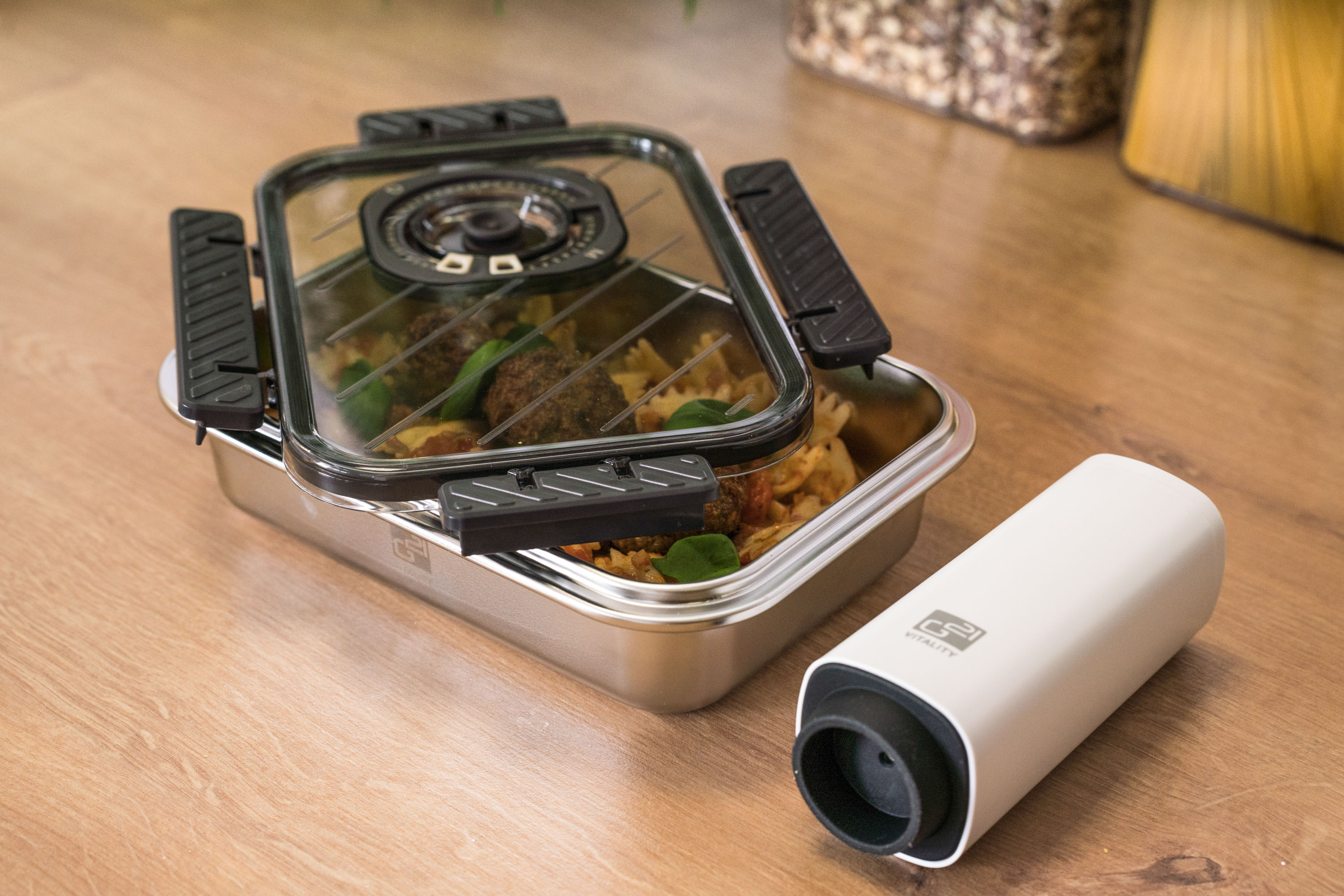 Prodloužení trvanlivosti potravin a zachování čerstvosti, vakuování, chlazení i mražení, skleněné borosilikátové tělo, víko BPA Free, nastavení data, teplotní odolnost dózy -20 až + 400 °C.