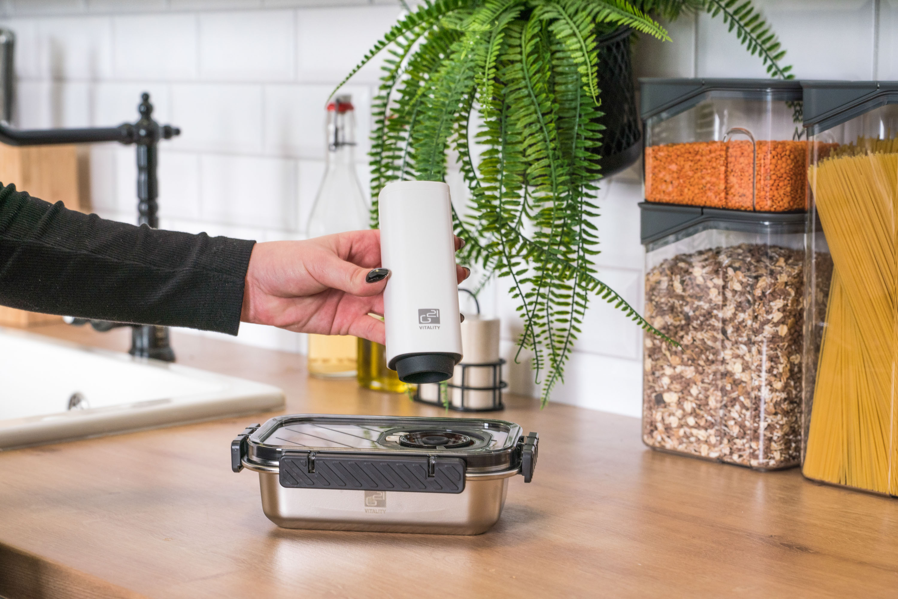 Víko z BPA Free plastu je vybavené vakuovacím ventilem a praktickým nastavitelným ukazatelem data. Budete tak vědět, kdy byly potraviny vakuovány nebo do kdy se mají spotřebovat. Pro uvolnění vakua a otevření dózy stačí jemně zmáčknout ventil uprostřed víka.