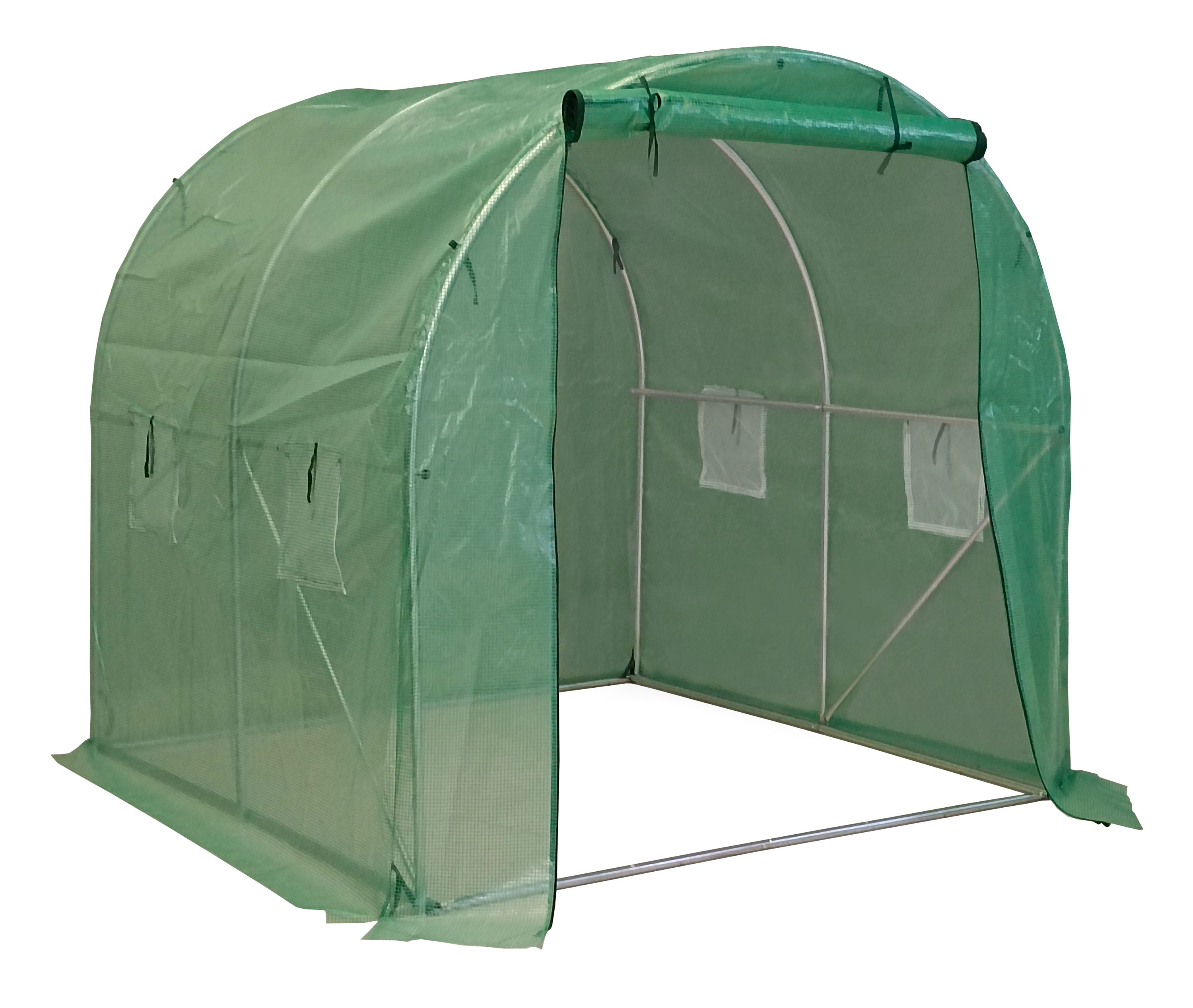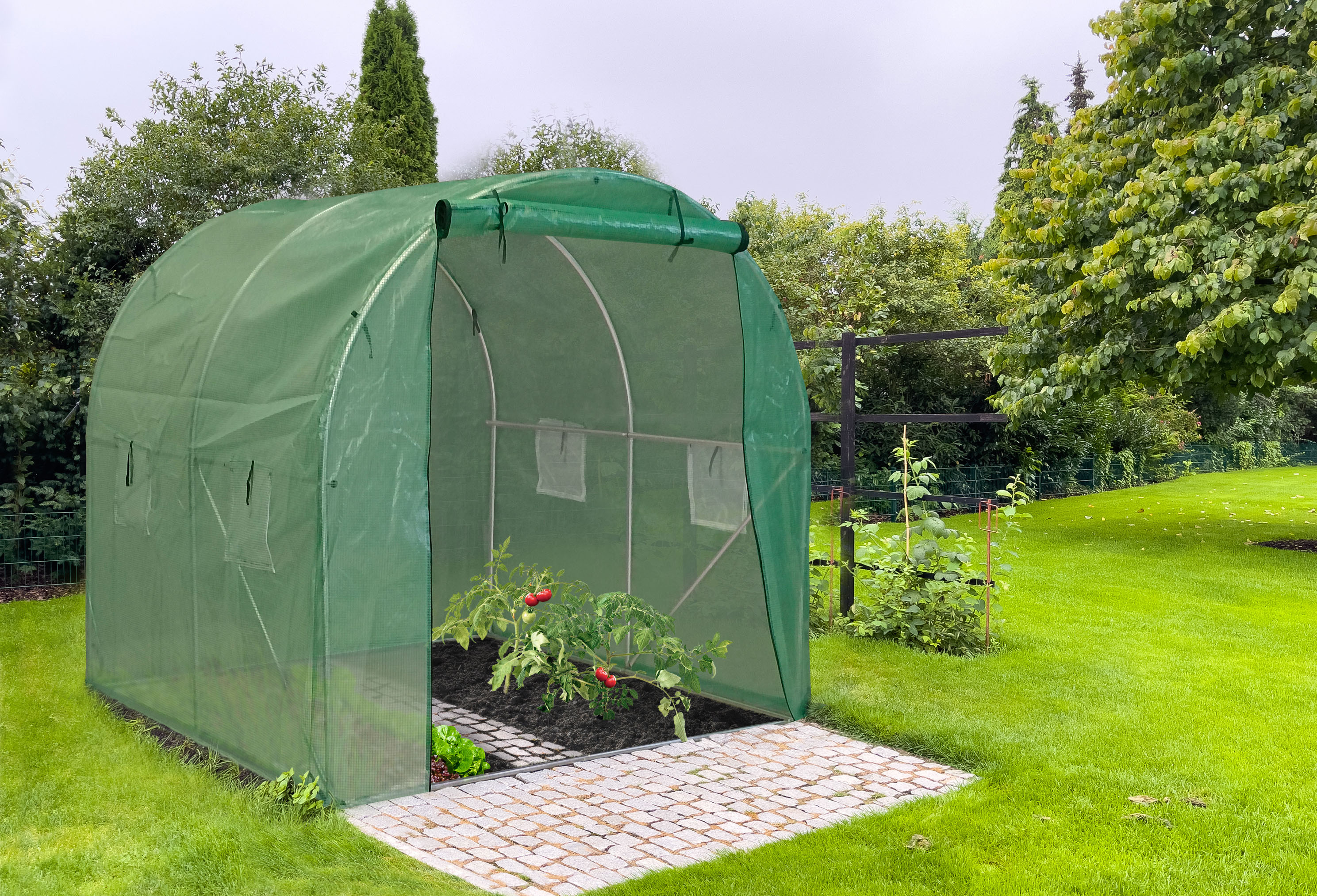 Zahradní fóliovník se stabilní ocelovou pozinkovanou konstrukcí, kvalitní zesílená polyethylenová (PE) fólie, čelní stěna se vstupním otvorem o šířce 120 cm, 4 větrací okna, 4 kotvicí lanka a kolíky, rolovací vchod na zip.