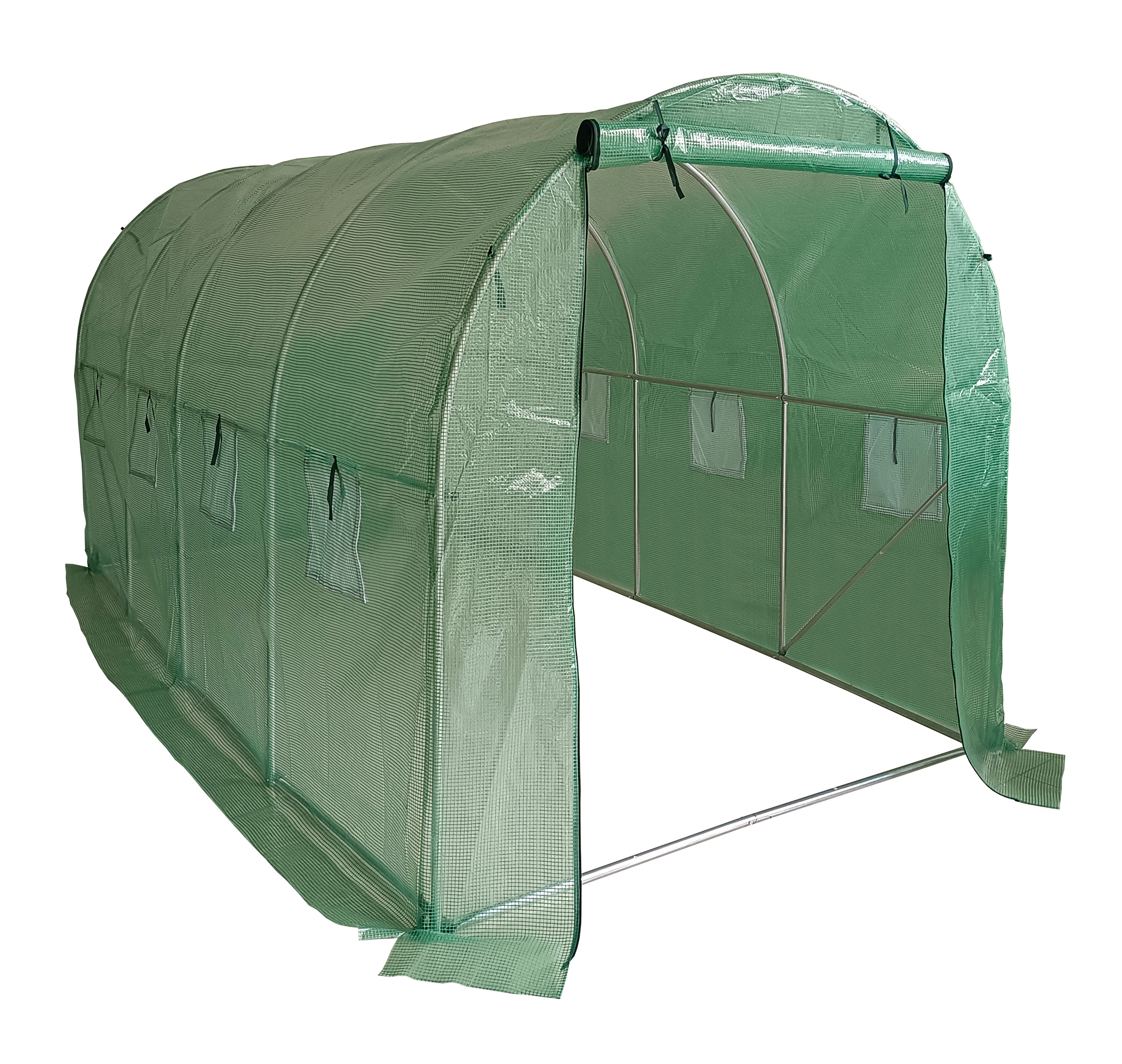 Zahradní fóliovník se stabilní ocelovou pozinkovanou konstrukcí, kvalitní zesílená polyethylenová (PE) fólie, čelní stěna se vstupním otvorem o šířce 120 cm, 8 větracích oken, 4 kotvicí lanka a kolíky, rolovací vchod na zip.