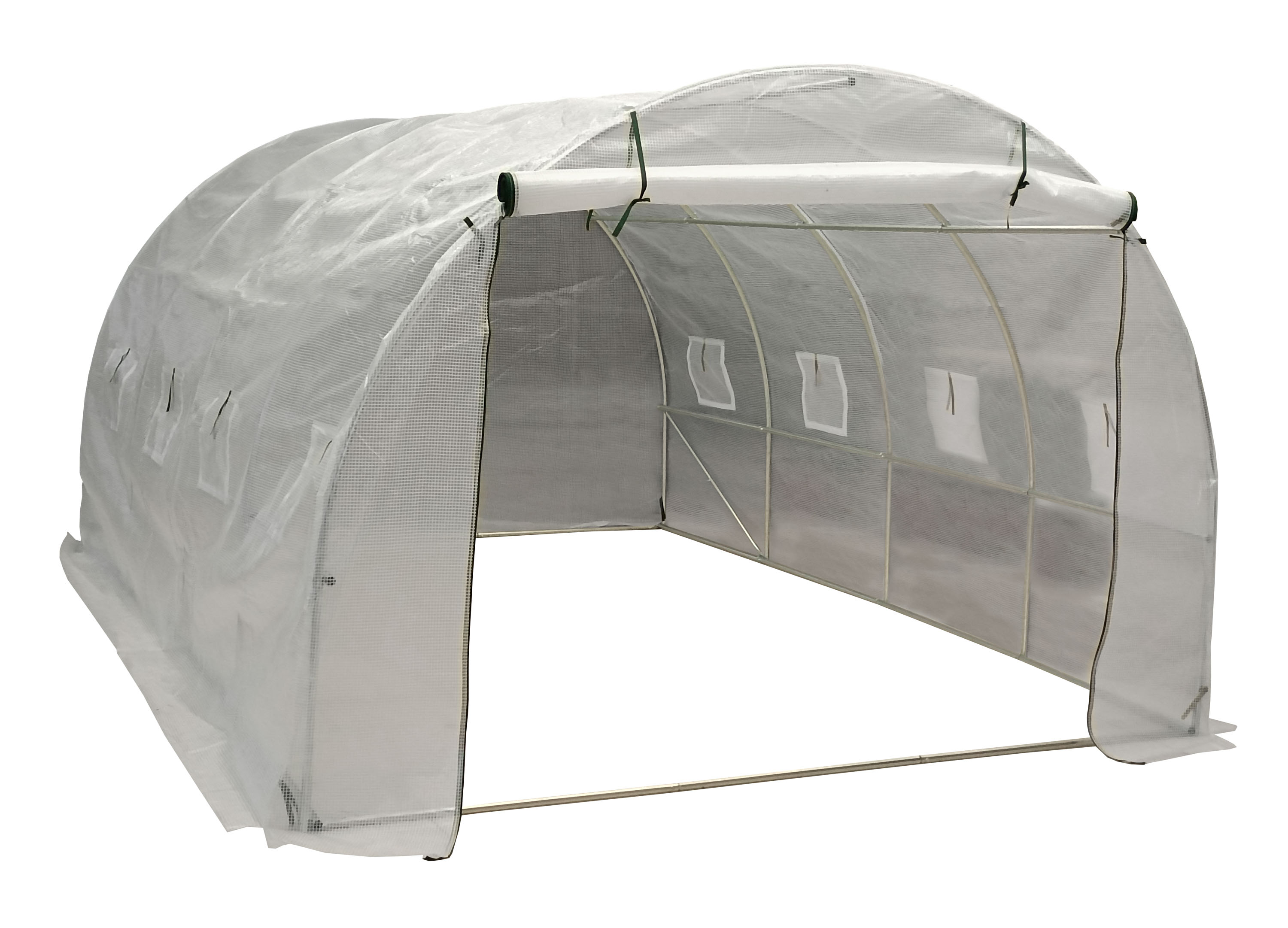 Zahradní fóliovník se stabilní ocelovou pozinkovanou konstrukcí, kvalitní zesílená polyethylenová (PE) fólie, čelní stěna se vstupním otvorem o šířce 200 cm, 8 větracích oken, 4 kotvicí lanka a kolíky, rolovací vchod na zip.