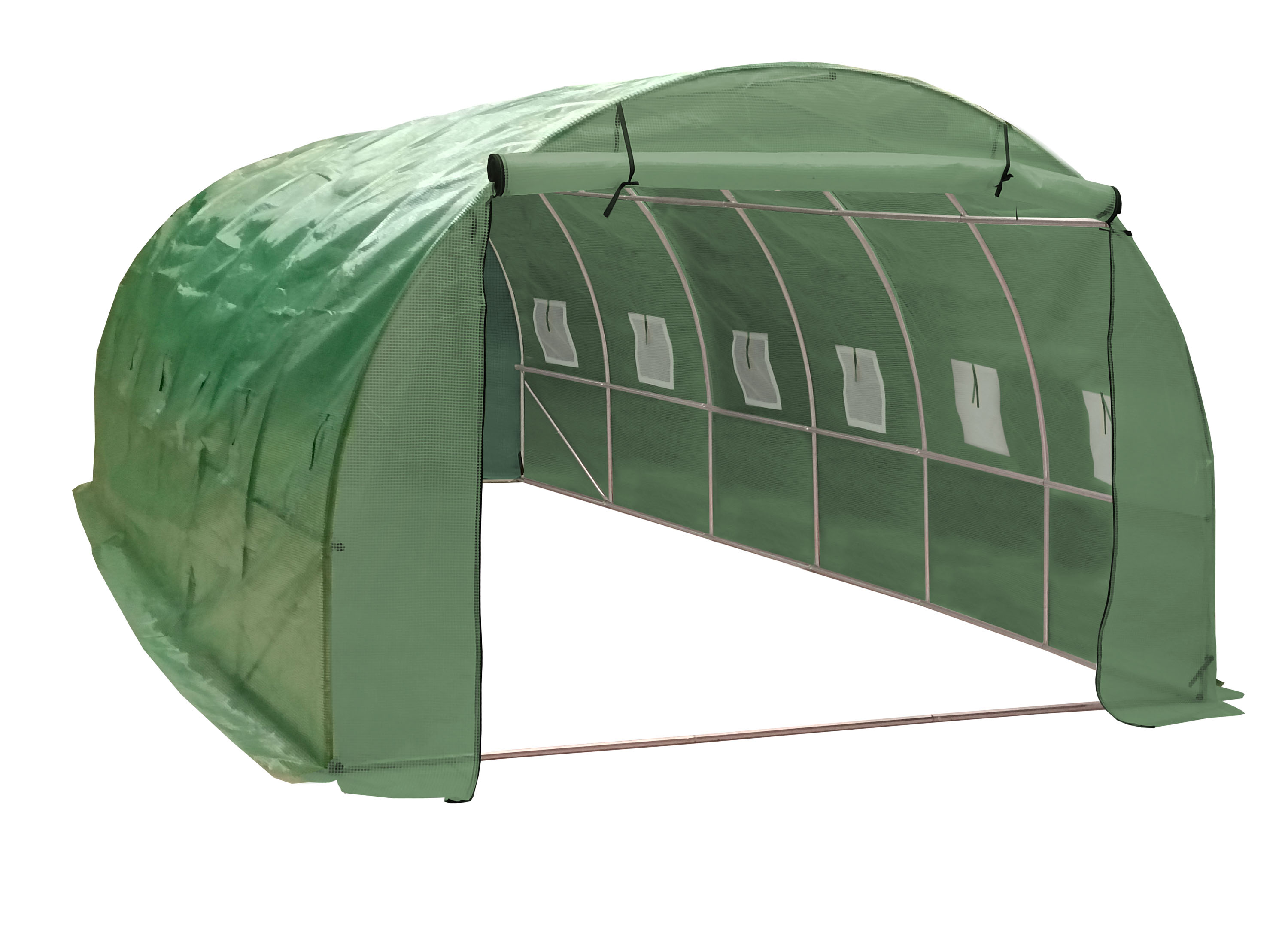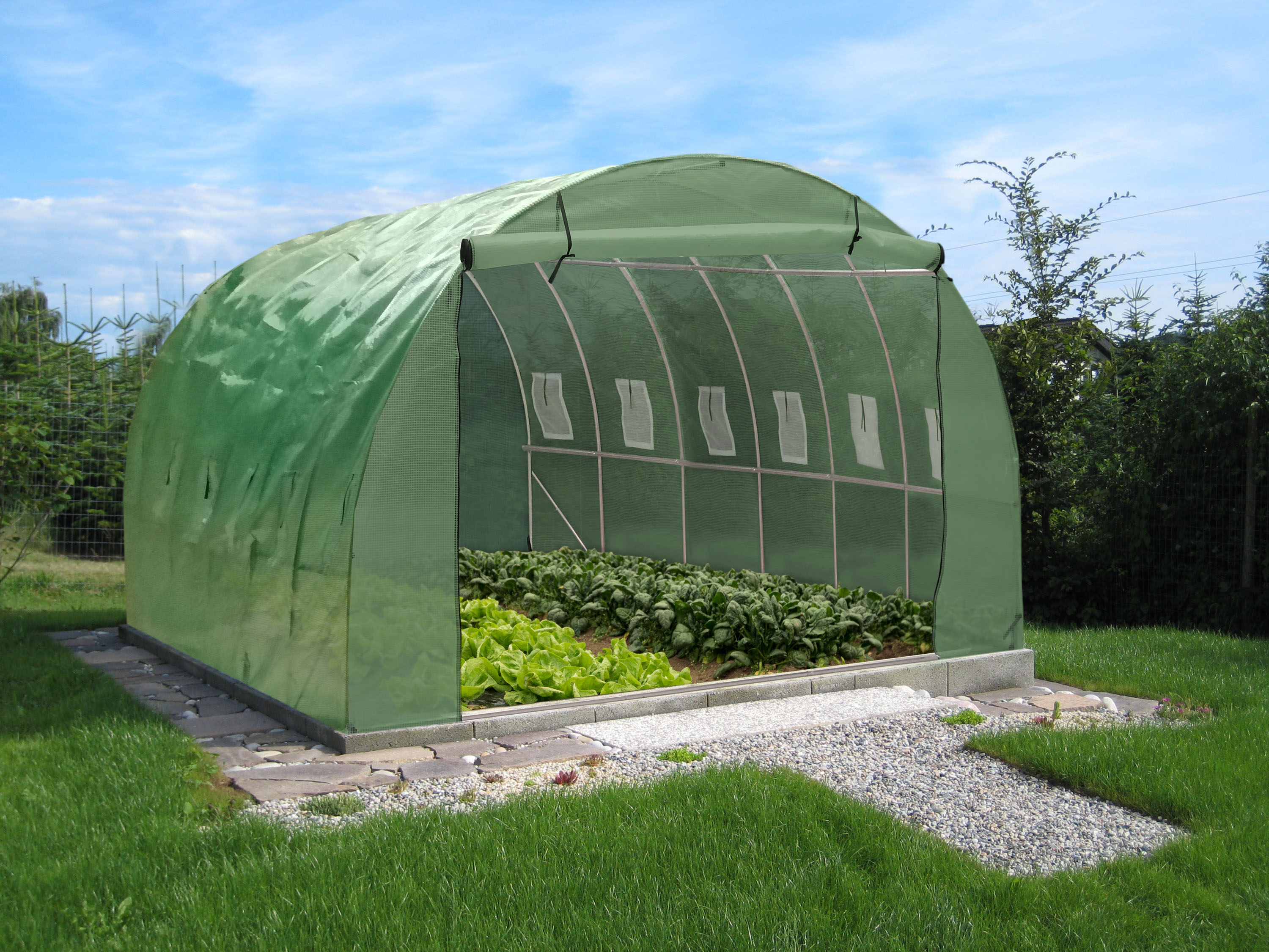 Zahradní fóliovník se stabilní ocelovou pozinkovanou konstrukcí, kvalitní zesílená polyethylenová (PE) fólie, čelní stěna se vstupním otvorem o šířce 200 cm, 12 větracích oken, 4 kotvicí lanka a kolíky, rolovací vchod na zip.