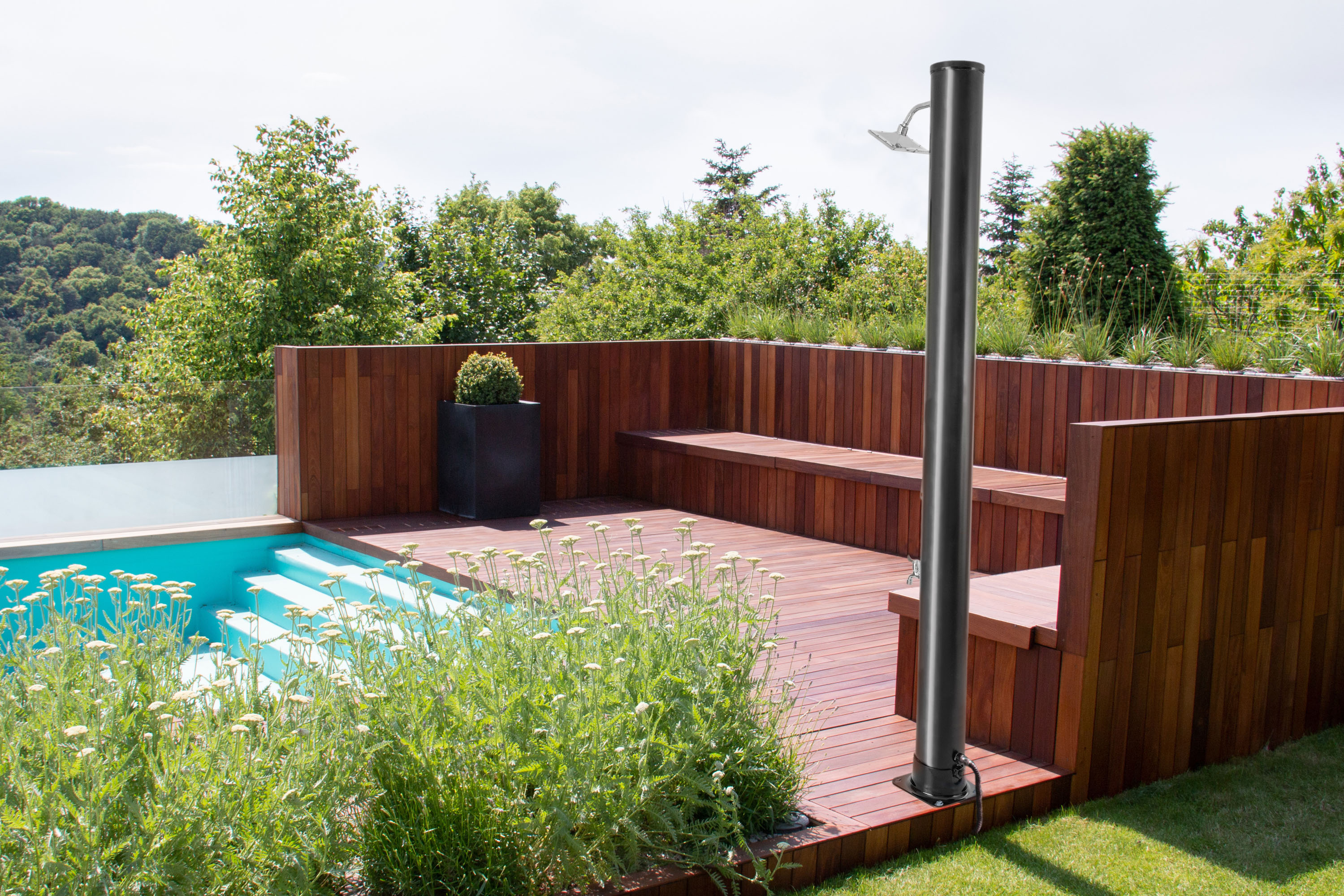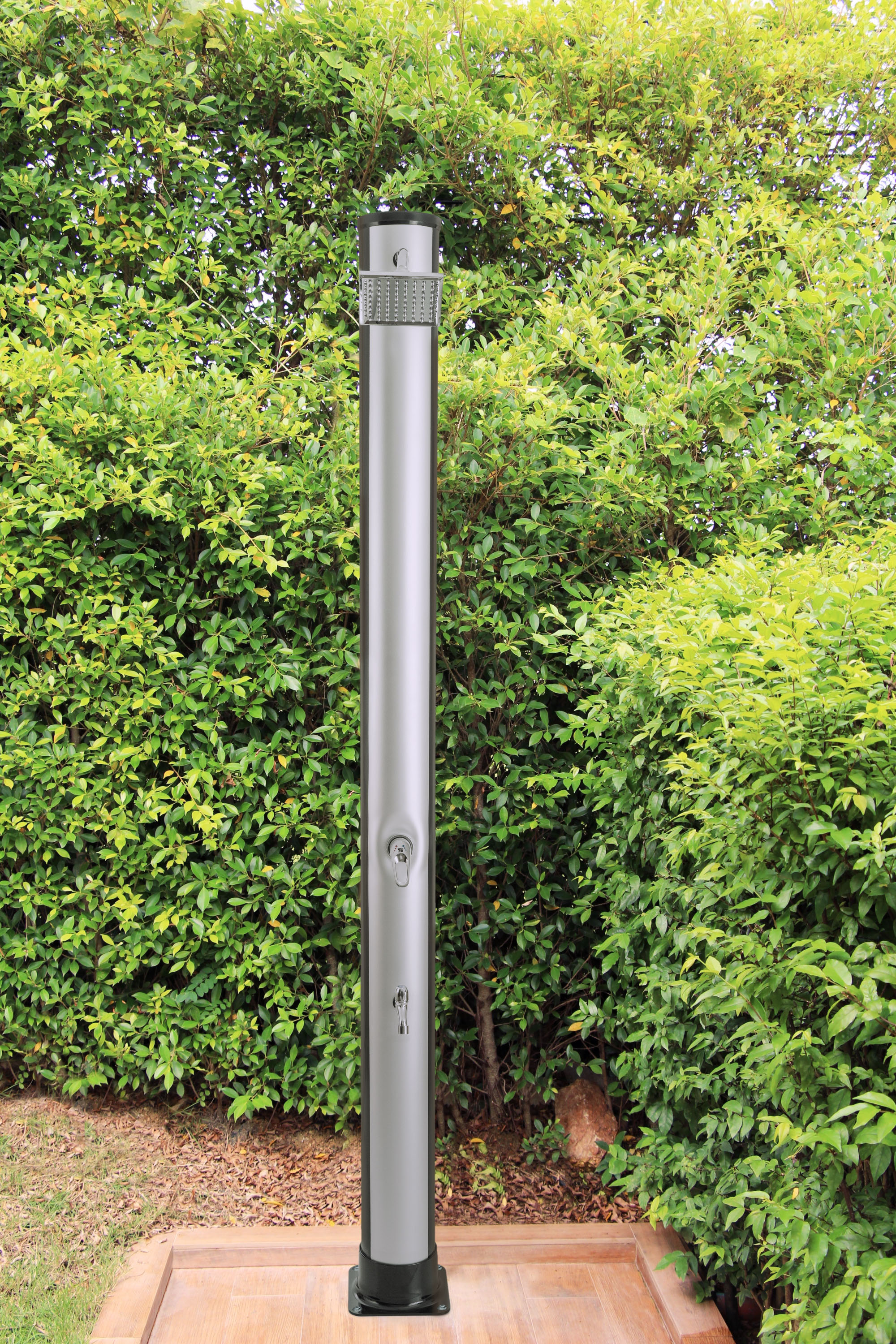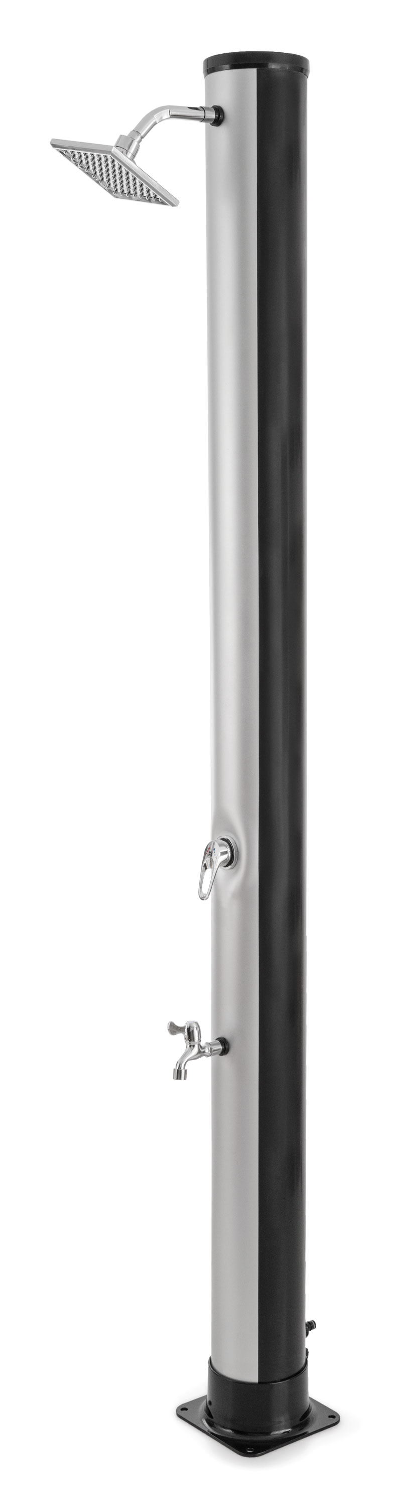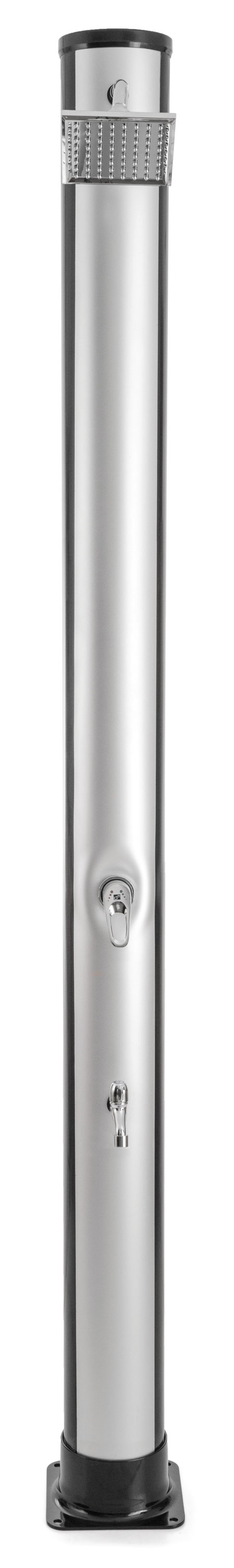 Tělo sprchy v elegantní černo-stříbrné barvě slouží zároveň jako solární kolektor - absorbuje sluneční paprsky a ohřívá vodu bez potřeby elektřiny či plynu. Když si dopřejete sprchu před plaváním, ochráníte vodu v bazénu před zbytečným znečištěním. Tím si výrazně usnadníte jeho údržbu.