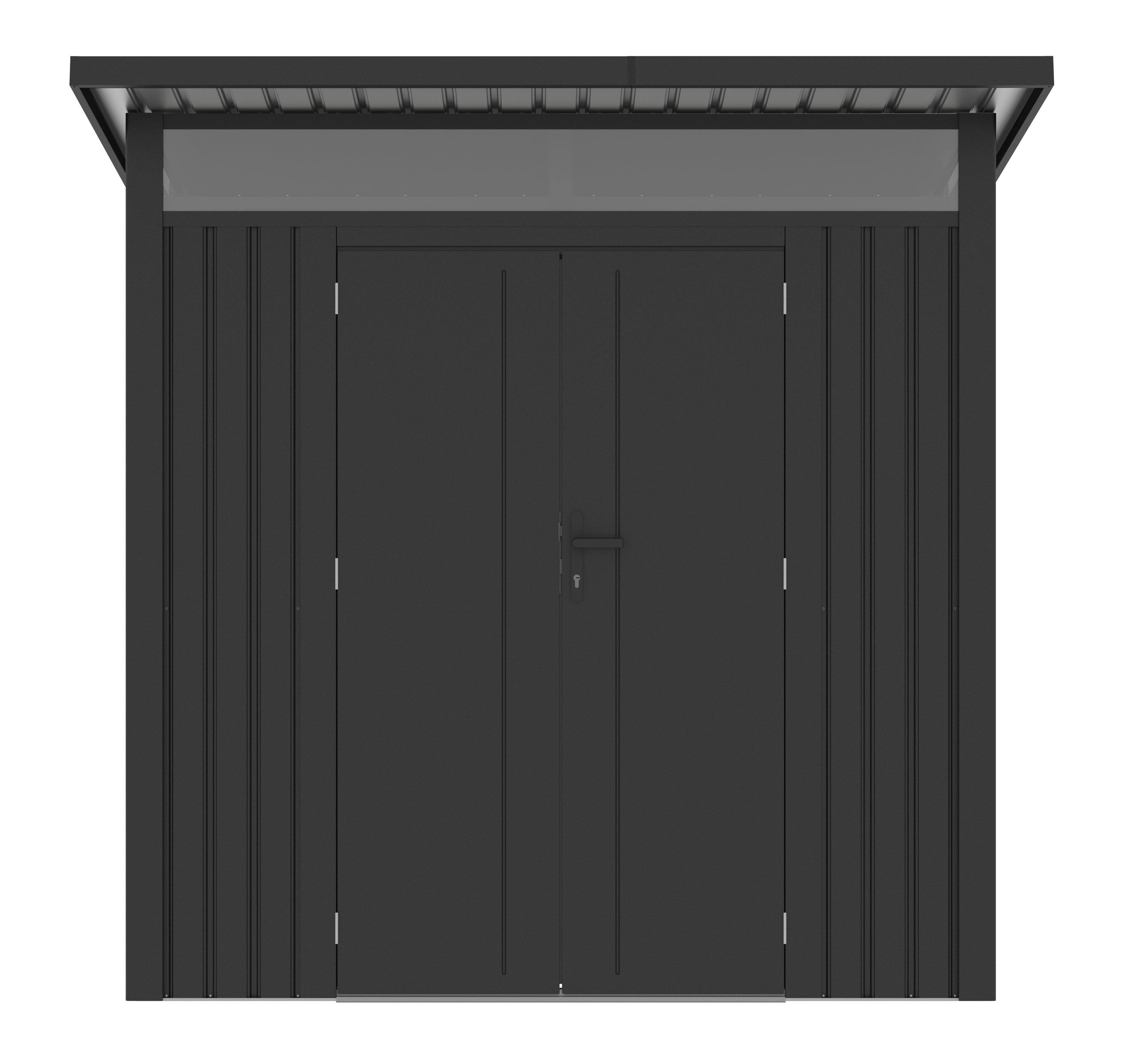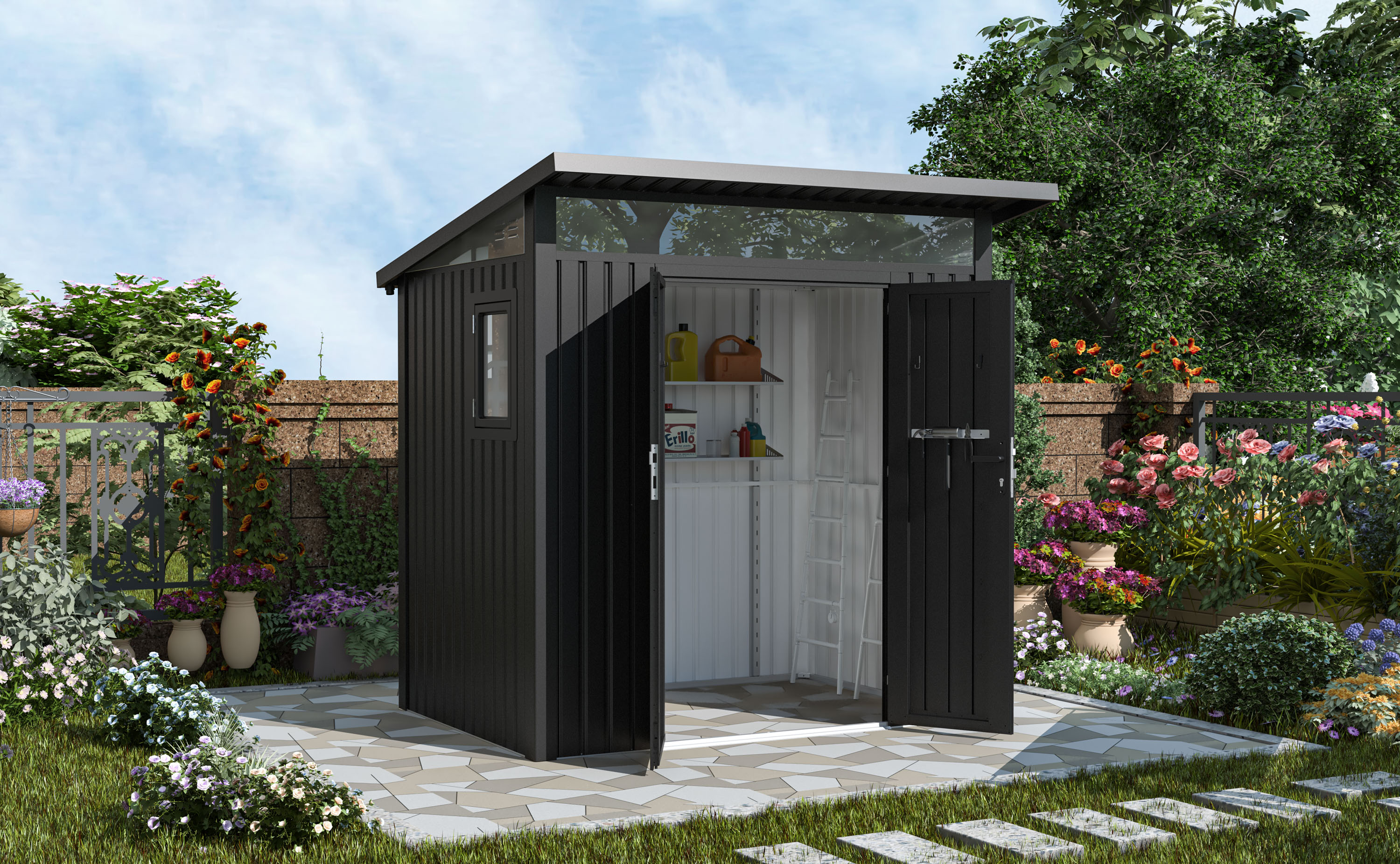 Komfort užívání podtrhují dvojstěnné dveře s nadstandardní průchozí výškou 178 cm, díky které projdete vzpřímeně i s rozměrným nákladem. Dveře jsou osazeny klasickou klikou a zámkem, který je součástí balení, takže vaše věci zůstanou v bezpečí. Praktickým bonusem je střecha s integrovanými okapy, ke kterým můžete snadno napojit odtokovou hadici a zachytávat dešťovou vodu do sudu pro další využití, třeba na zalévání zahrádky.