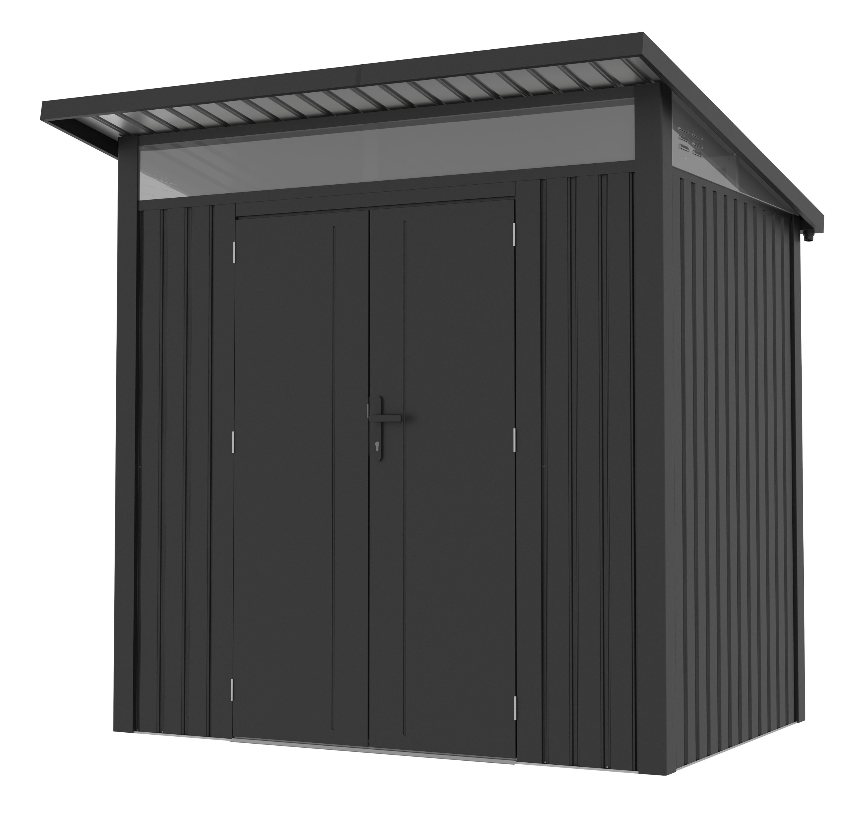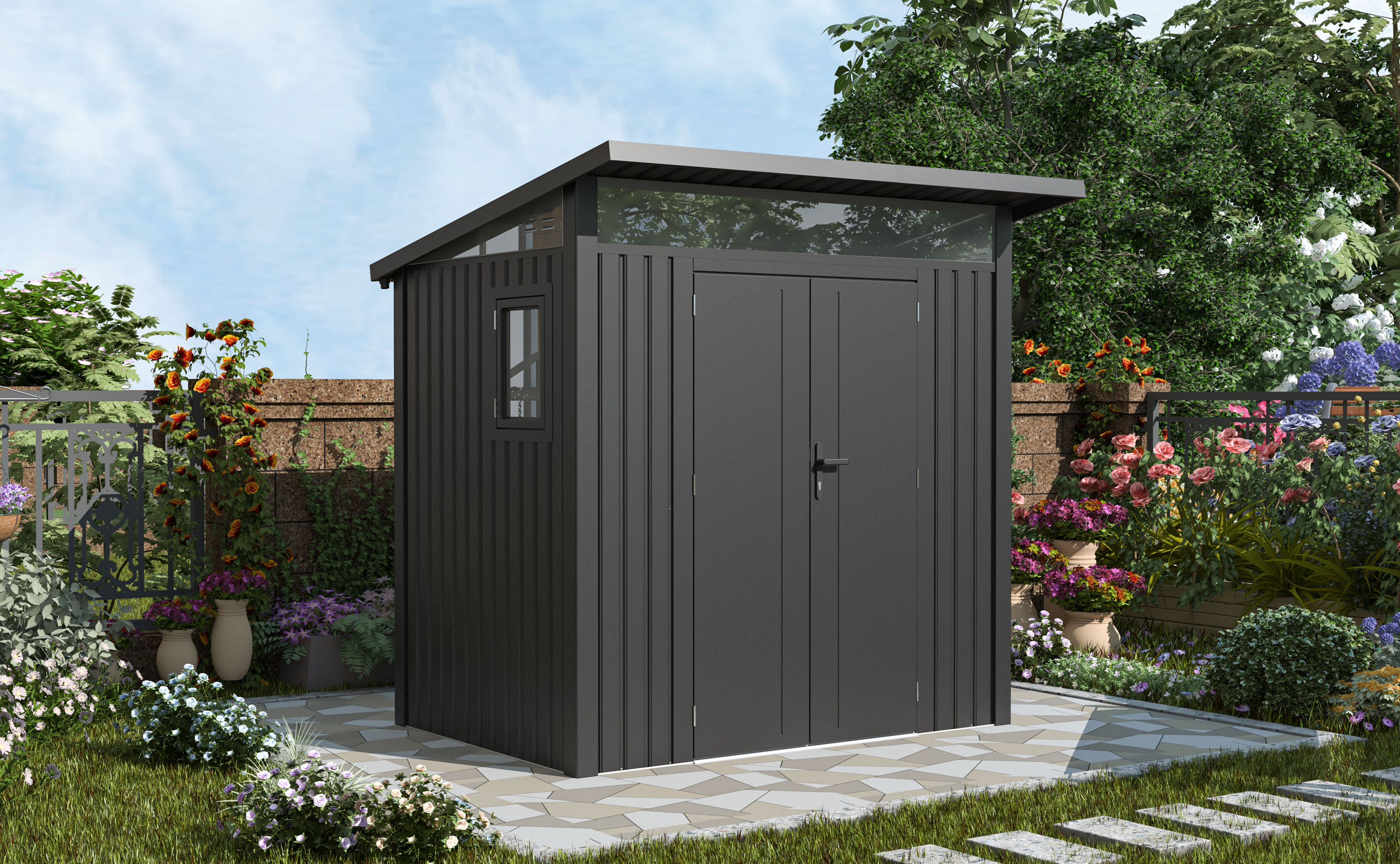 Plechový zahradní domek se sílou stěny 0,4 mm, průchozí výška je 178 cm. Polykarbonátové světlíky, otevíratelné okno, střecha s okapy, břidlicová barva.