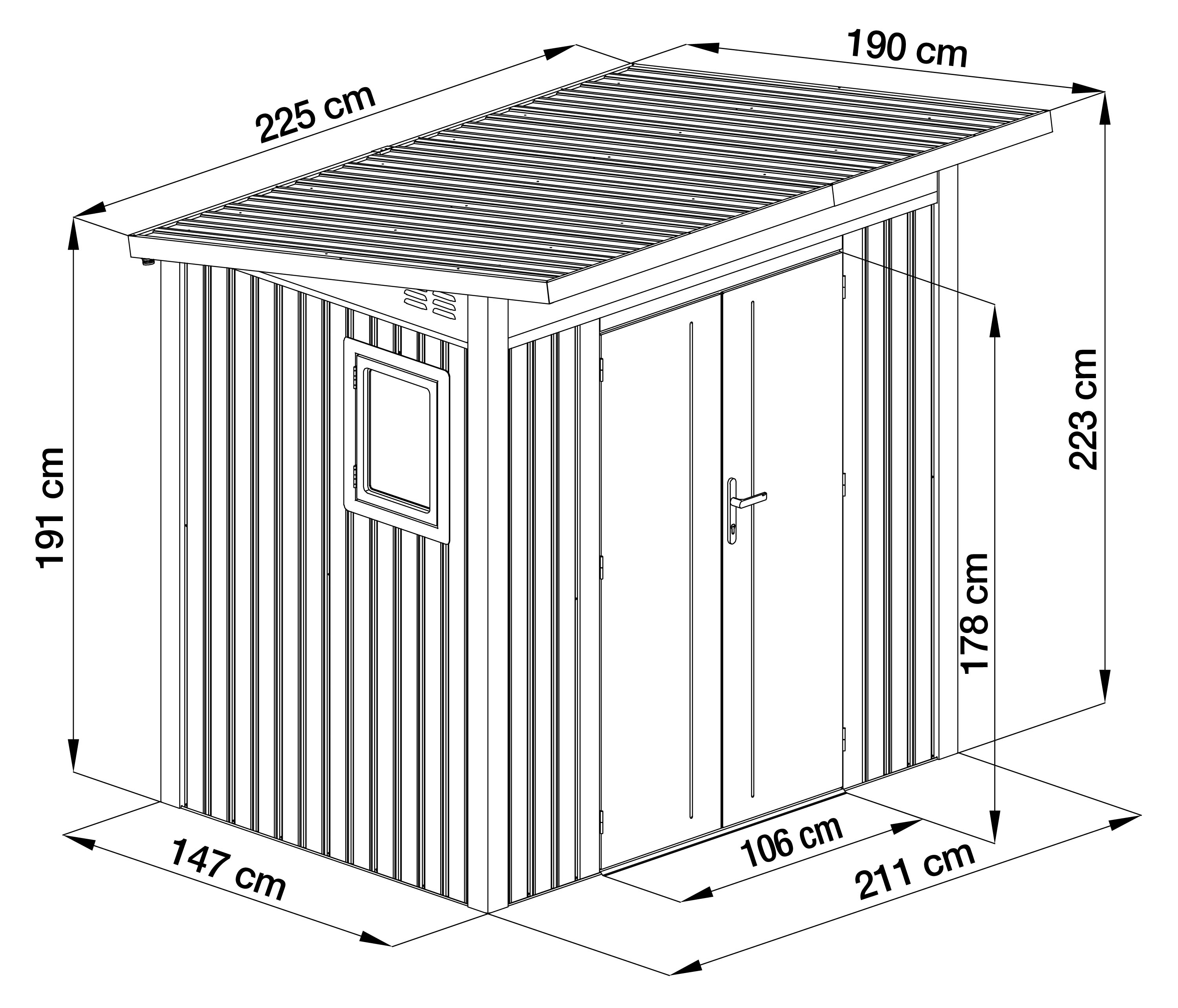 Plechový zahradní domek se sílou stěny 0,4 mm, průchozí výška je 178 cm. Polykarbonátové světlíky, otevíratelné okno, střecha s okapy, stříbrná barva.