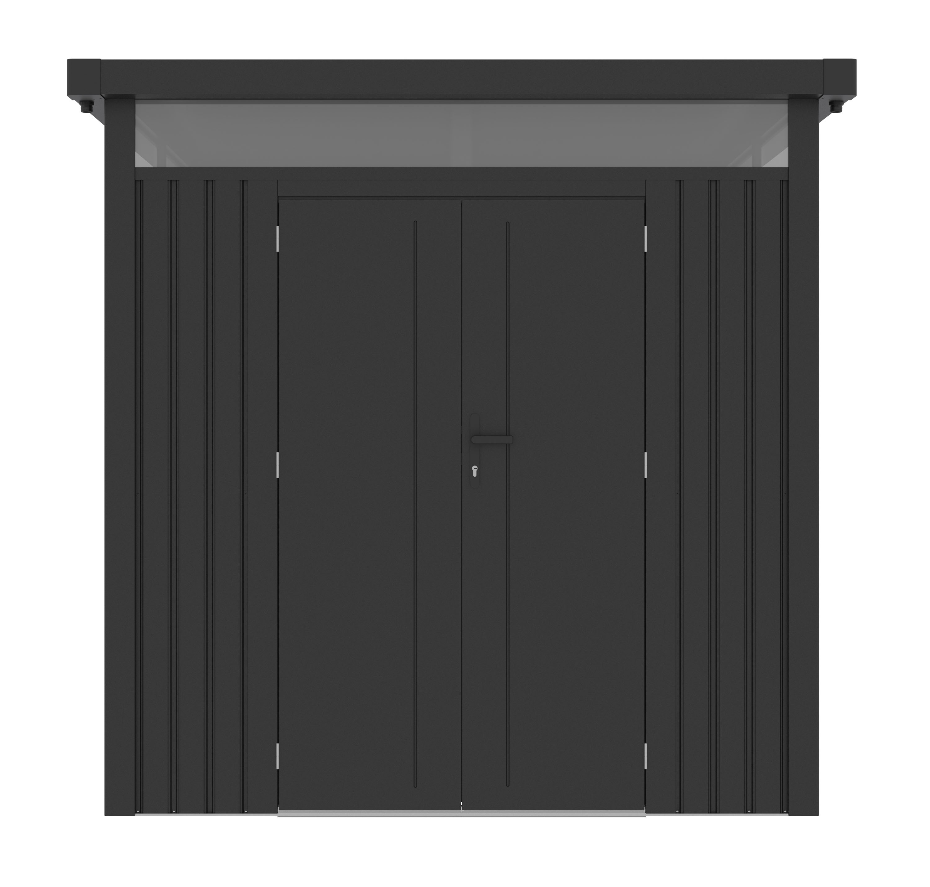 Komfort užívání podtrhují dvojstěnné dveře s nadstandardní průchozí výškou 178 cm, díky které projdete vzpřímeně i s rozměrným nákladem. Dveře jsou osazeny klasickou klikou a zámkem, který je součástí balení, takže vaše věci zůstanou v bezpečí. Praktickým bonusem je střecha s integrovanými okapy, ke kterým můžete snadno napojit odtokovou hadici a zachytávat dešťovou vodu do sudu pro další využití, třeba na zalévání zahrádky.