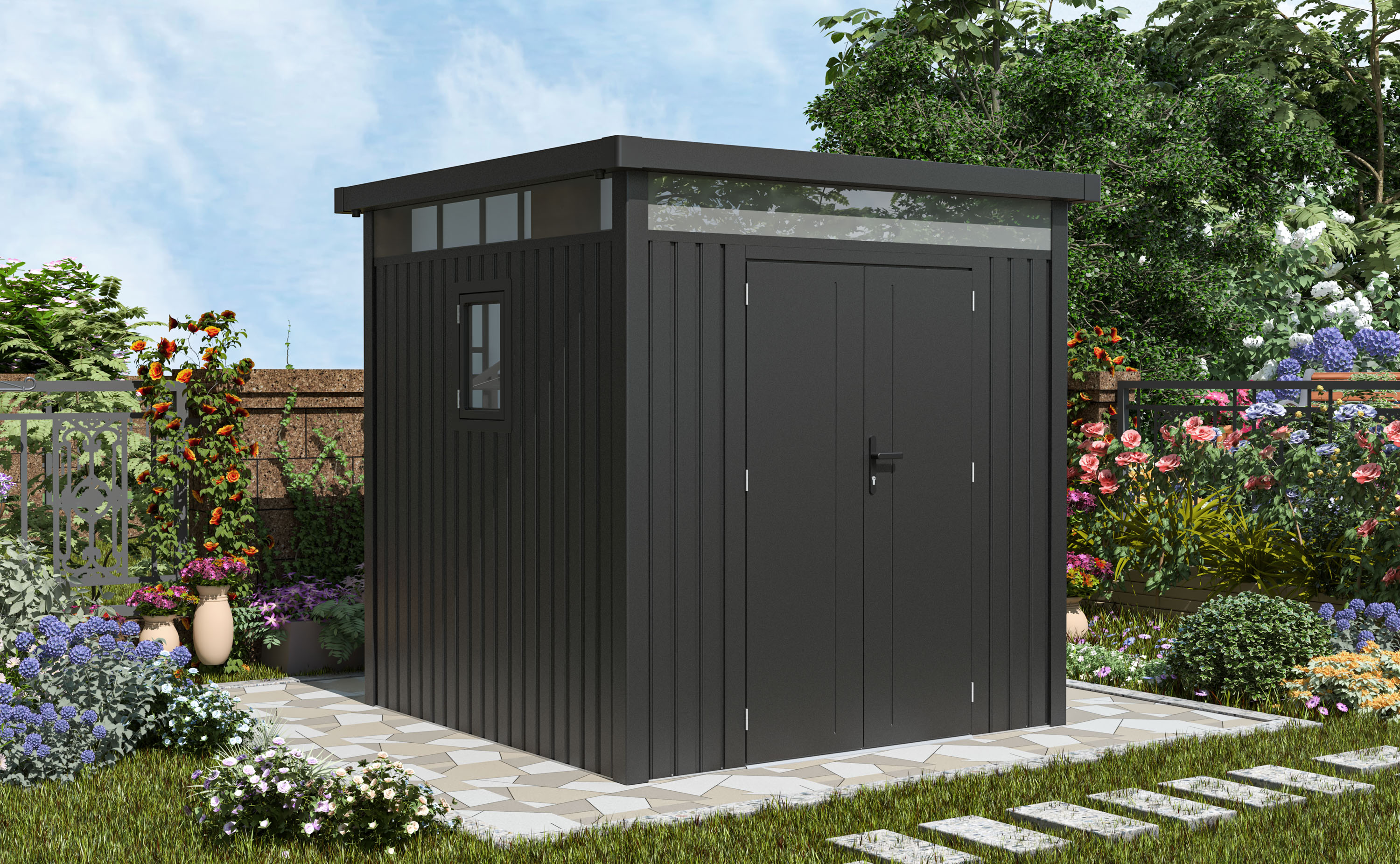 Plechový zahradní domek se sílou stěny 0,4 mm, průchozí výška je 178 cm. Polykarbonátové světlíky, otevíratelné okno, střecha s okapy, břidlicová barva.