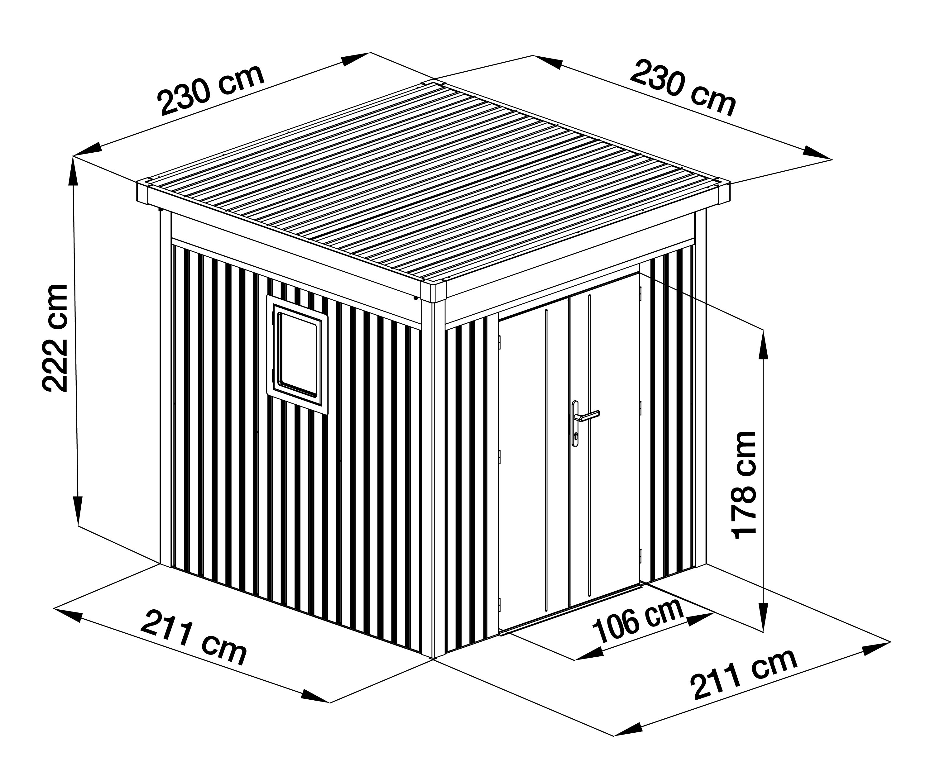 Plechový zahradní domek se sílou stěny 0,4 mm, průchozí výška je 178 cm. Polykarbonátové světlíky, otevíratelné okno, střecha s okapy, stříbrná barva.