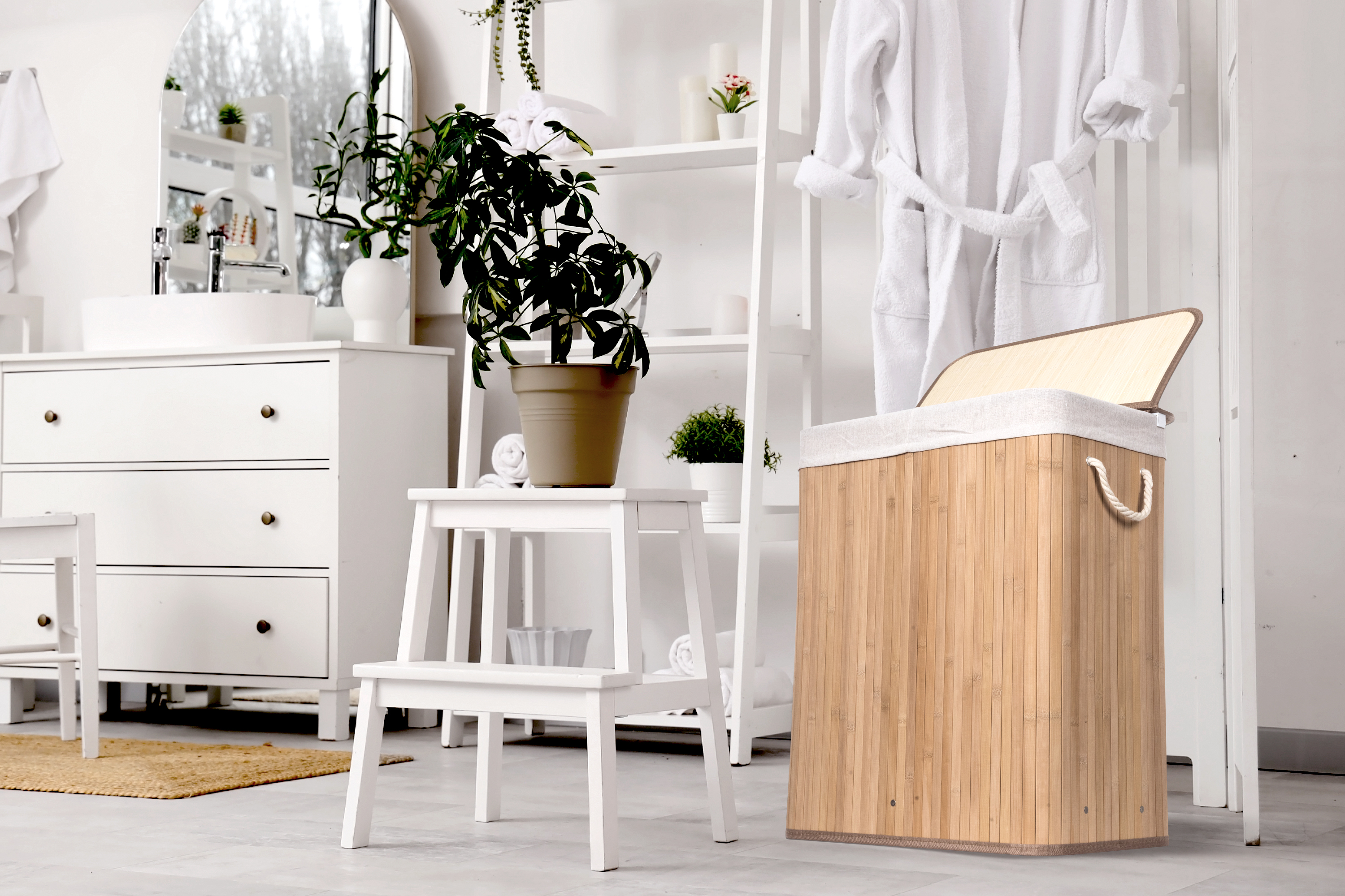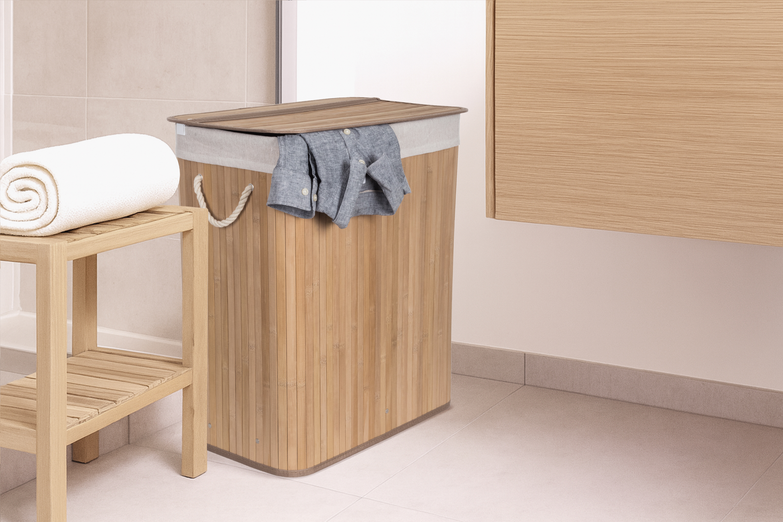 Jak vybrat nejlepší koš na špinavé prádlo? Co se materiálu koše týče, doporučujeme jednoznačně bambus. Je odolný vůči vlhkosti, takže jej můžete bez obav umístit do koupelny nebo servisní místnosti s pračkou. Zároveň je i vizuálně velmi příjemný – kombinace přírodního materiálu a barevně sladěné vložce a držadlům evokuje pocit čistoty, navíc se i hodí k jakémukoliv interiéru.