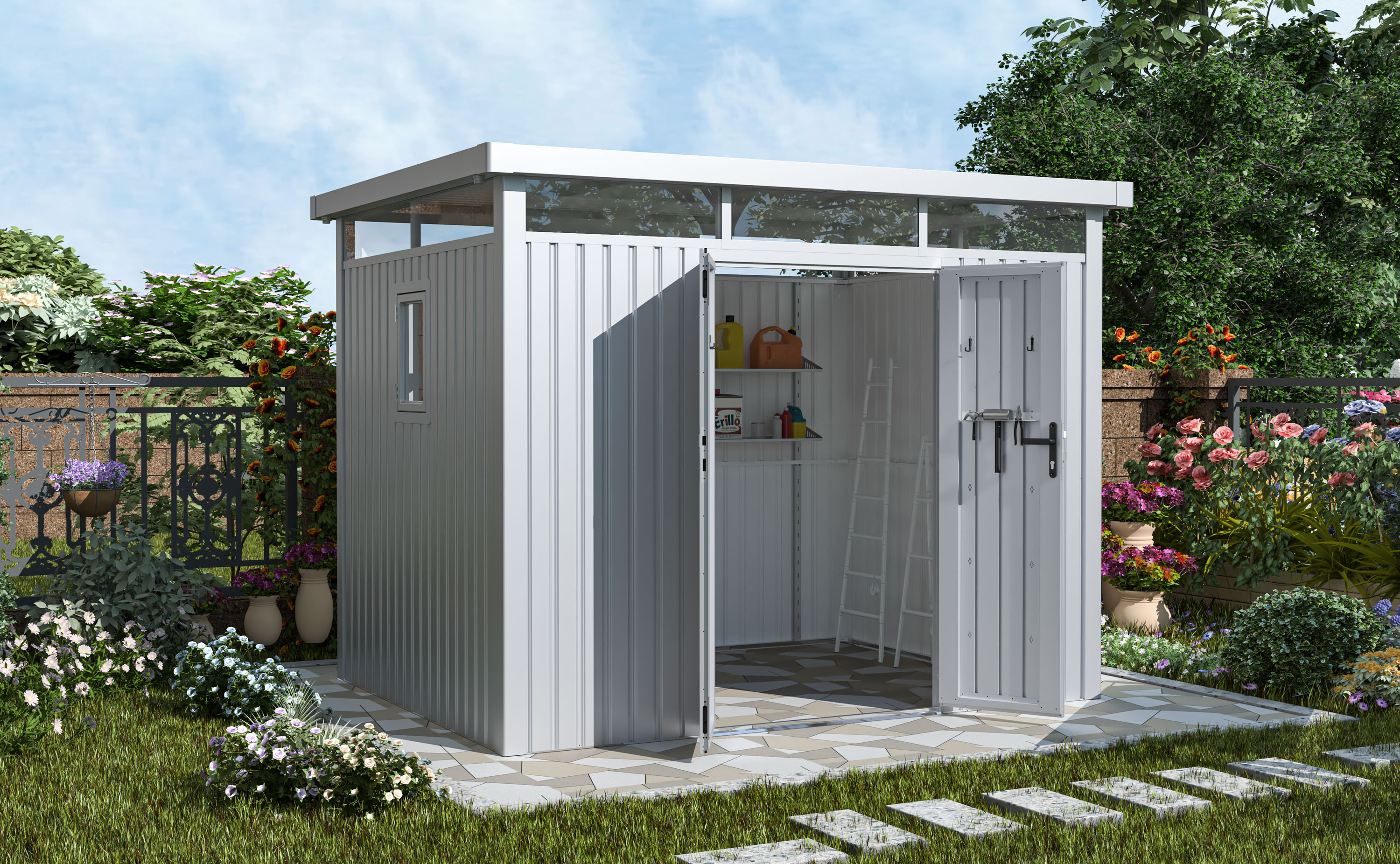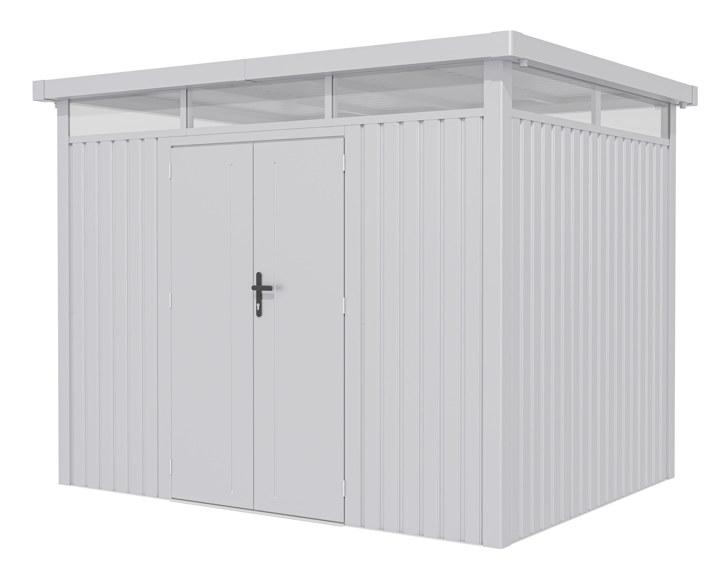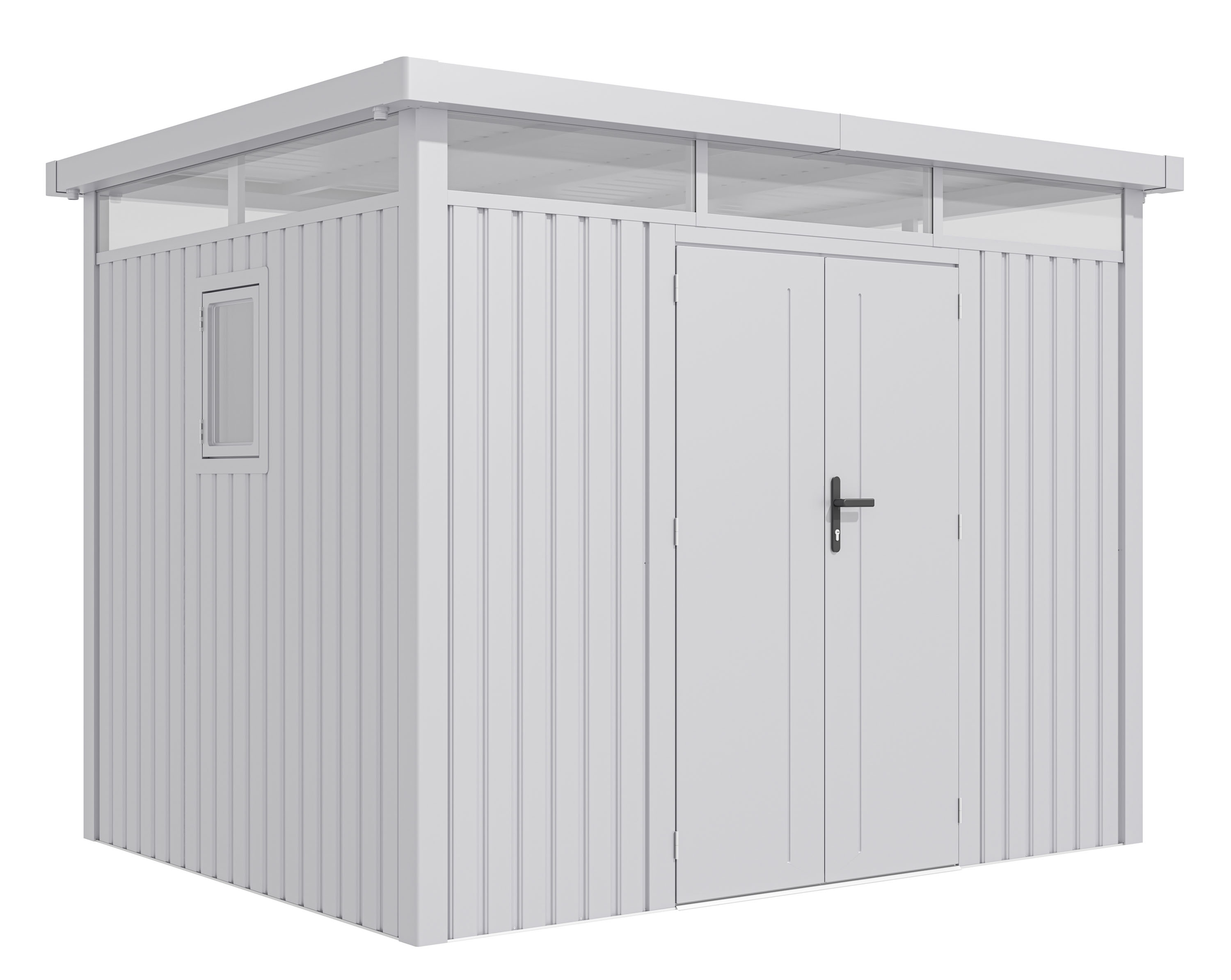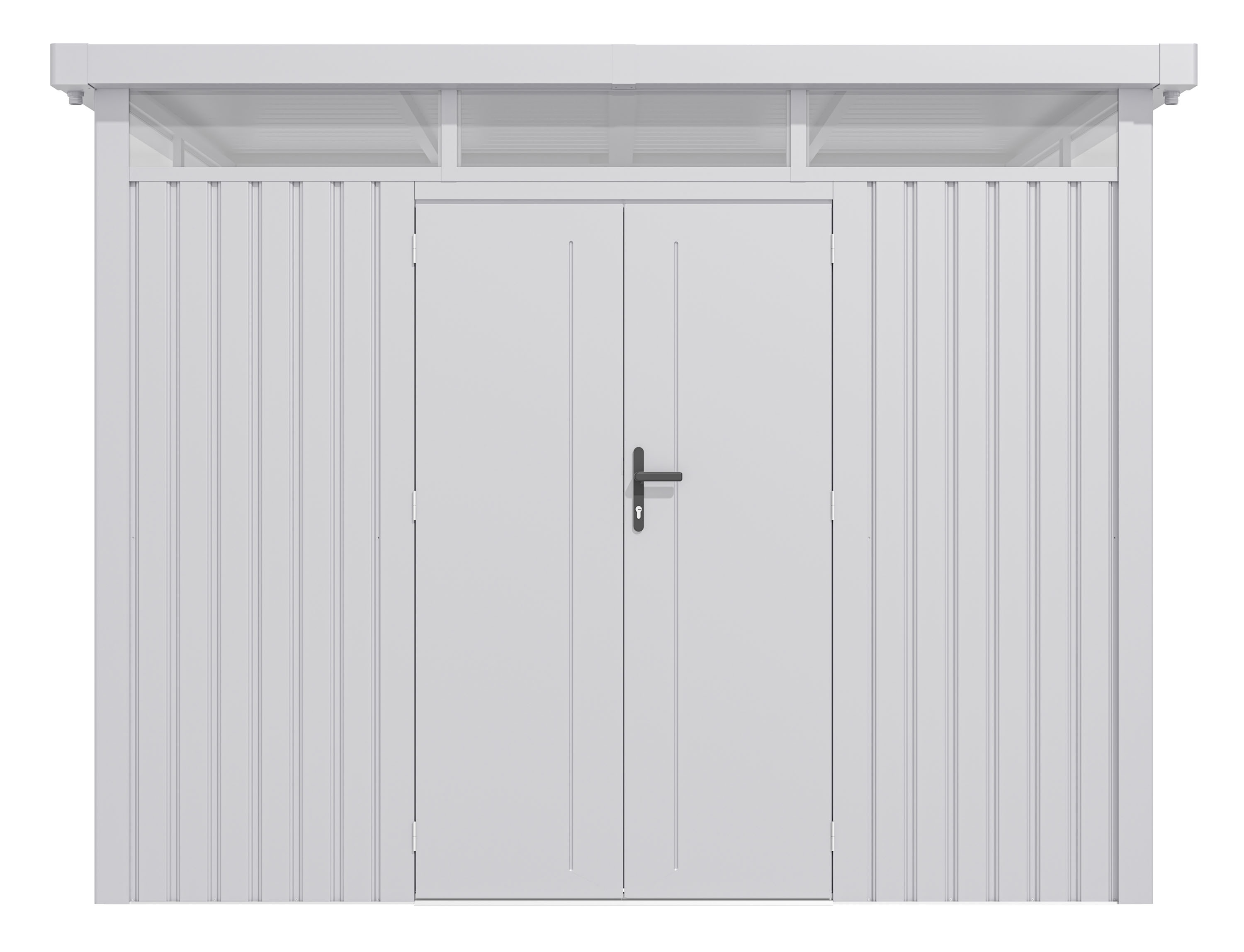 Plechový zahradní domek se sílou stěny 0,4 mm, průchozí výška je 178 cm. Polykarbonátové světlíky, otevíratelné okno, střecha s okapy, stříbrná barva.