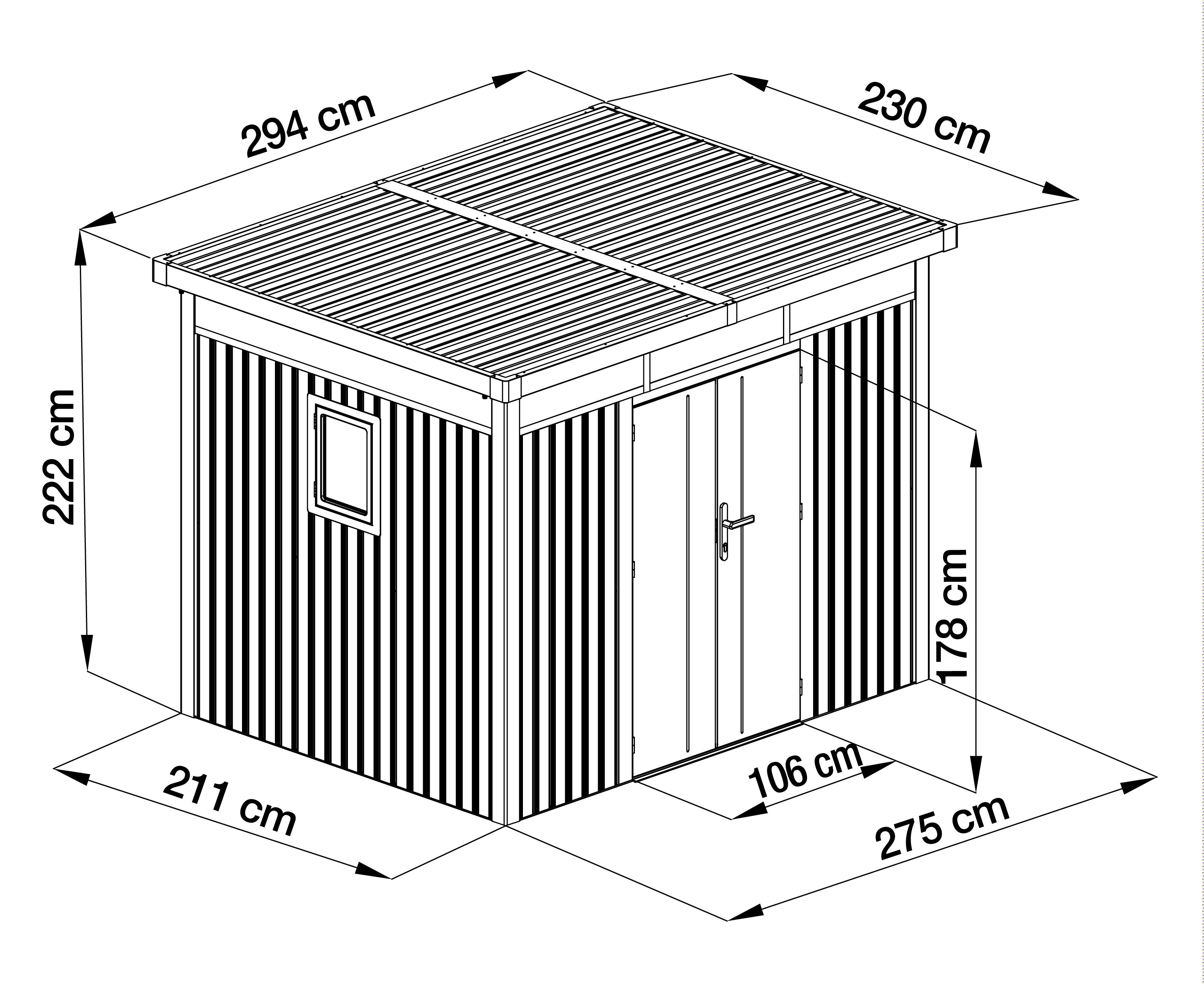 Plechový zahradní domek se sílou stěny 0,4 mm, průchozí výška je 178 cm. Polykarbonátové světlíky, otevíratelné okno, střecha s okapy, břidlicová barva.