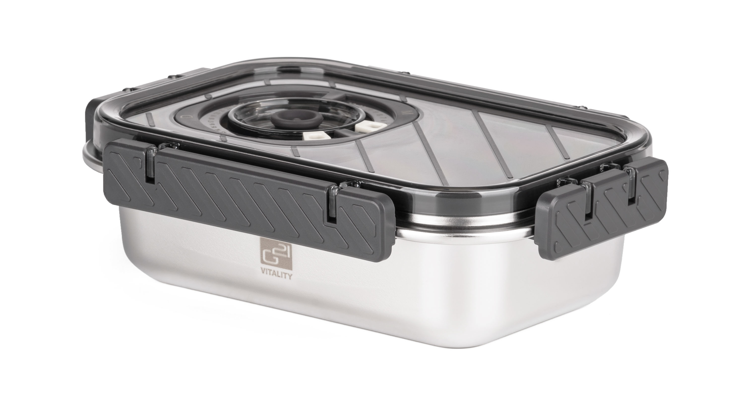 Nerezová vakuovací dóza o objemu 1900 ml, víko s vakuovým ventilem, teplotní odolnost -100 až +400 °C, bezpečný hygienický nerez materiál, kompatibilní s vakuovačkami G21.