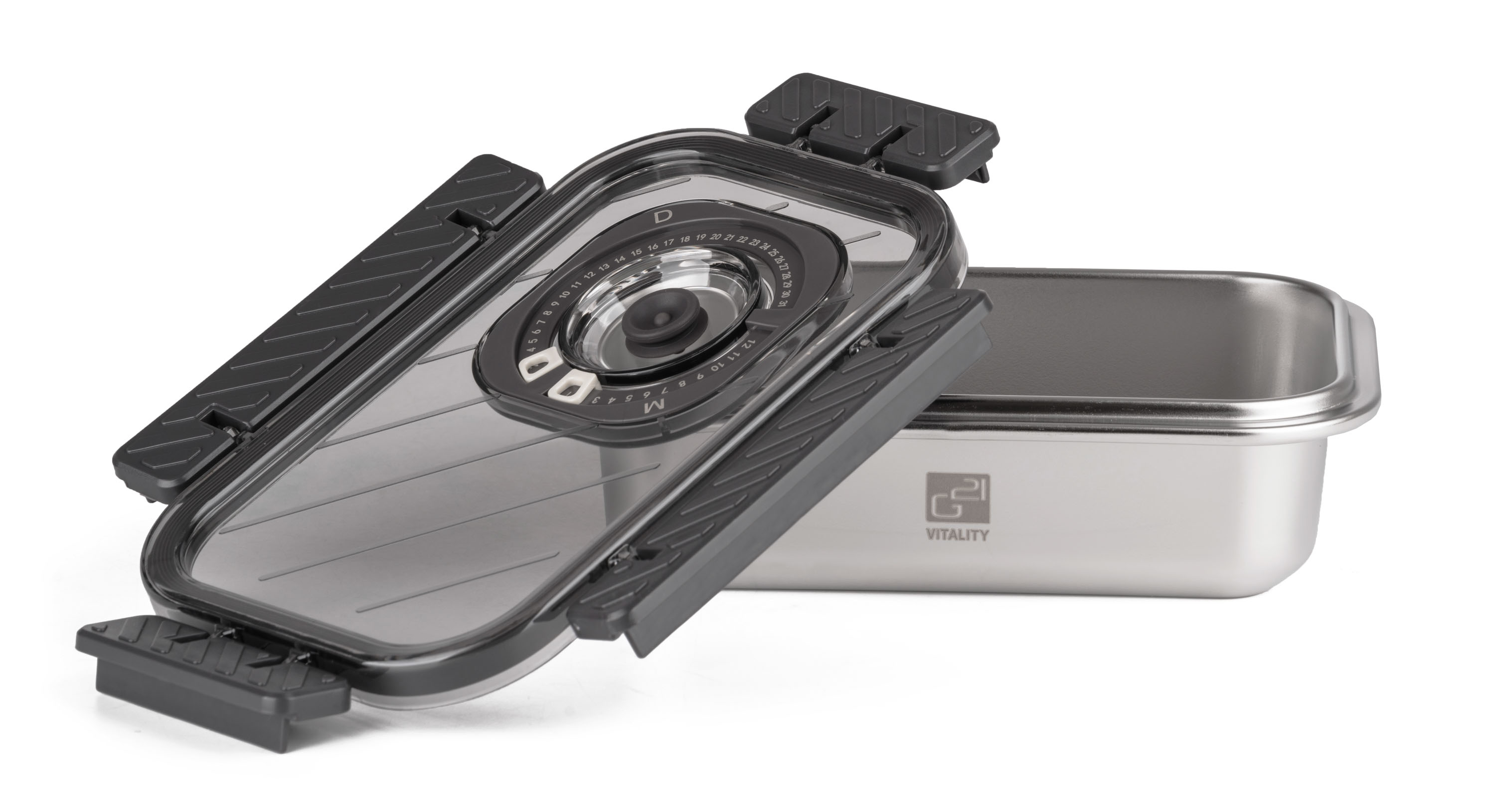 Víko z BPA Free plastu je vybavené vakuovacím ventilem a praktickým nastavitelným ukazatelem data. Budete tak vědět, kdy byly potraviny vakuovány nebo do kdy se mají spotřebovat. Pro uvolnění vakua a otevření dózy stačí jemně zmáčknout ventil uprostřed víka.