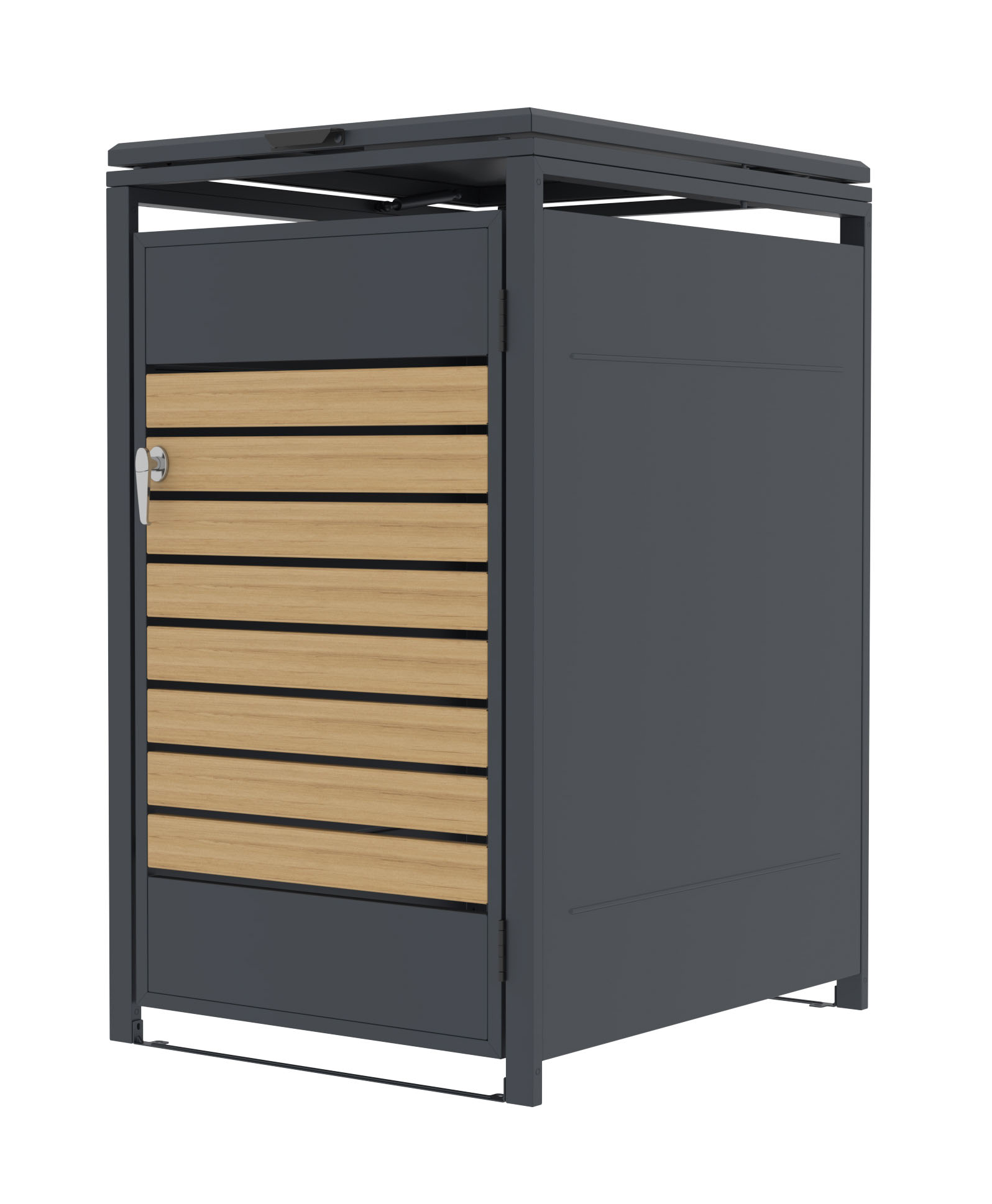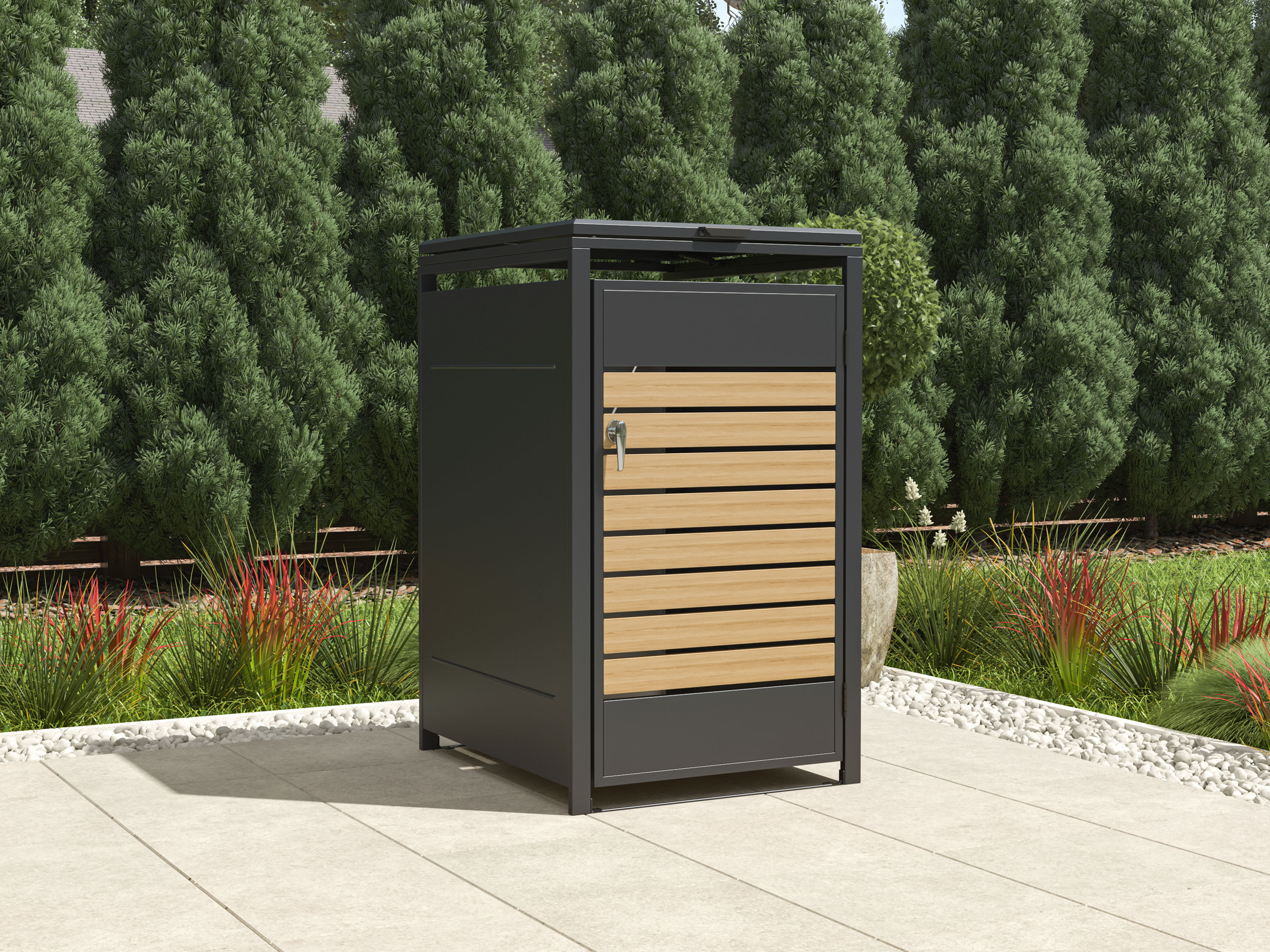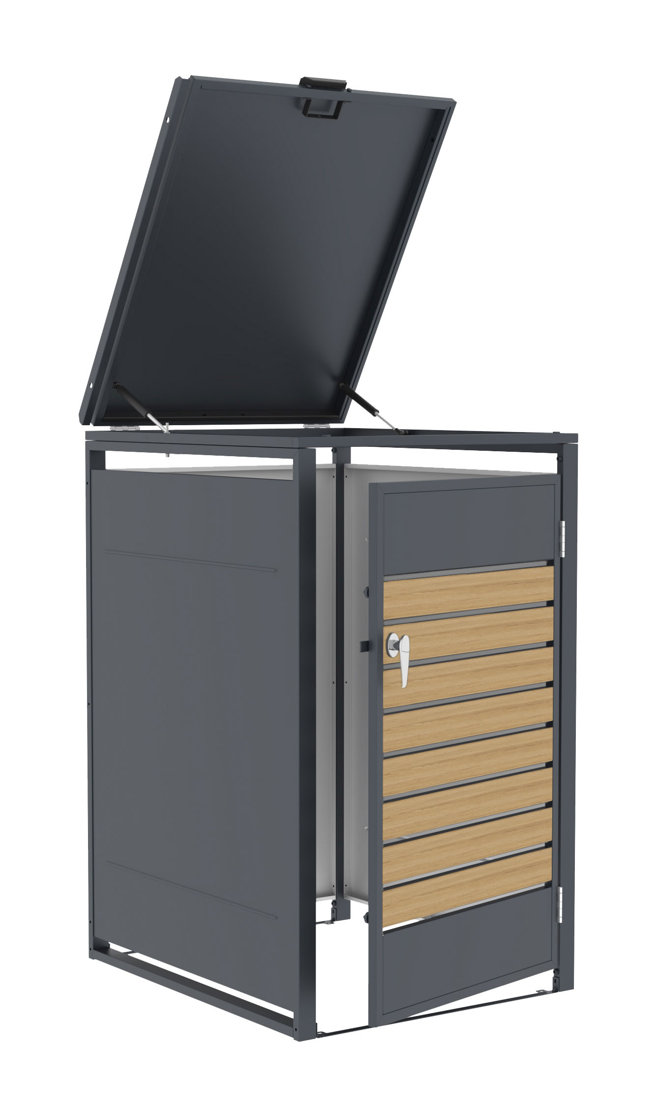 Prémiová ocel o síle 0,8 mm, plynové vzpěry, plná záda pro umístění do prostoru, určený na 1 popelnici do objemu 240 l, antracitová barva v kombinaci s dekorem dřeva.
