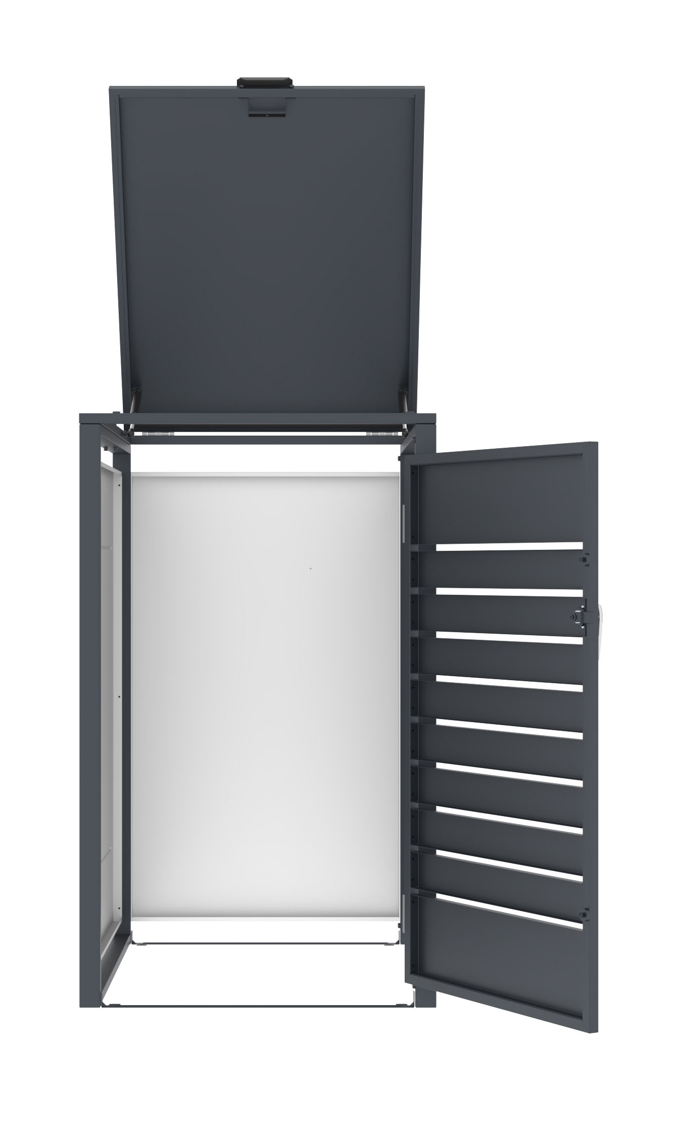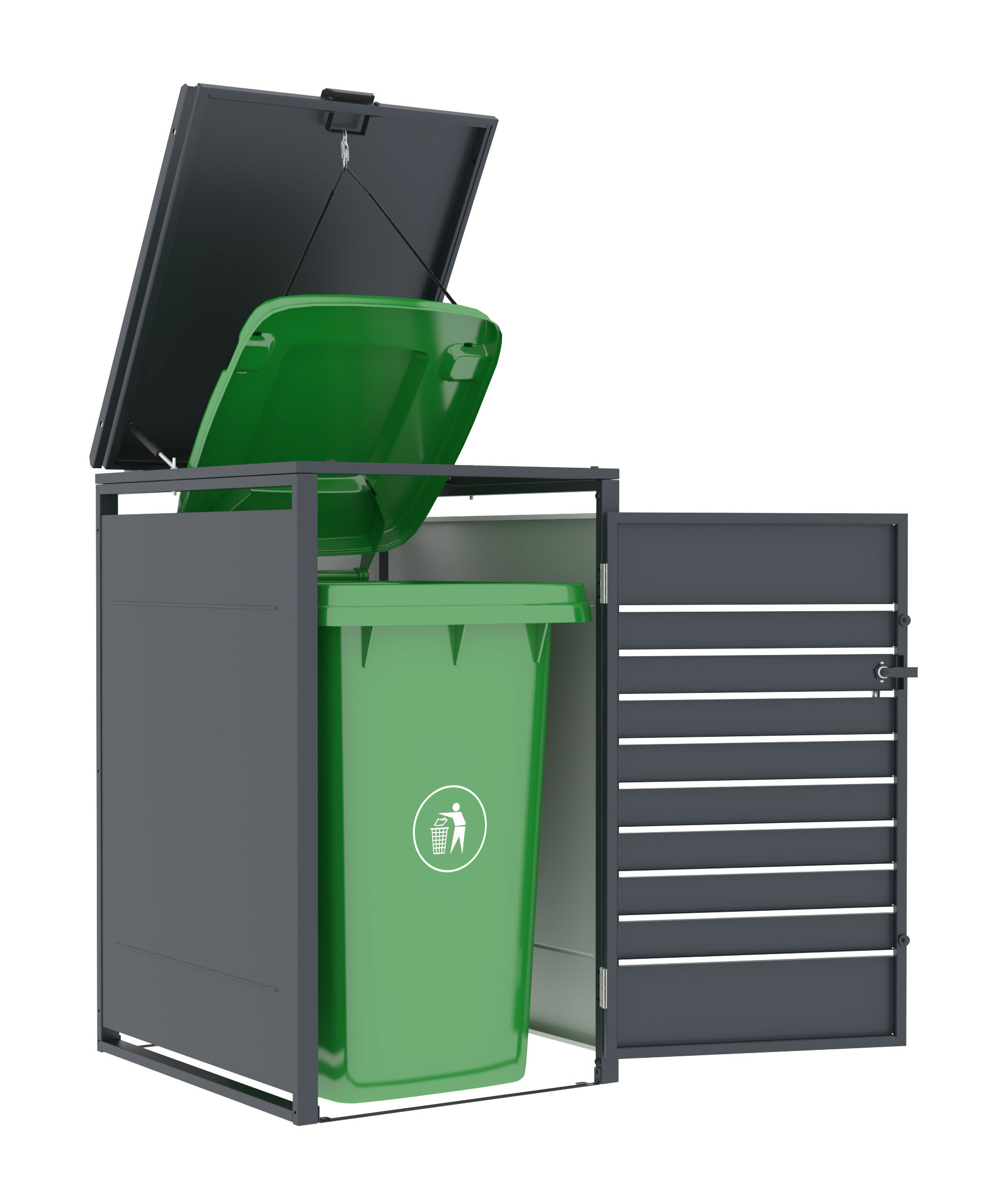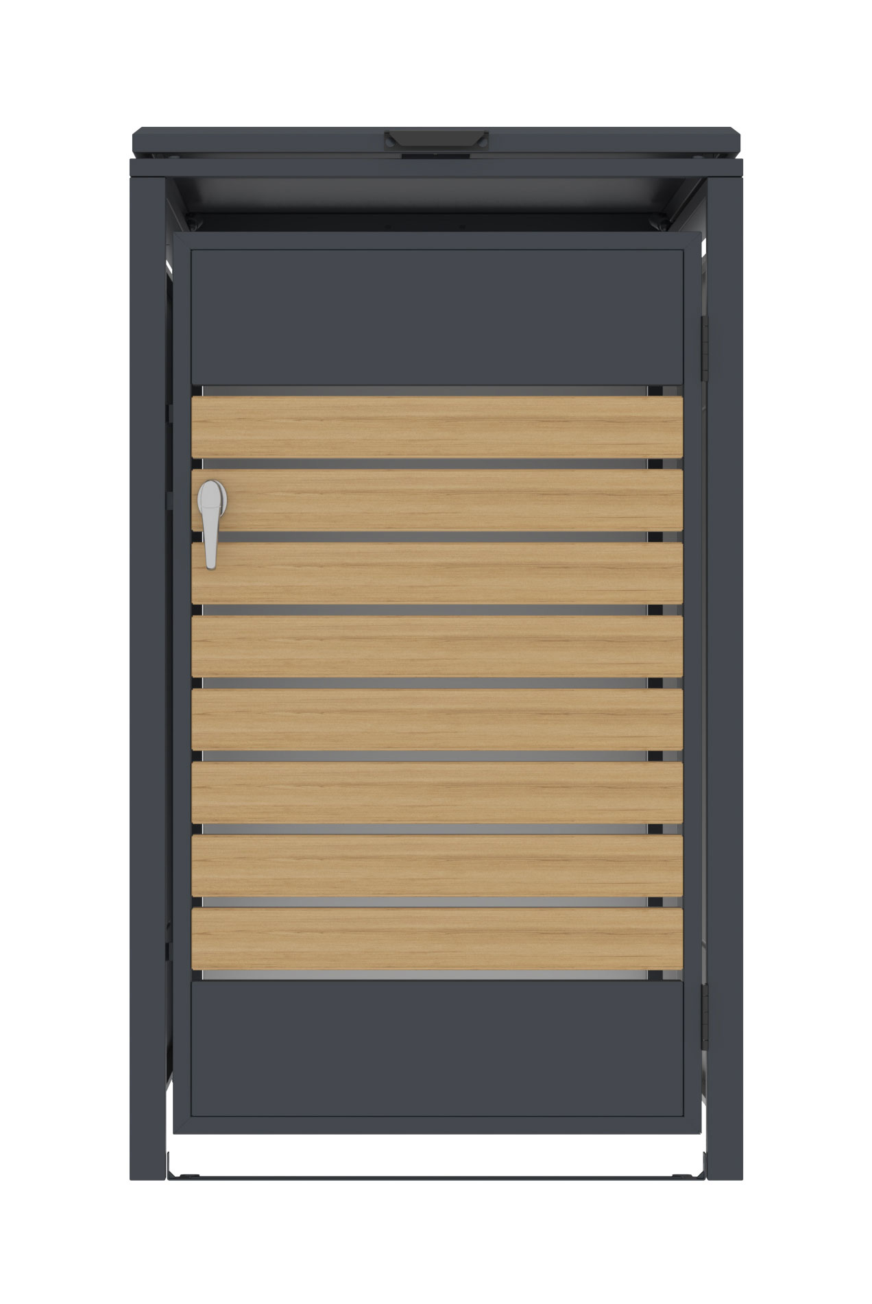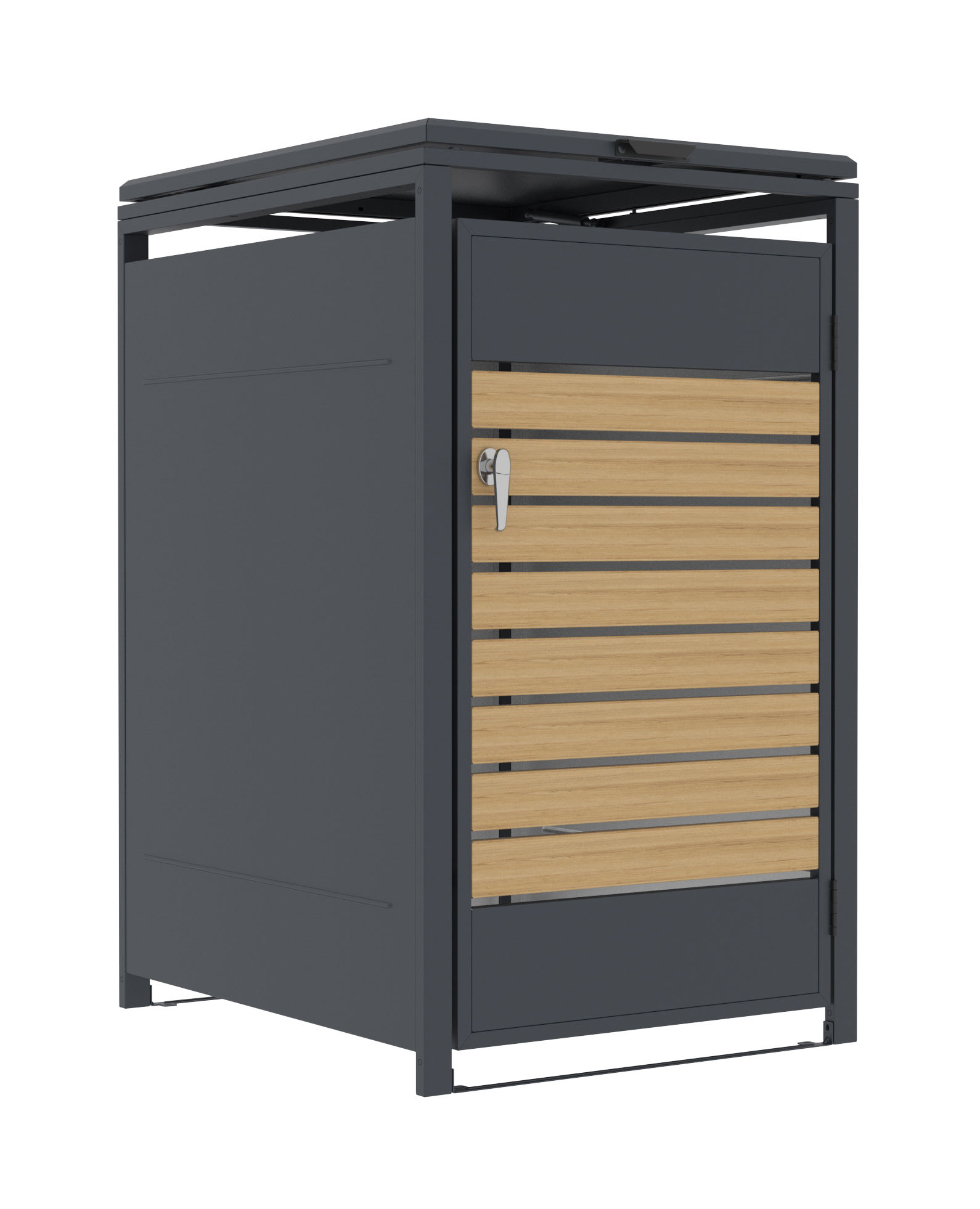 Prémiová ocel o síle 0,8 mm, plynové vzpěry, plná záda pro umístění do prostoru, určený na 1 popelnici do objemu 240 l, antracitová barva v kombinaci s dekorem dřeva.