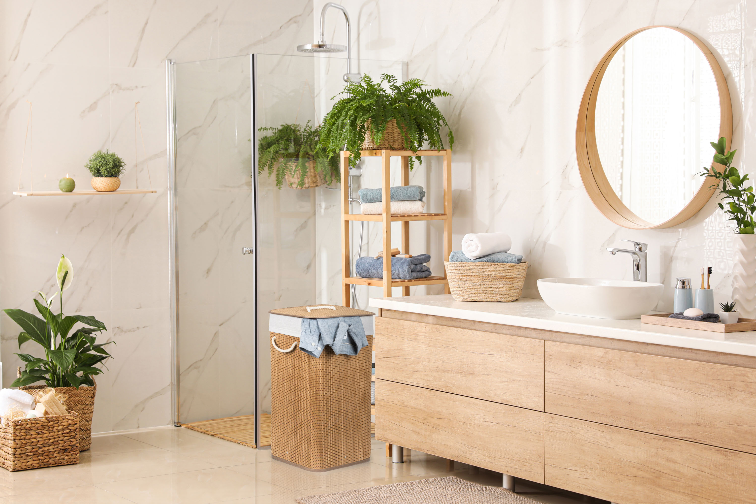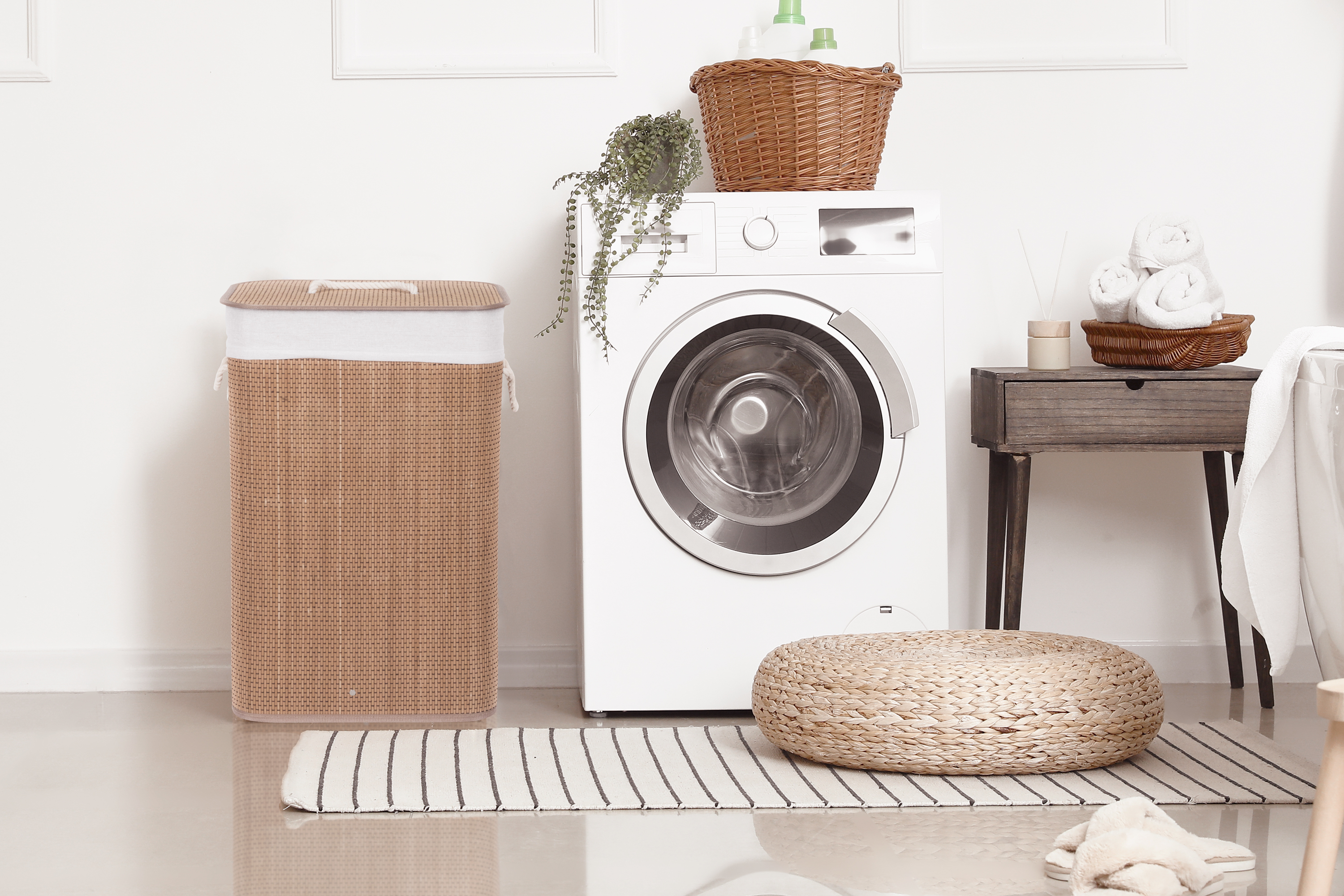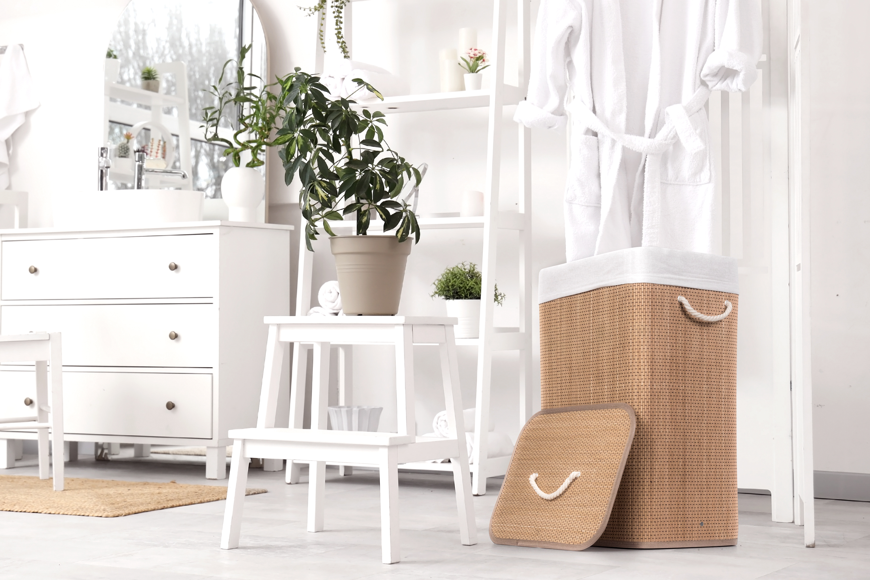 Jak vybrat nejlepší koš na špinavé prádlo? Co se materiálu koše týče, doporučujeme jednoznačně bambus. Je odolný vůči vlhkosti, takže jej můžete bez obav umístit do koupelny nebo servisní místnosti s pračkou. Zároveň je i vizuálně velmi příjemný – kombinace přírodního materiálu a bílé vložky a madel evokuje pocit čistoty, navíc se i hodí k jakémukoliv interiéru.