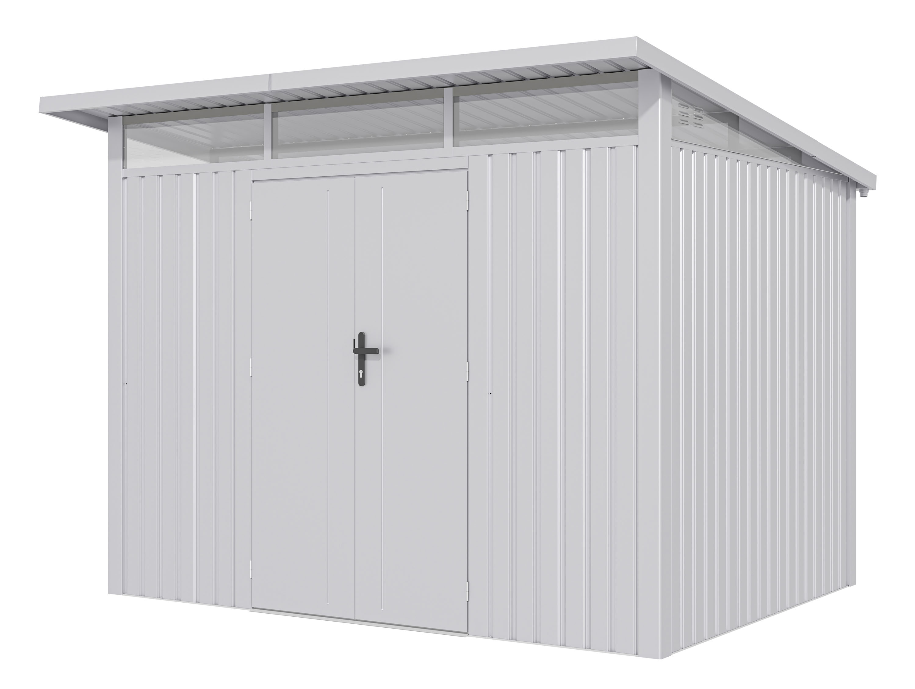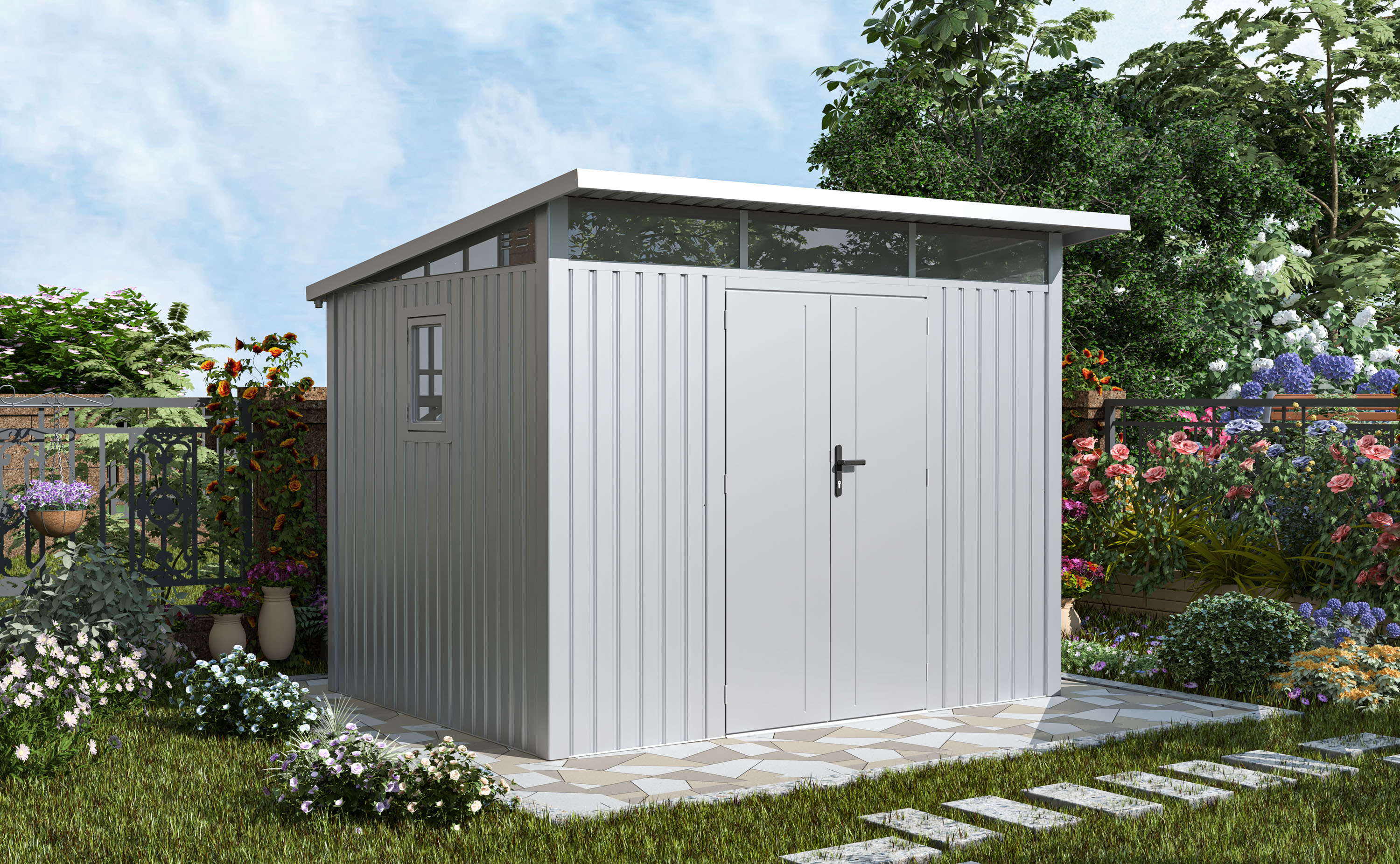 Plechový zahradní domek se sílou stěny 0,4 mm, průchozí výška je 178 cm. Polykarbonátové světlíky, otevíratelné okno, střecha s okapy, stříbrná barva.