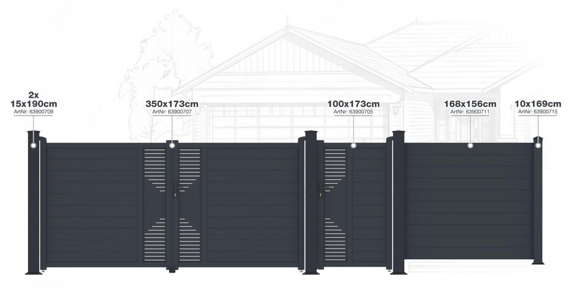 Plotové pole o šířce 168 cm je vysoké 69 cm, materiál hliník s ochranným protikorozním práškovým nástřikem. Čistý atraktivní design, bezúdržbovost, možnost přizpůsobení šířky na míru.
