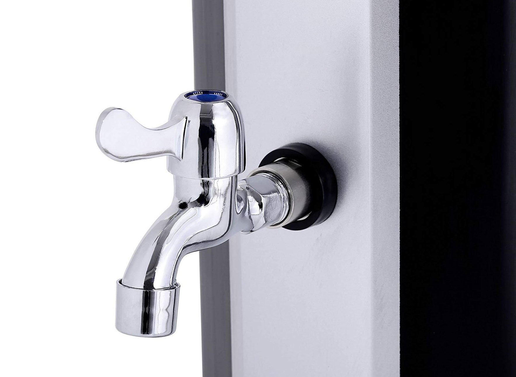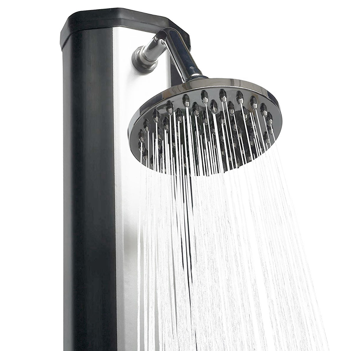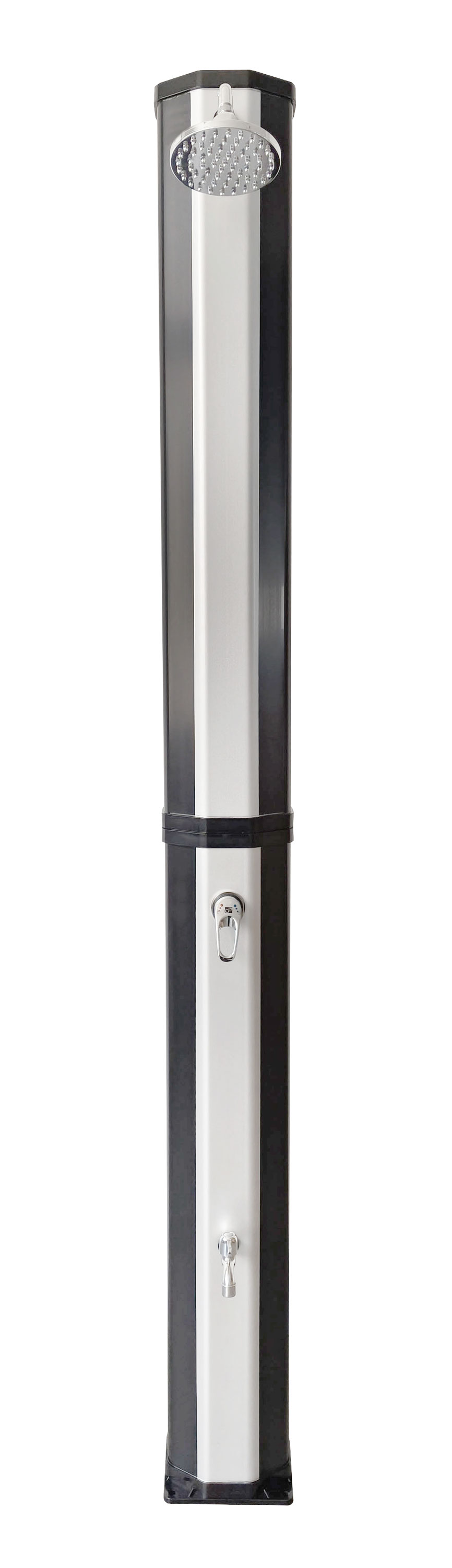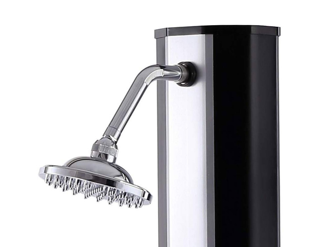 Tělo sprchy v elegantní černo stříbrné barvě slouží zároveň jako solární kolektor. Absorbuje sluneční paprsky a ohřívá vodu bez potřeby elektřiny nebo plynu. Sprcha před koupáním navíc pomáhá udržet vodu v bazénu čistší a snižuje množství nečistot, které by se jinak dostaly do bazénu.