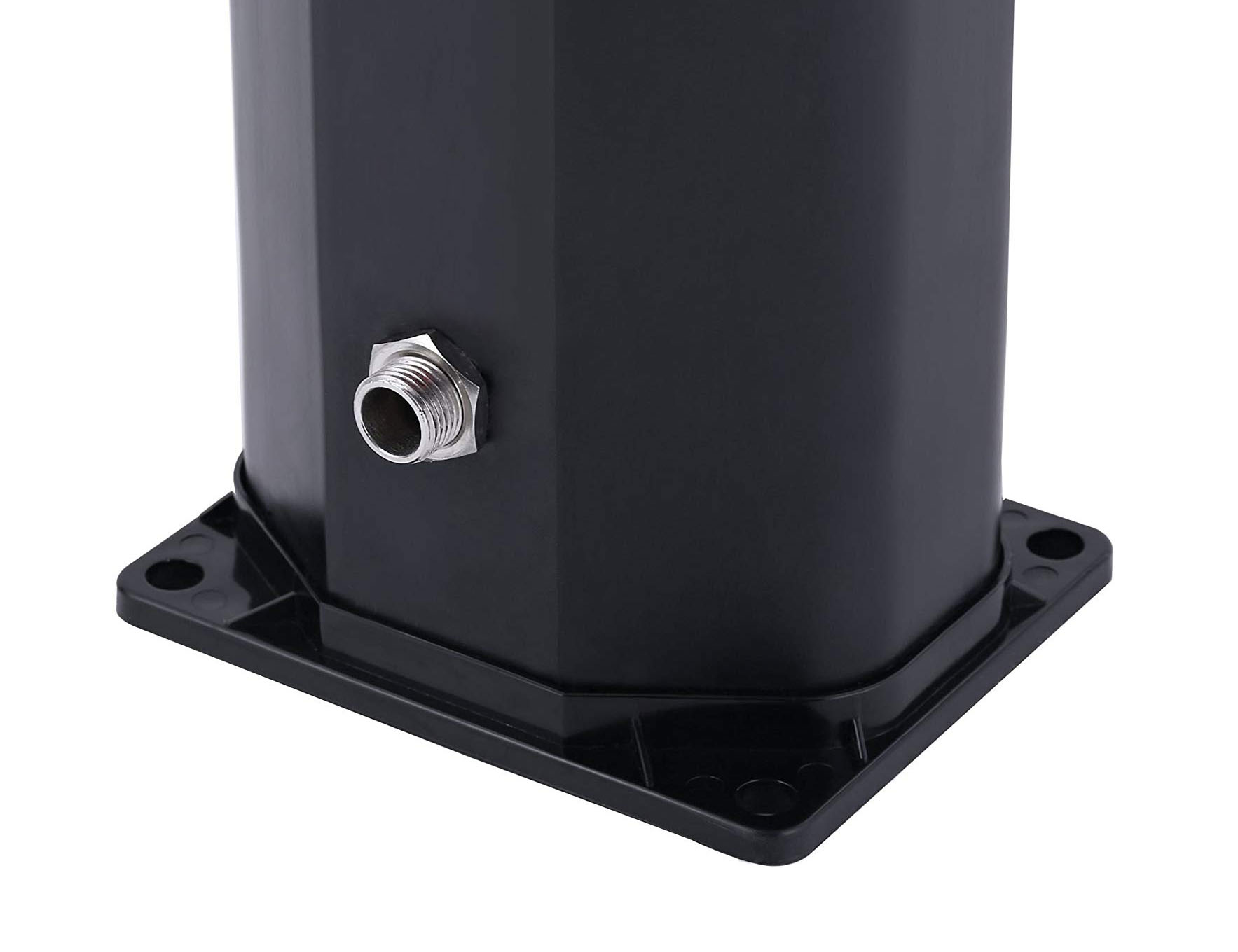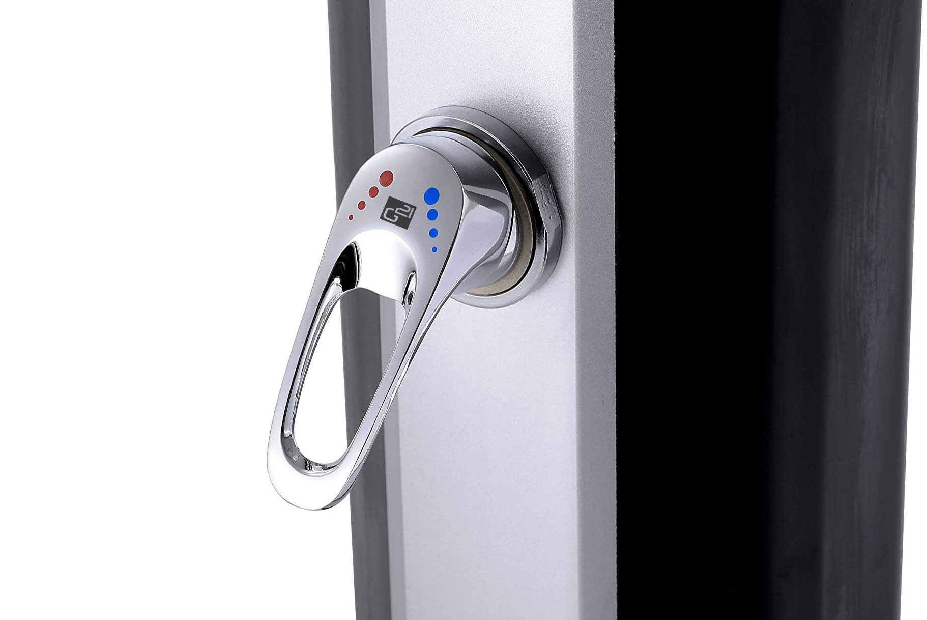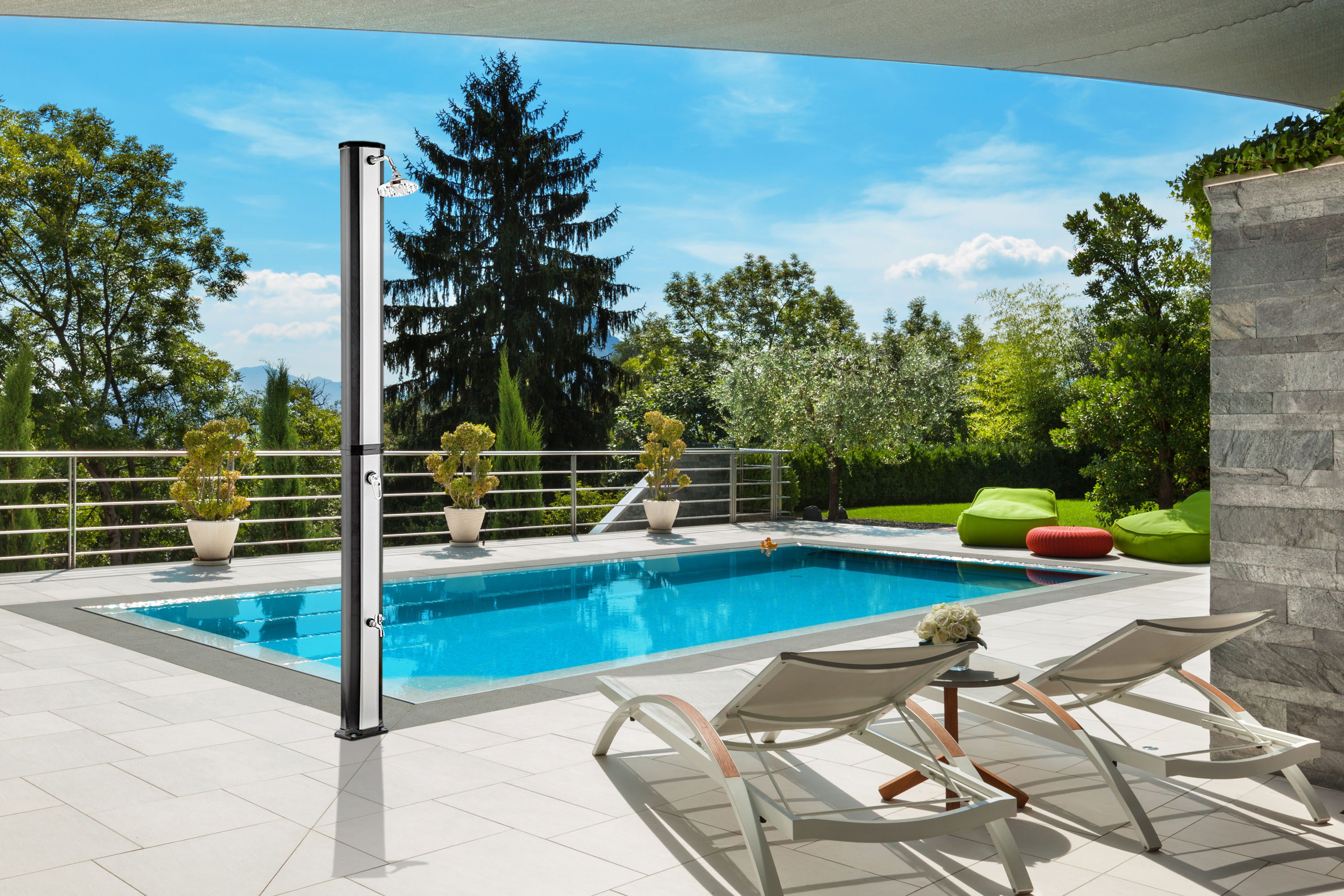 Tělo sprchy v elegantní černo stříbrné barvě slouží zároveň jako solární kolektor. Absorbuje sluneční paprsky a ohřívá vodu bez potřeby elektřiny nebo plynu. Sprcha před koupáním navíc pomáhá udržet vodu v bazénu čistší a snižuje množství nečistot, které by se jinak dostaly do bazénu.