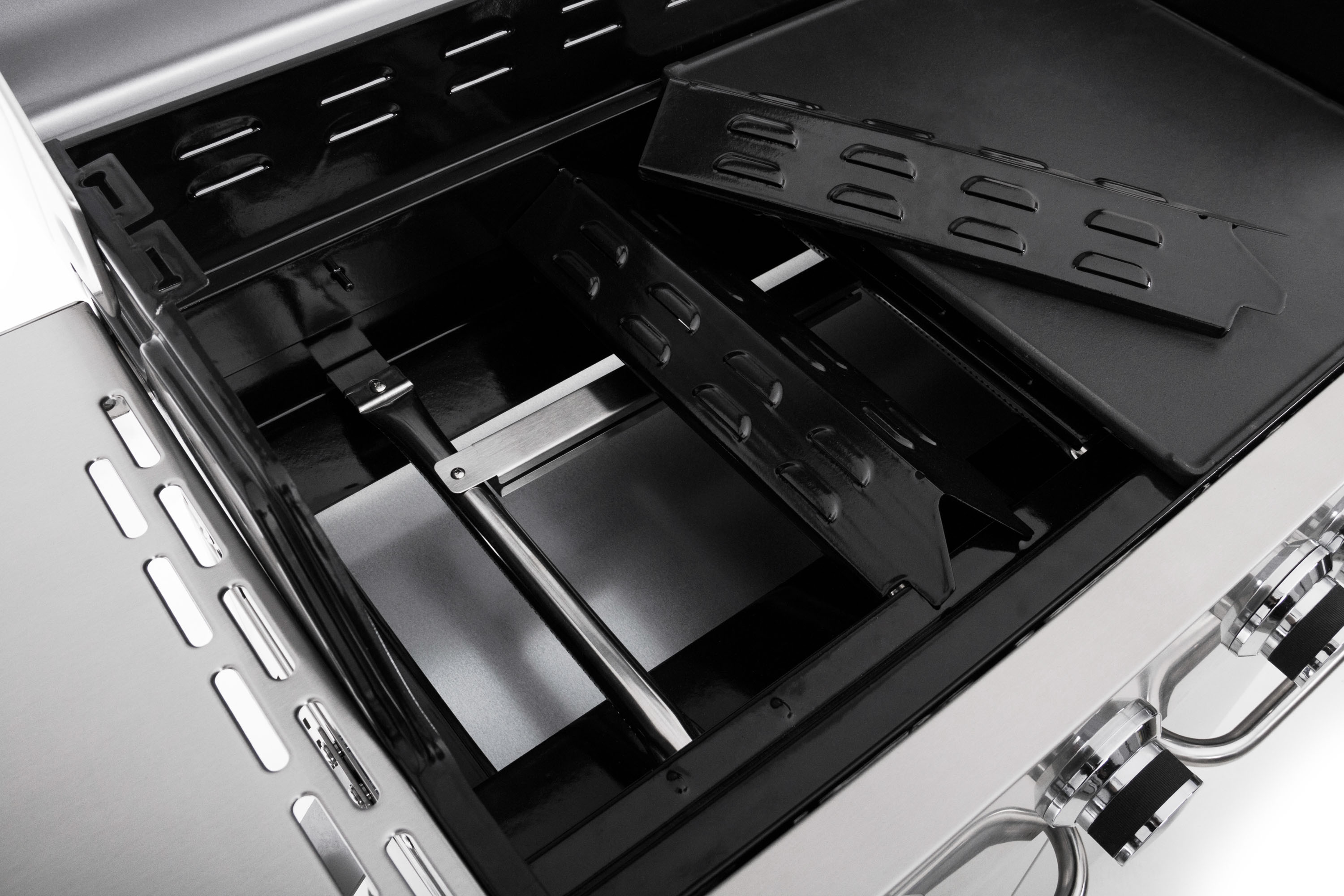 Gril má také delší životnost hořáků díky chytrému systému Flame Tamer. Kovové profily, umístěn přímo nad hořáky, zabraňují odkapávání tuku mezi plameny a jeho vzplanutí. Zároveň zabraňují přímému ohřevu mřížky pouze v místě hořáku, takže se celá mřížka vyhřívá rovnoměrně.