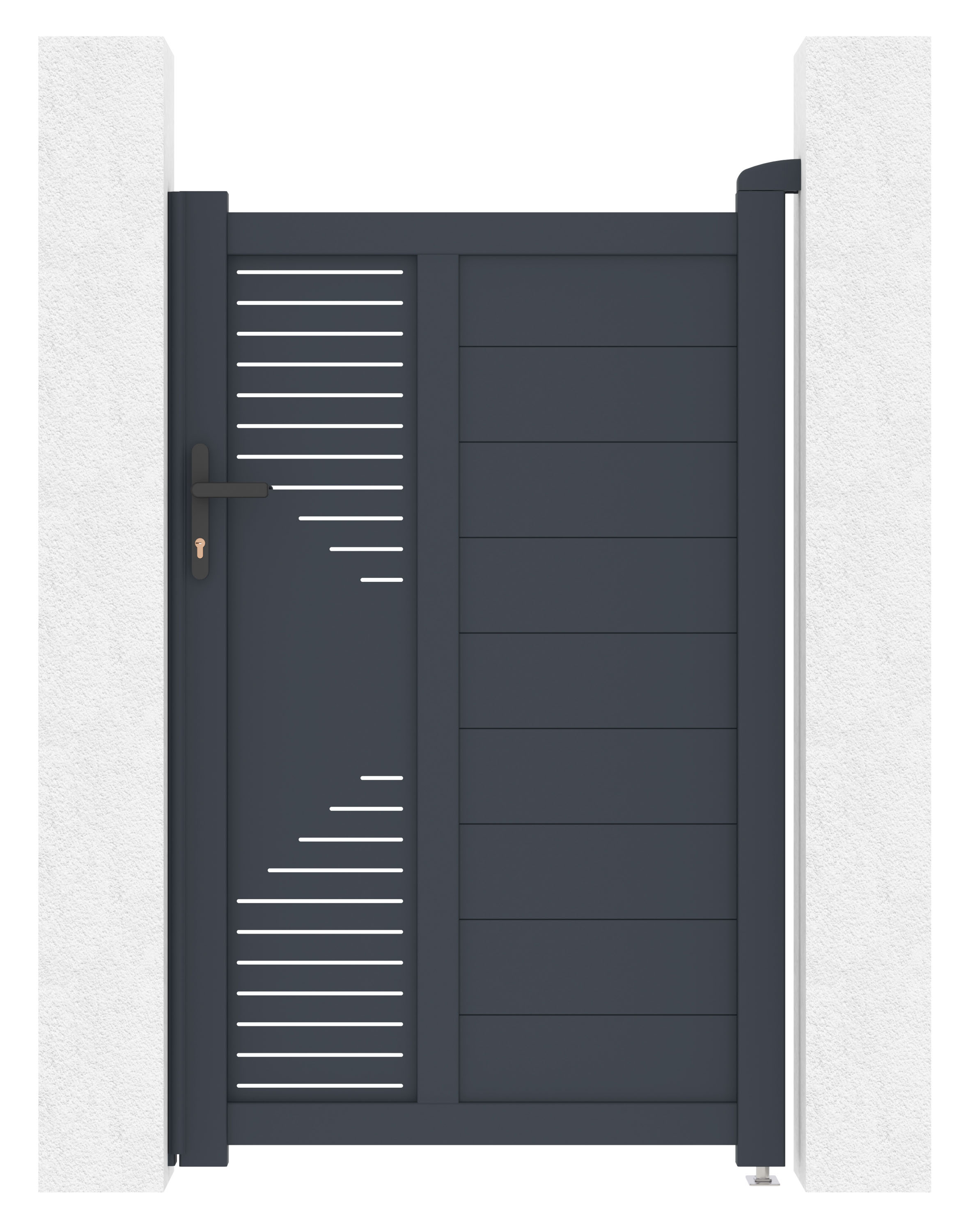 Vchodová zamykatelná hliníková branka s pravým otevíráním. Klika, FAB zámek, otevírání dovnitř, vysoká odolnost a dlouhá životnost, práškový nástřik, možnost přizpůsobení šířky na míru.