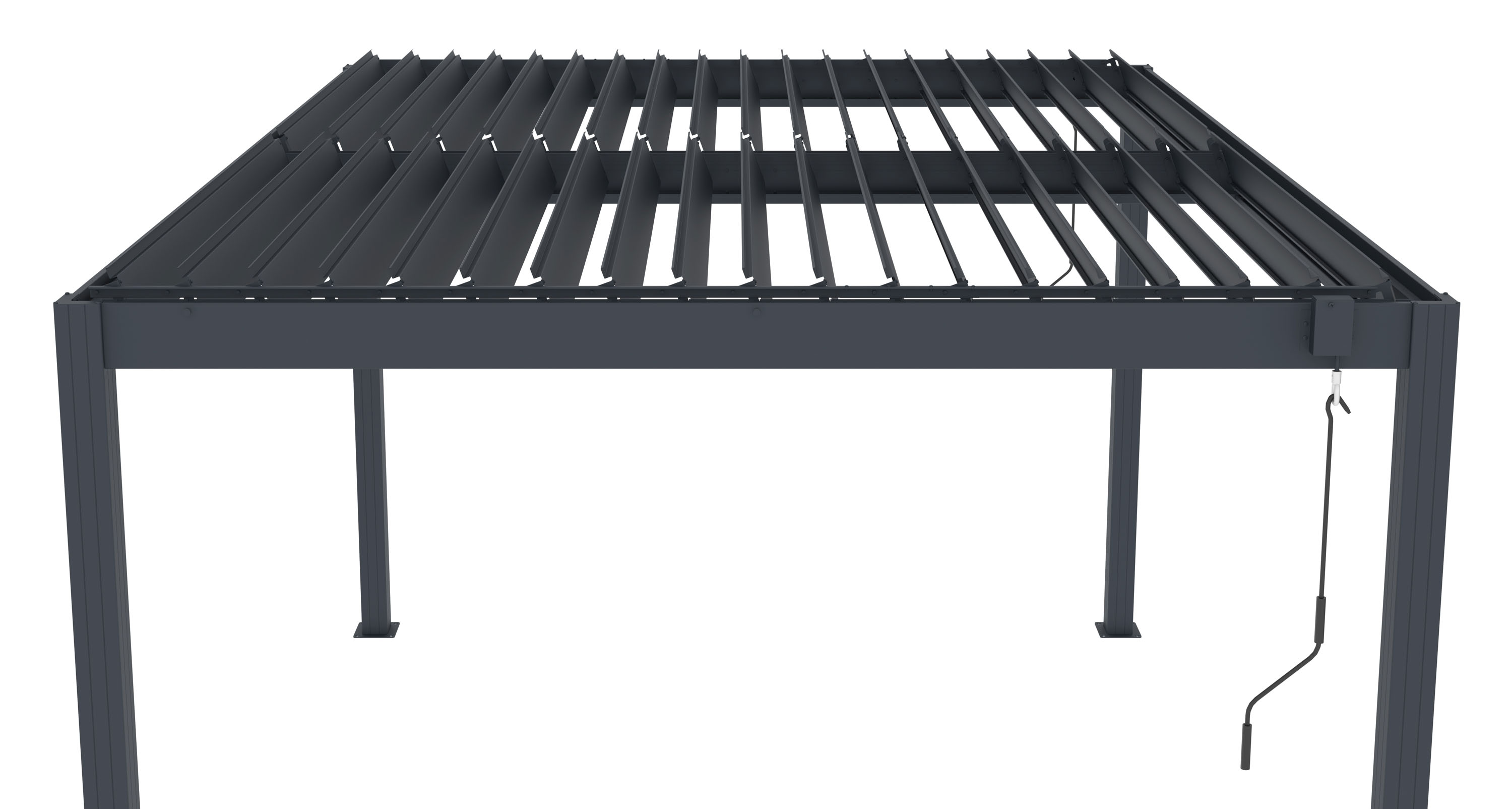 Díky manuálně ovládaným pozinkovaným lamelám si snadno nastavíte ideální podmínky – od stínu během horkých dní až po plnou ochranu před deštěm. Lamely lze naklopit tak, aby zajistily správnou ventilaci nebo zamezily přehřívání prostoru. Velký rozsah od úhlu 110 ° až do úplného uzavření umožňuje jak cirkulaci vzduchu podle potřeby, tak spolehlivou ochranu před deštěm nebo slunečním žárem.