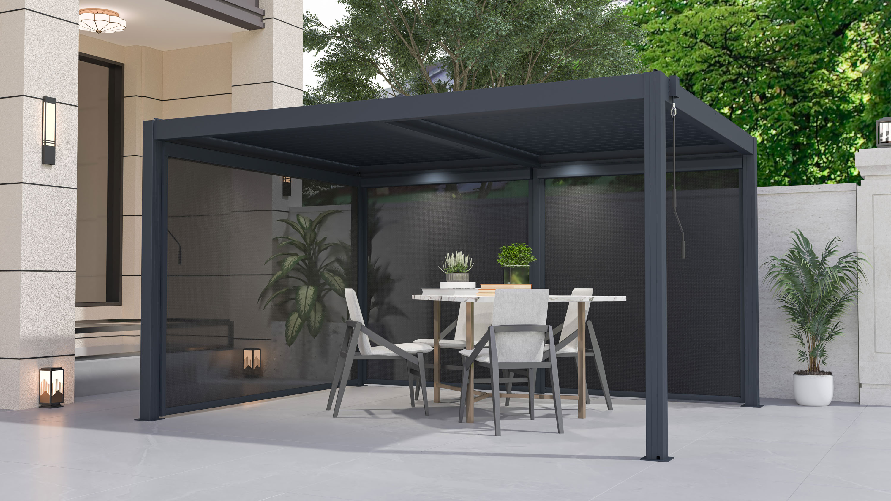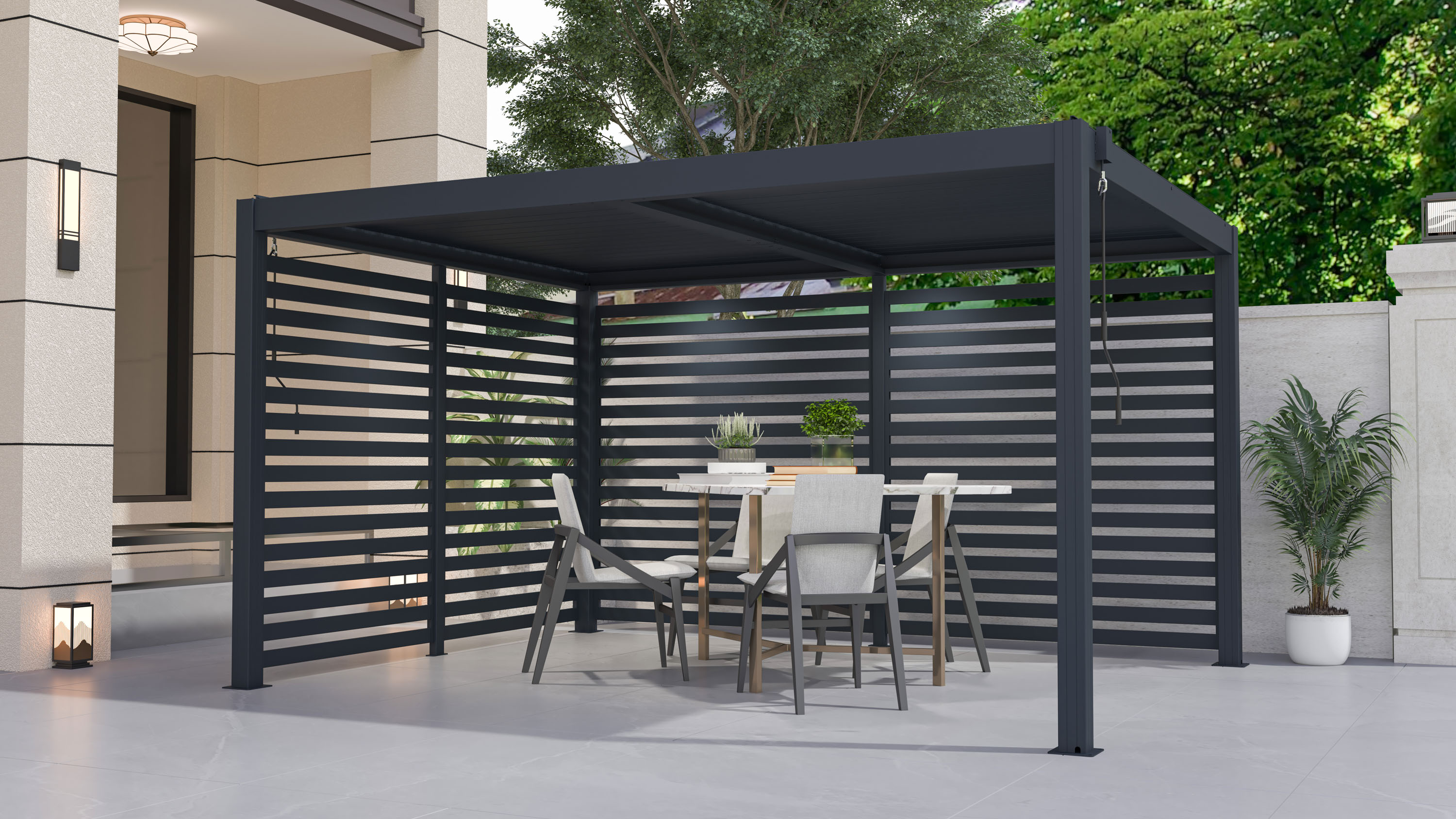 Pergolu lze přizpůsobit vašim potřebám díky volitelnému příslušenství – boční markýzy zajistí větší soukromí, zatímco fixní a rotační lamely poskytují ochranu proti větru. Všechny doplňky lze snadno přidat i dodatečně.