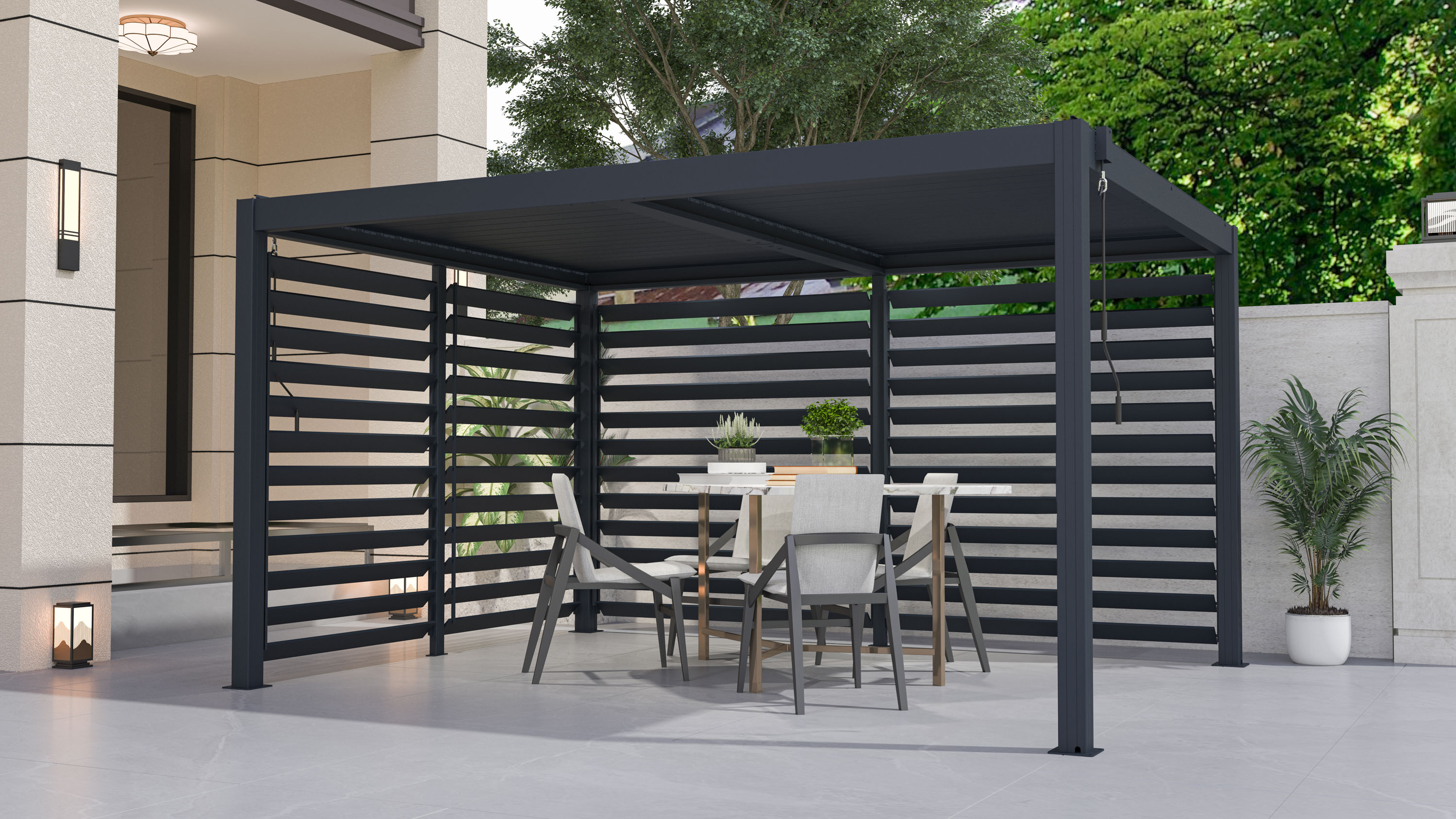 Boční stěna s otočnými pozinkovanými lamelami pro větší soukromí i ochranu před větrem, deštěm či sluncem. Stabilní konstrukce z kvalitního hliníku, snadná instalace.