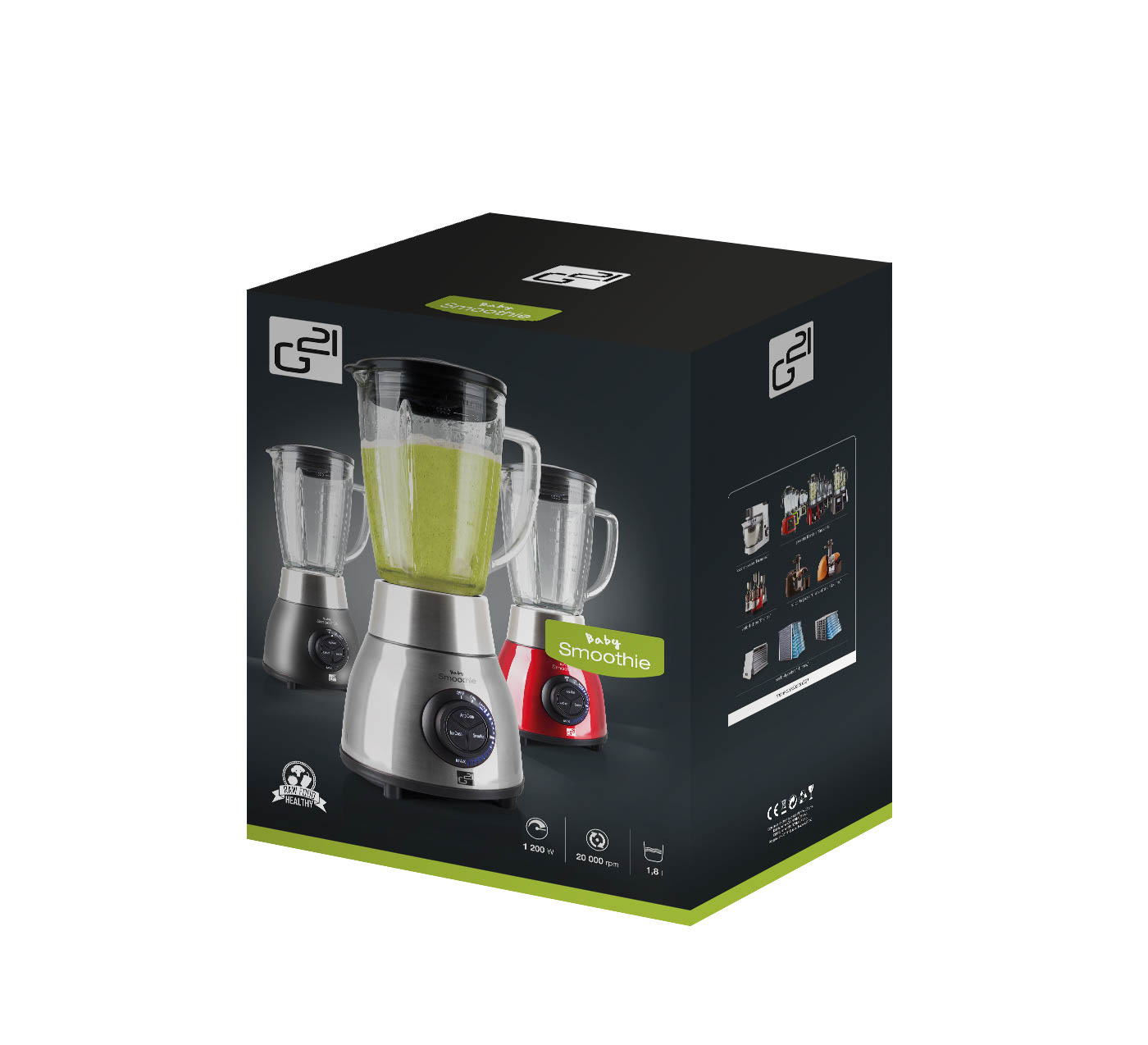 Výkonem 1 200 W a 20 000 ot./min. se G21 Baby Smoothie ve své cenové kategorii řadí k nadprůměru. Mixovací nádoba je celoskleněná s obsahem 1,8 l. Stejně jako ke všem mixérům značky G21 k ní v základním balení dostanete i víko s otvorem pro vkládání surovin i během mixování. A pozor, ačkoliv v této cenové kategorii pěchovadla nebývají ve standardní výbavě mixéru, u nás to neplatí. Snažíme se, abyste byli s nákupem výrobku G21 maximálně spokojeni, proto naleznete promyšleně tvarované pěchovadlo v základní výbavě.