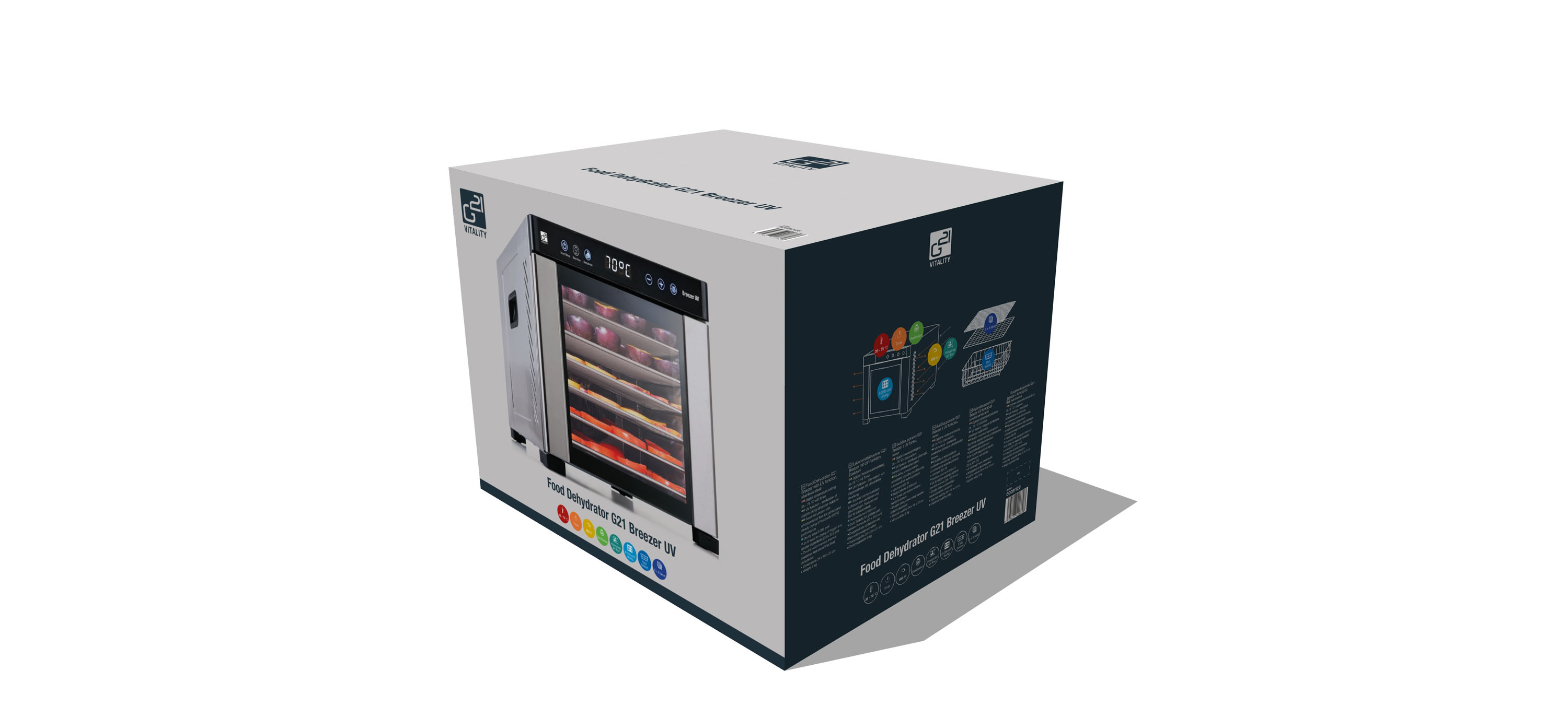 Horizontální sušička potravin G21 Breezer je menší sestrou sušičky G21 Mistral. Se svými 6 nerezovými sušícími tácy a 6 jemnými sušícími vložkami je díky kompaktnějšímu provedení ideální pro domácí použití nebo do provozů s menší pracovní plochou. Veškeré ovoce, zeleninu, bylinky, houby i maso usuší dokonale, rovnoměrně a jednoduše. Nemusíte přeskládávat plata ani otáčet suroviny. Dokonce se nemusíte zabývat ani údržbou sušičky, díky použitým materiálům je odolná a snadno se čistí.