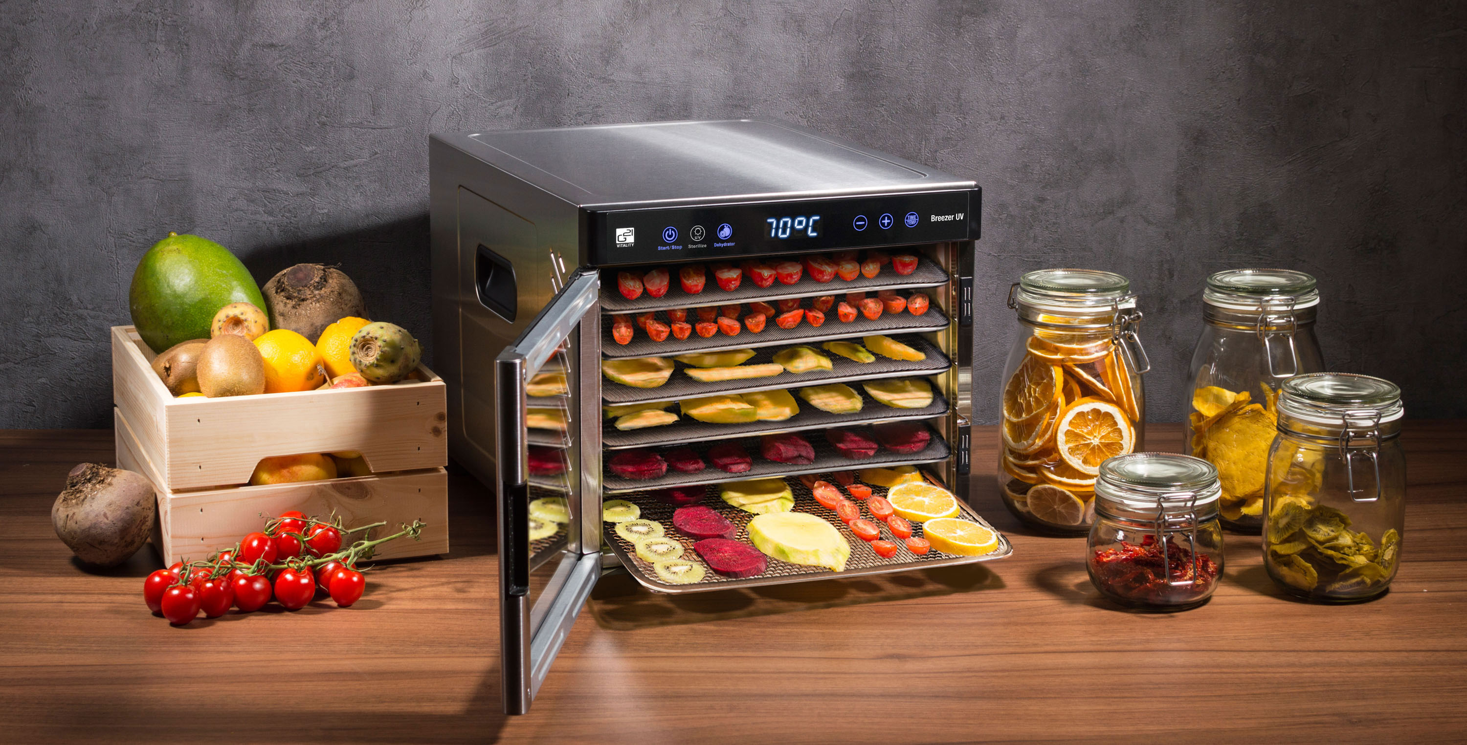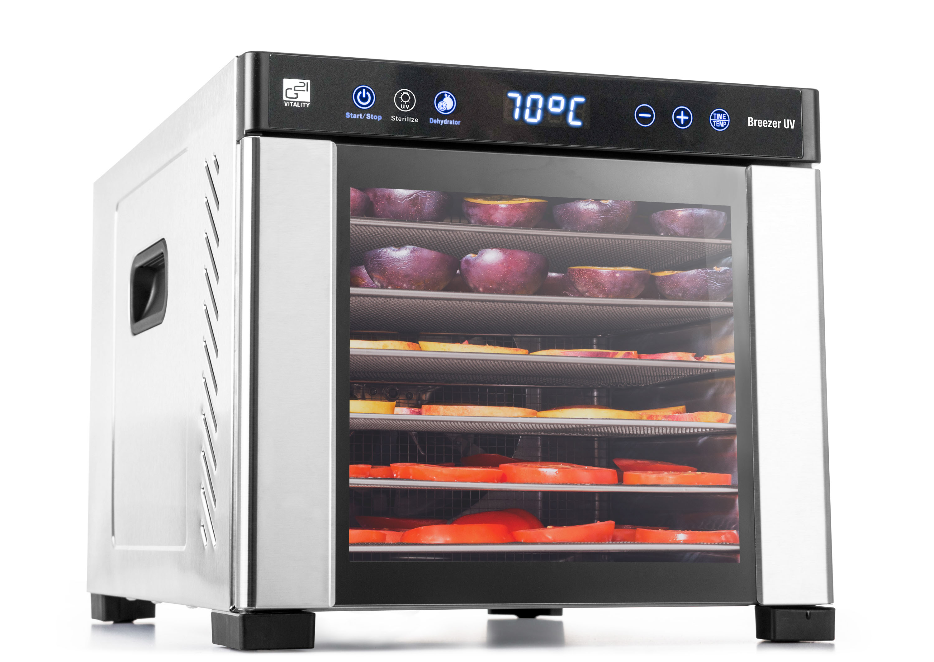 Řídící jednotka sušičky G21 Breezer má dokonale řešenou elektroniku, ovládání je intuitivní a snadné. Časovač hlídá dobu přípravy a po skončení sušení sušičku sám vypne. Regulátor teploty vám dává absolutní kontrolu nad sušícím procesem. Usušte si to, co chcete, přesně tak, jak to chcete.