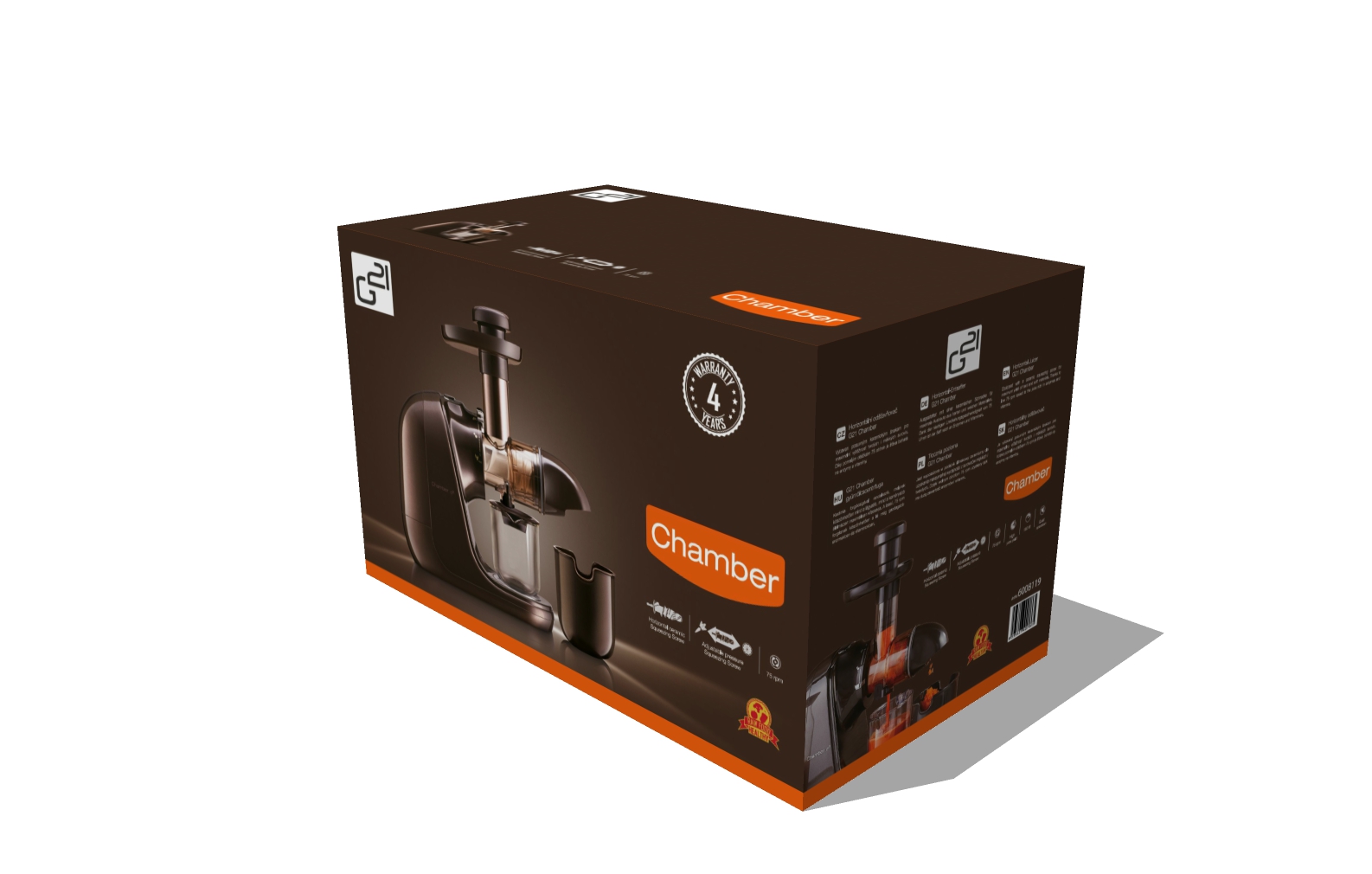 Čistá přírodní šťáva, plná vitamínů a živin díky horizontálnímu odšťavňovači G21 Chamber. Šnekový odšťavňovač G21 Chamber se zárukou 4 roky vám snadno, rychle a čistě připraví dokonalý požitek. Ale to není ani zdaleka všechno.