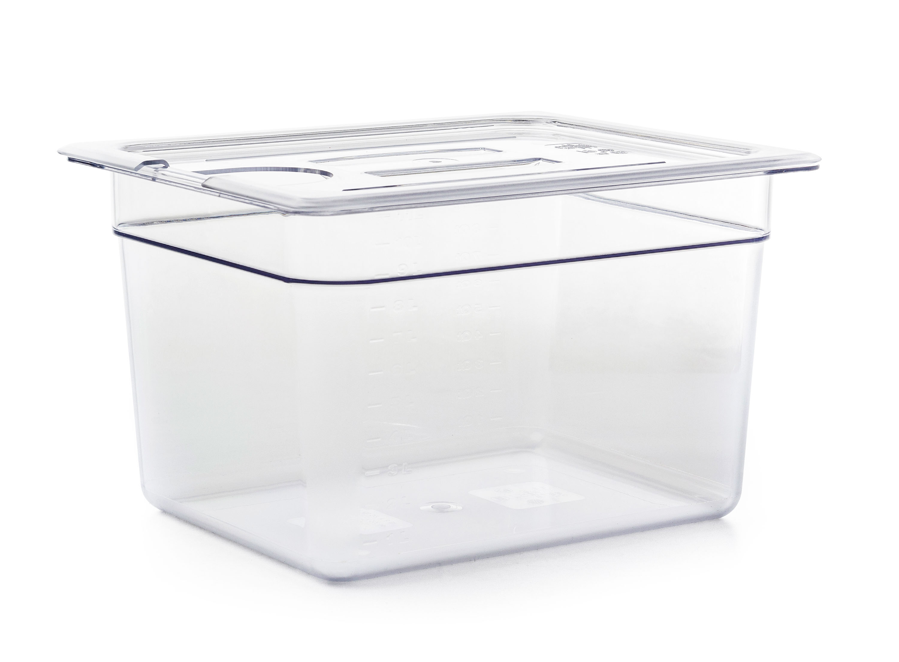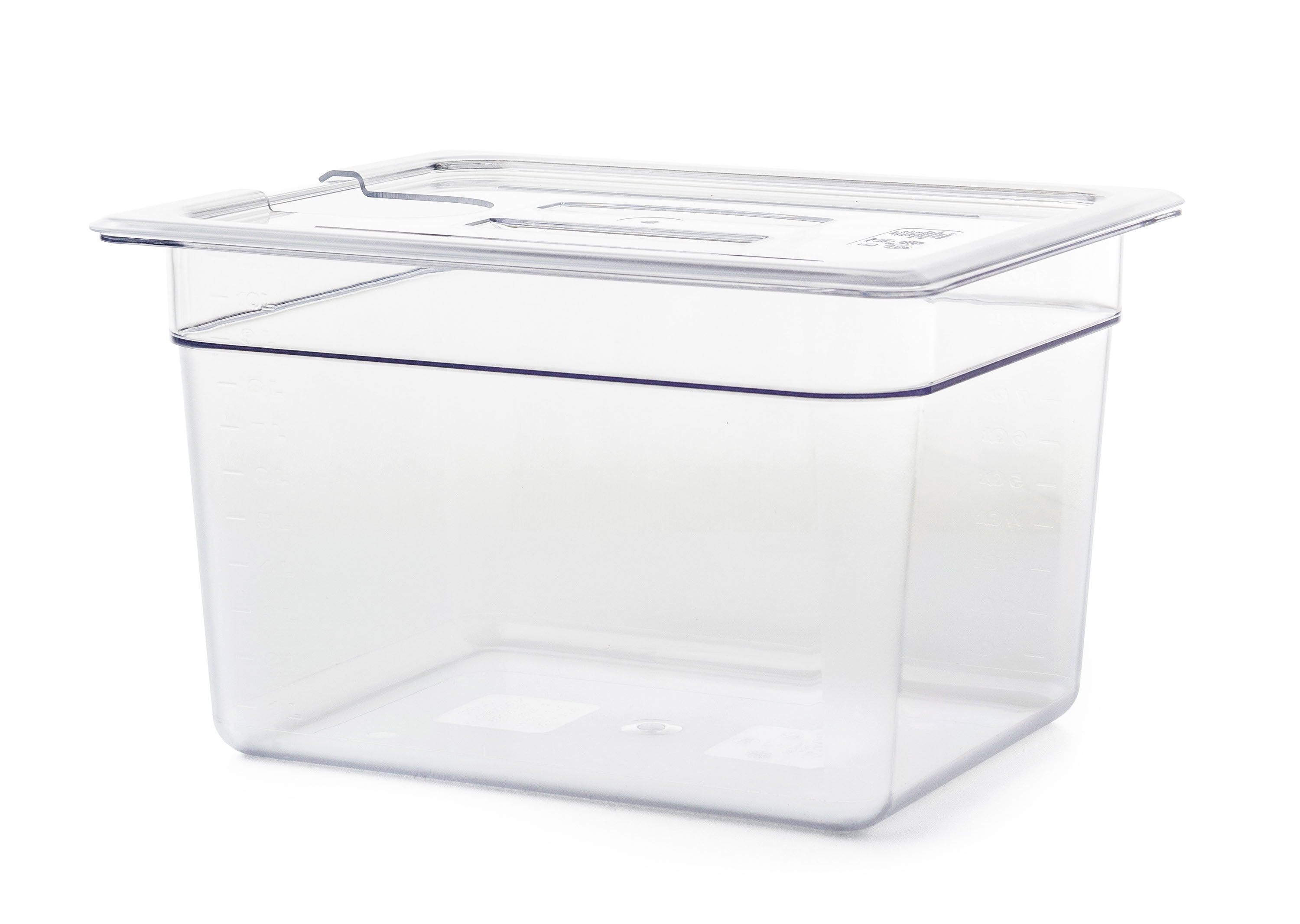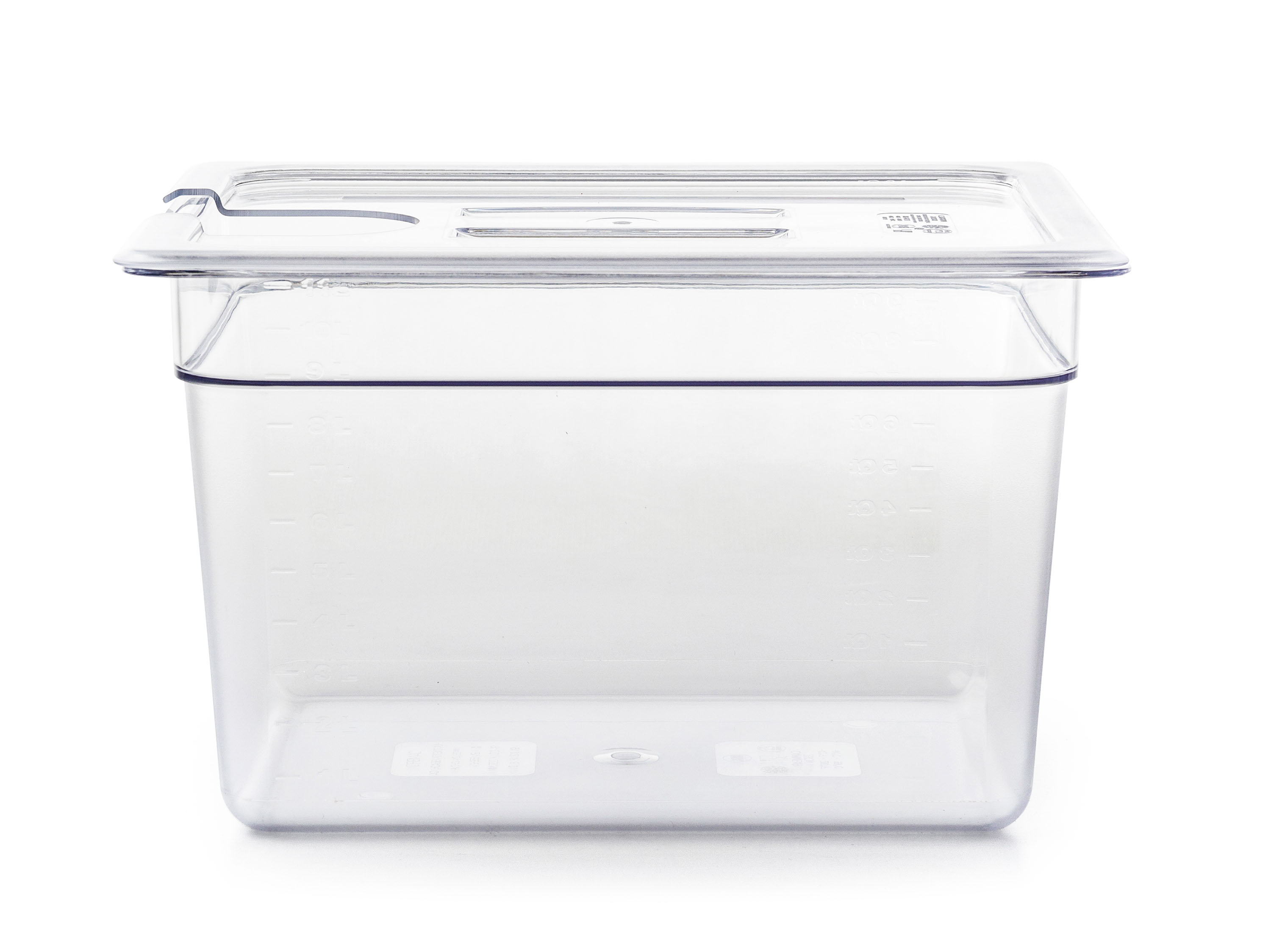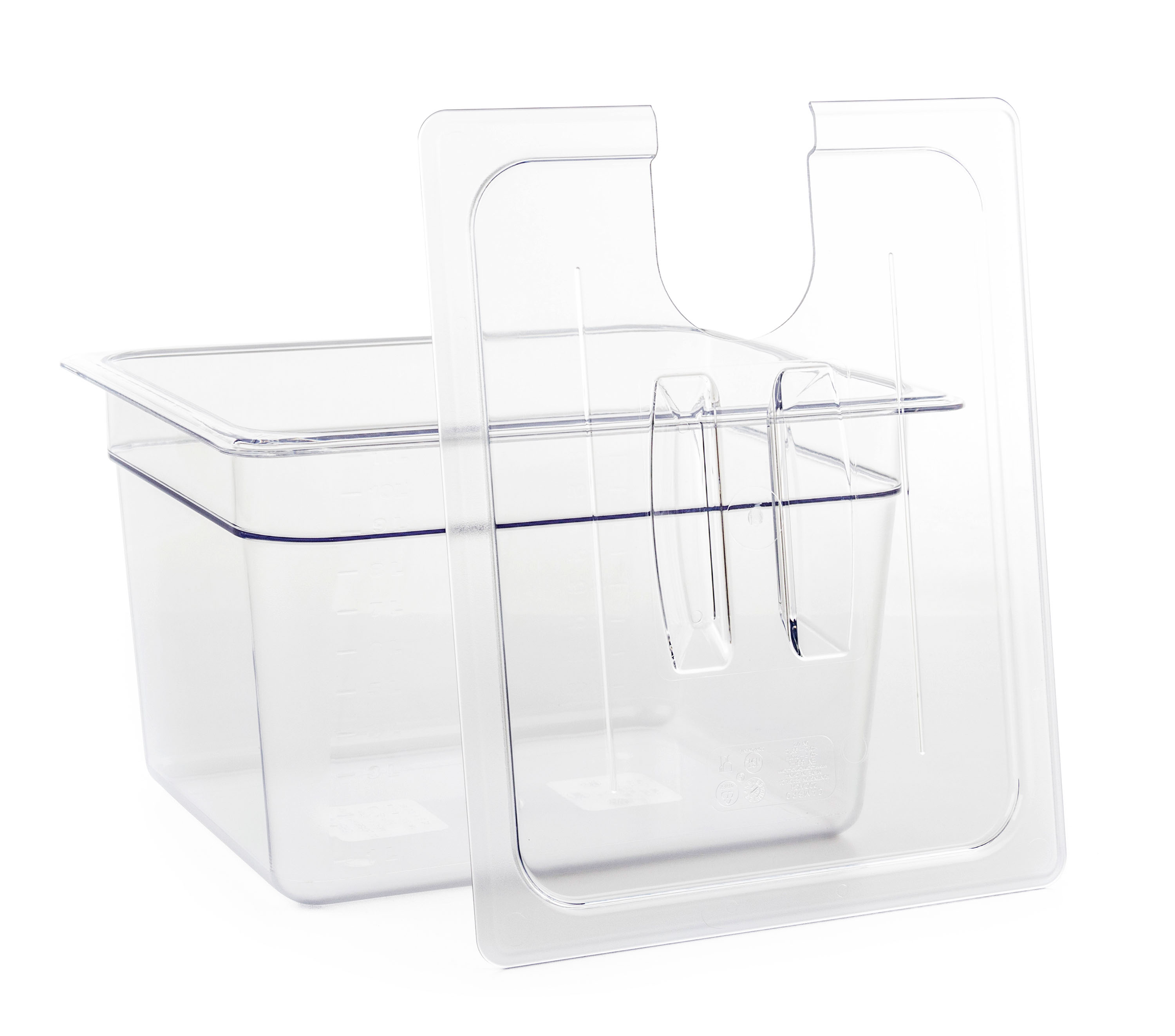 7l nádoba pro vaření metodou Sous Vide zabraňuje vypařování vody, pomáhá lépe udržovat teplotu a zamezí nežádoucím tepelným ztrátám, nádobu je možné mýt v myčce na nádobí. Polykarbonát, čirá barva.