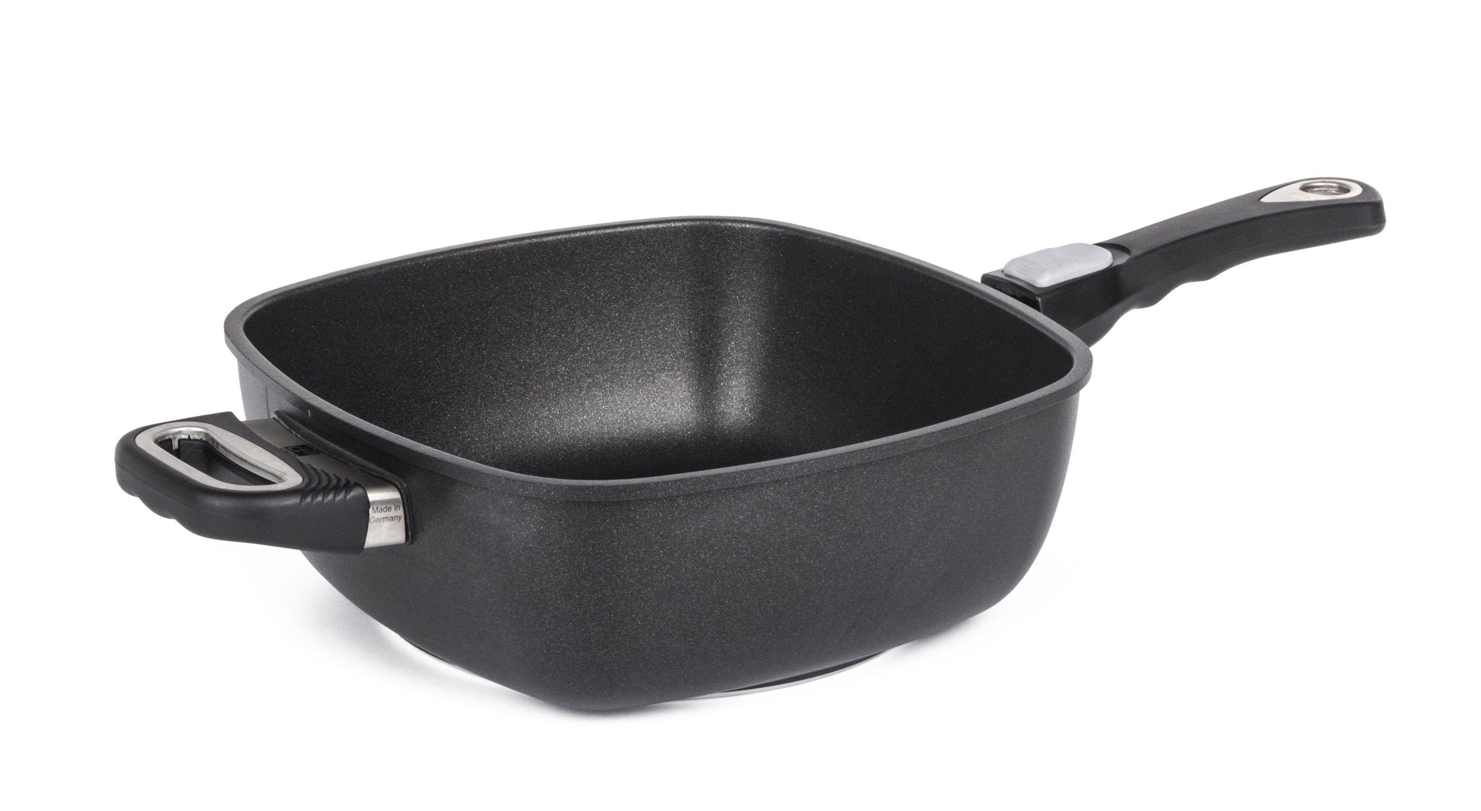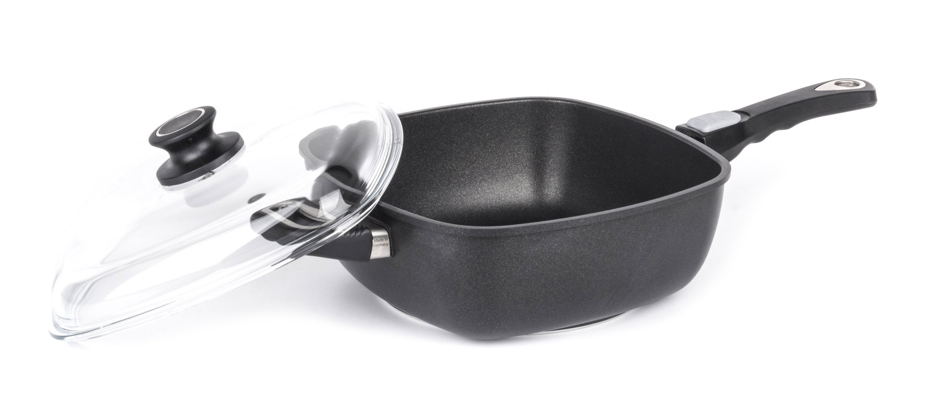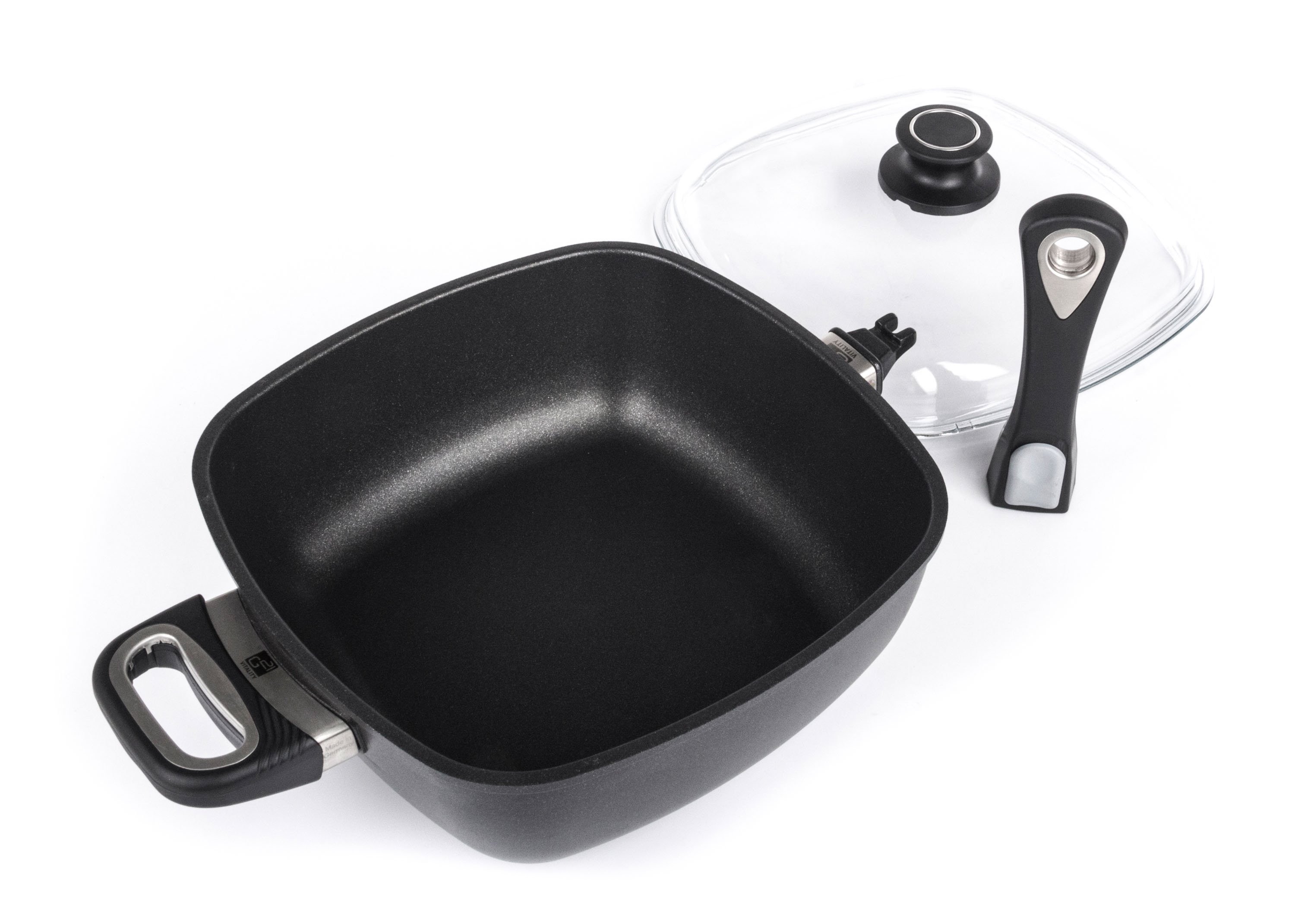 Prohlédněte si čtvercovou, 9 cm vysokou pánev, která splňuje všechny uvedené požadavky na dokonalou pánev. Je univerzální pro všechny typy ohřevů, teplo vede dokonale rovnoměrně, jídlo se na ní díky speciální nepřilnavé vrstvě LOTAN® nepřipaluje a smažit či zapékat můžete bez použití oleje.