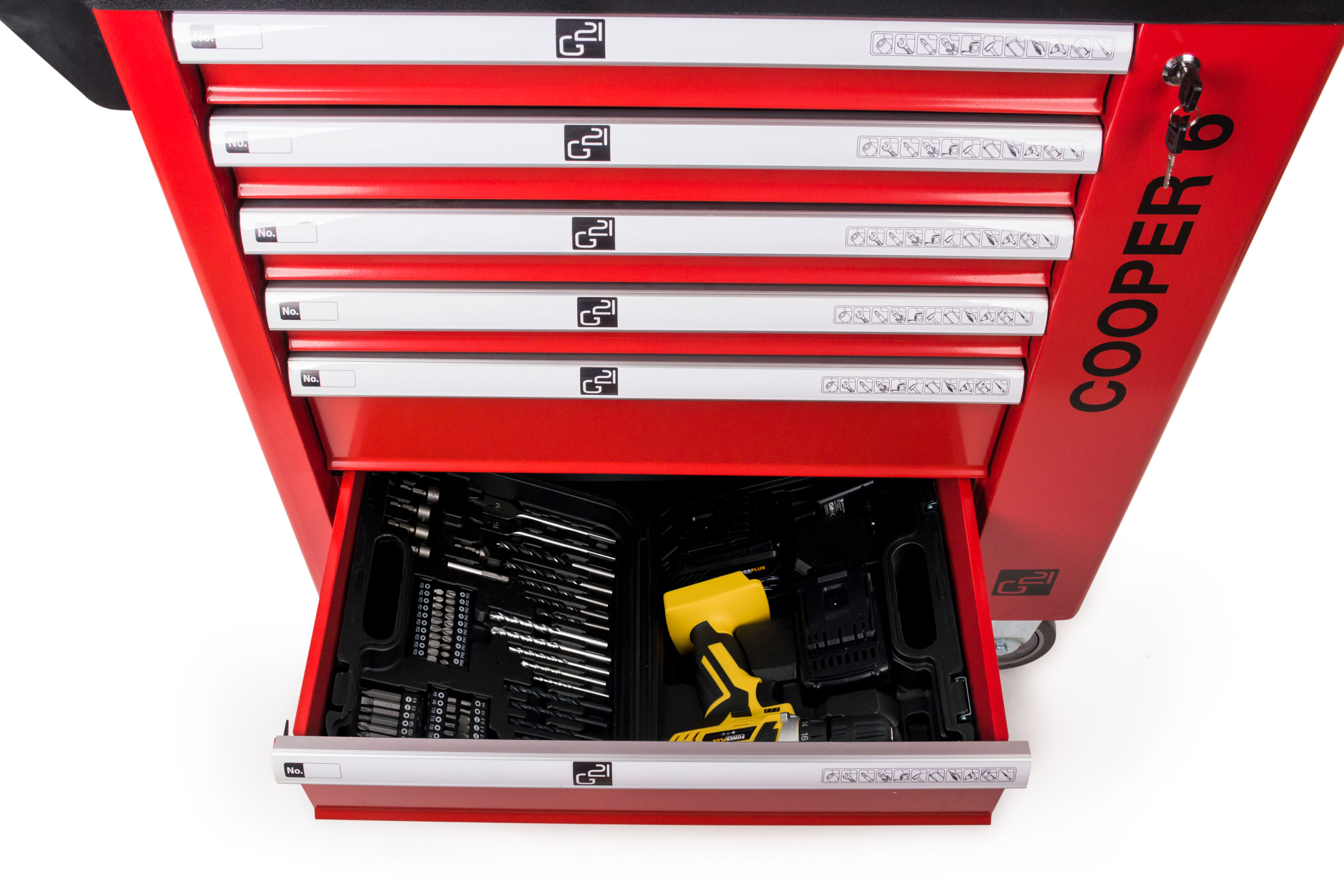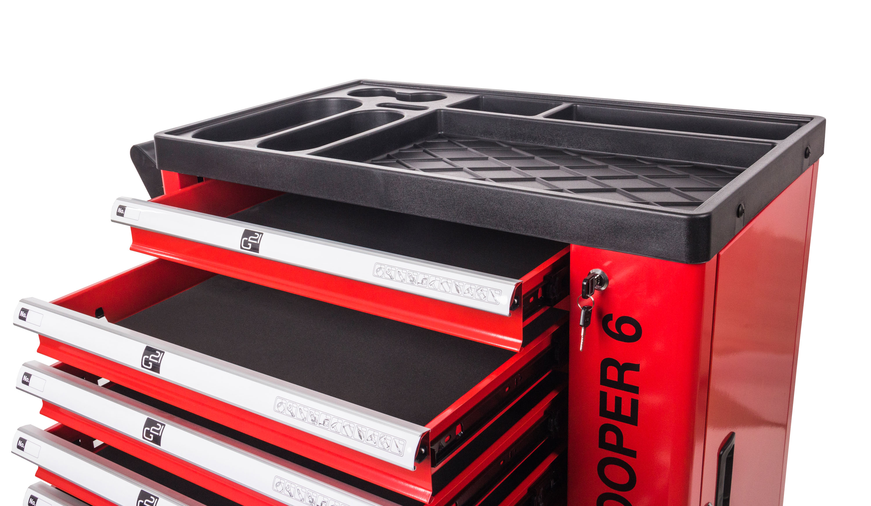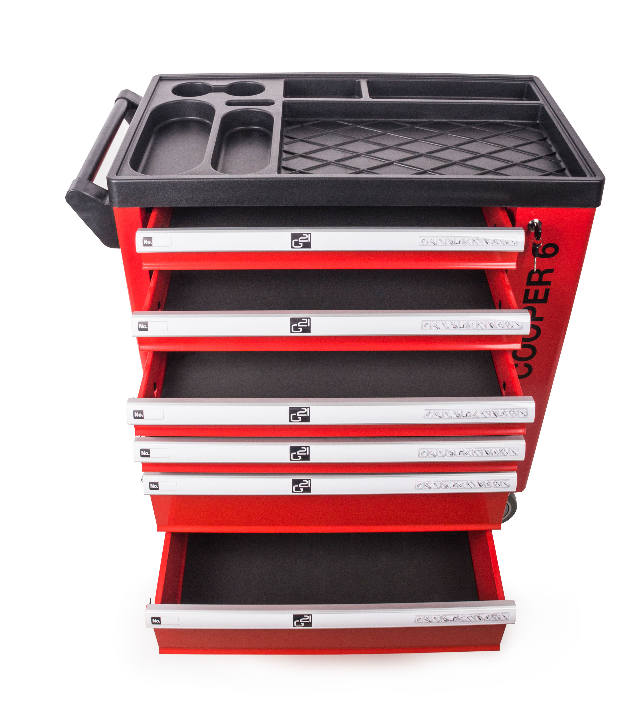 Díky dílenskému vozíku G21 Cooper 6 budete mít své nářadí stále při ruce, přitom však bezpečně uložené, chráněné před prachem a zároveň snadno dostupné. Dílenský box na nářadí G21 Cooper má 6 zásuvek s hladkým pojezdem – 4 s vnitřní výškou 5,5 cm pro uložení malého ručního nářadí a příslušenství, 2 s vnitřní výškou 13,5 cm pro bezpečné uskladnění většího ručního, elektrického nebo aku nářadí.