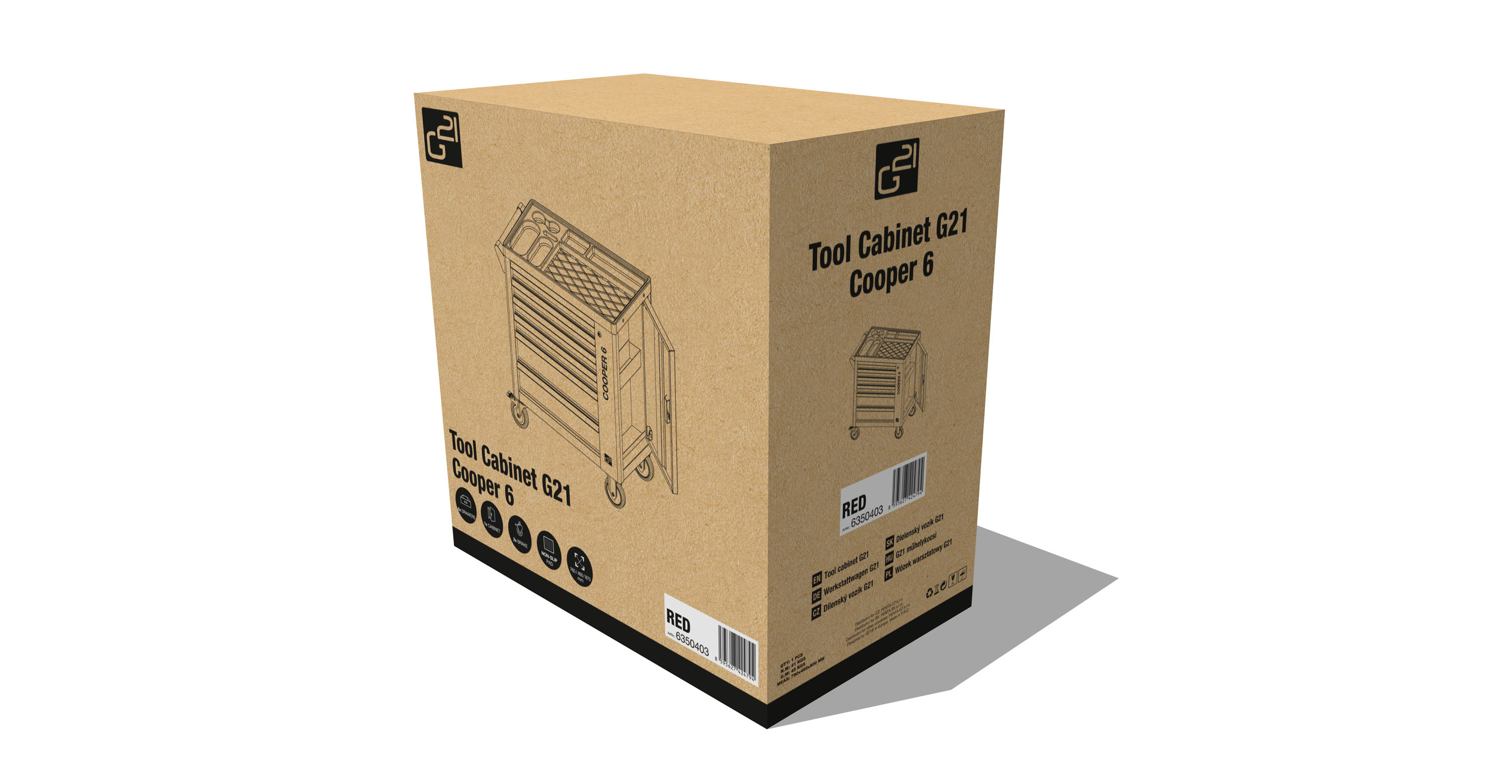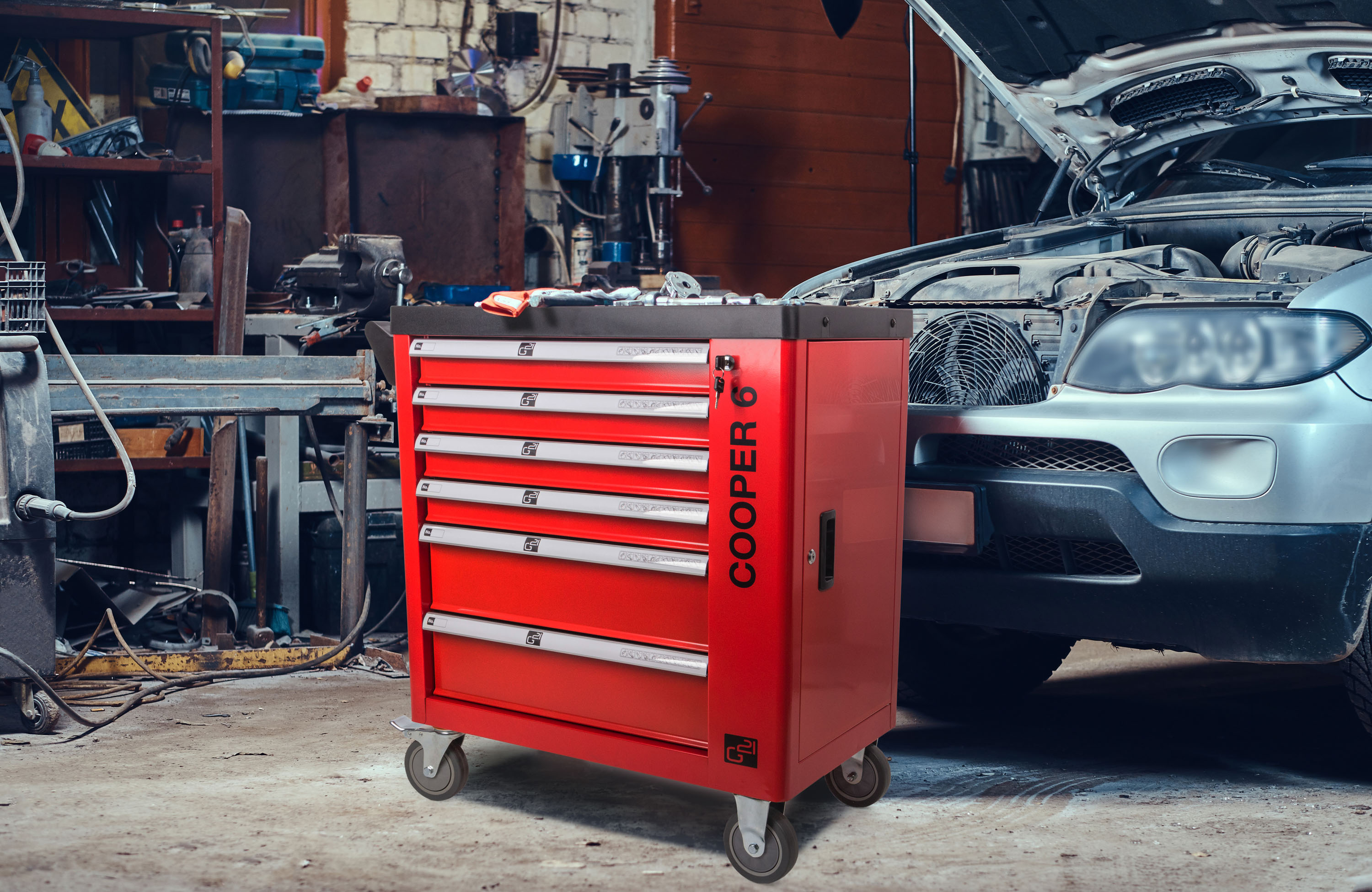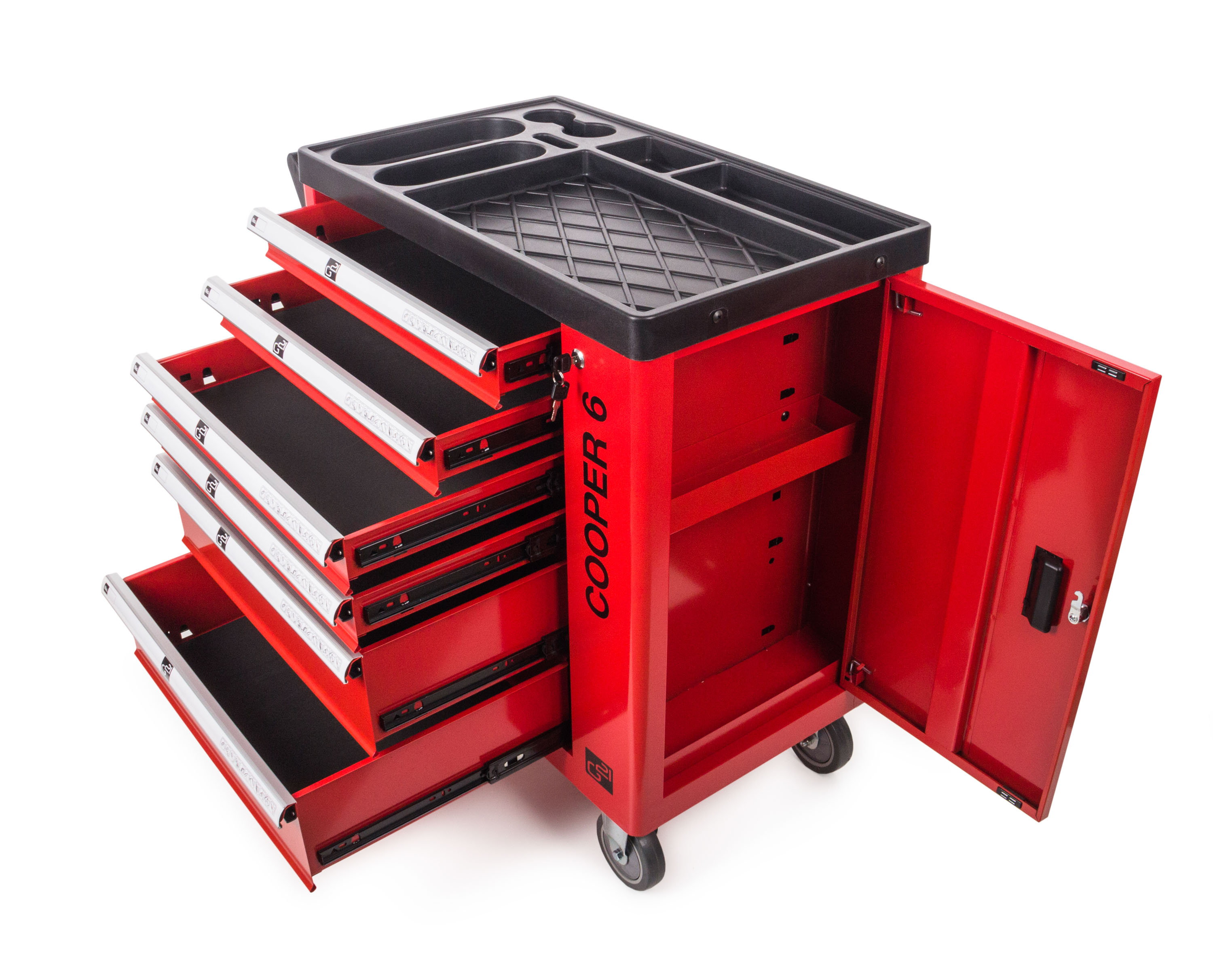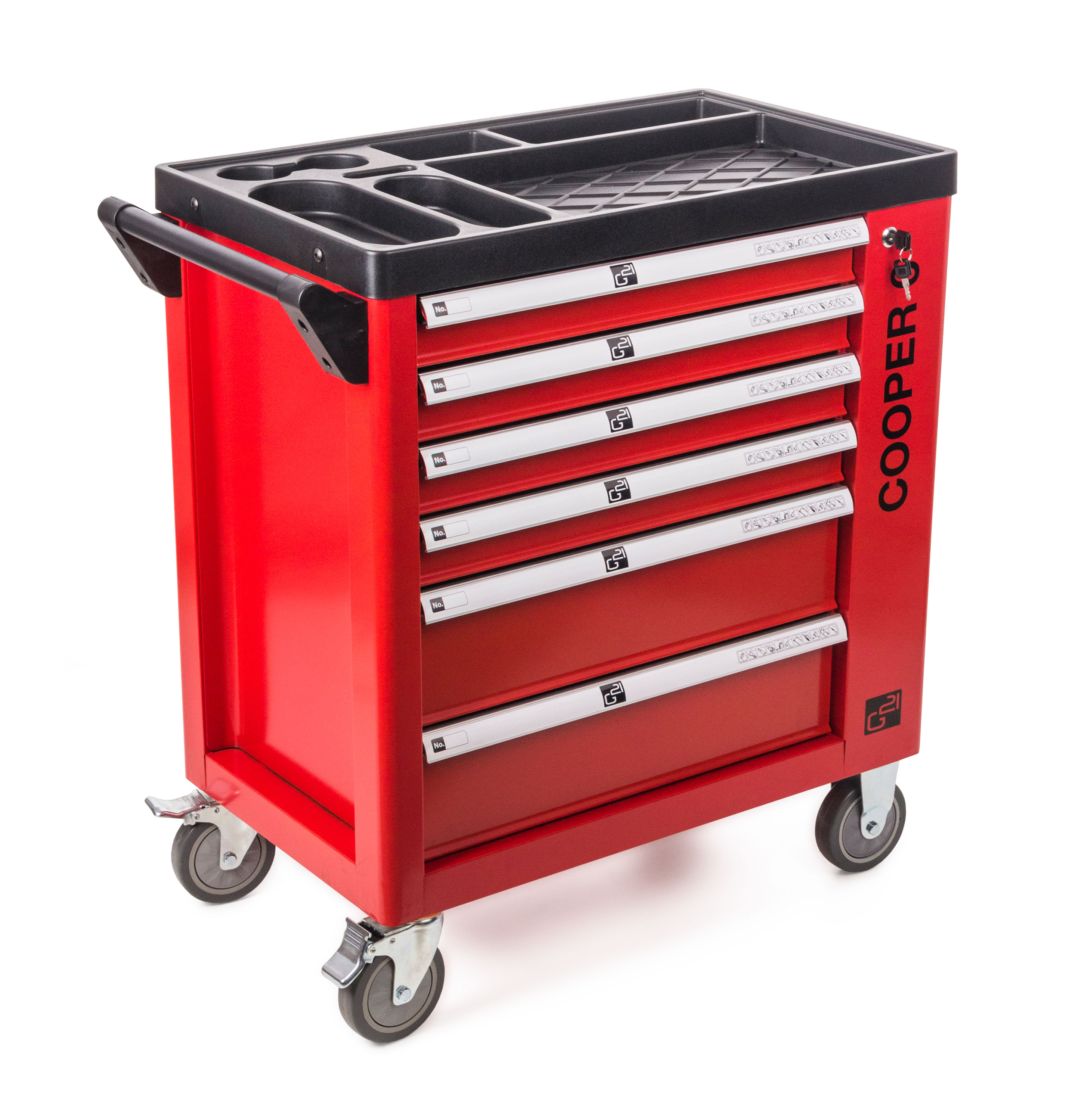 Díky dílenskému vozíku G21 Cooper 6 budete mít své nářadí stále při ruce, přitom však bezpečně uložené, chráněné před prachem a zároveň snadno dostupné. Dílenský box na nářadí G21 Cooper má 6 zásuvek s hladkým pojezdem – 4 s vnitřní výškou 5,5 cm pro uložení malého ručního nářadí a příslušenství, 2 s vnitřní výškou 13,5 cm pro bezpečné uskladnění většího ručního, elektrického nebo aku nářadí.