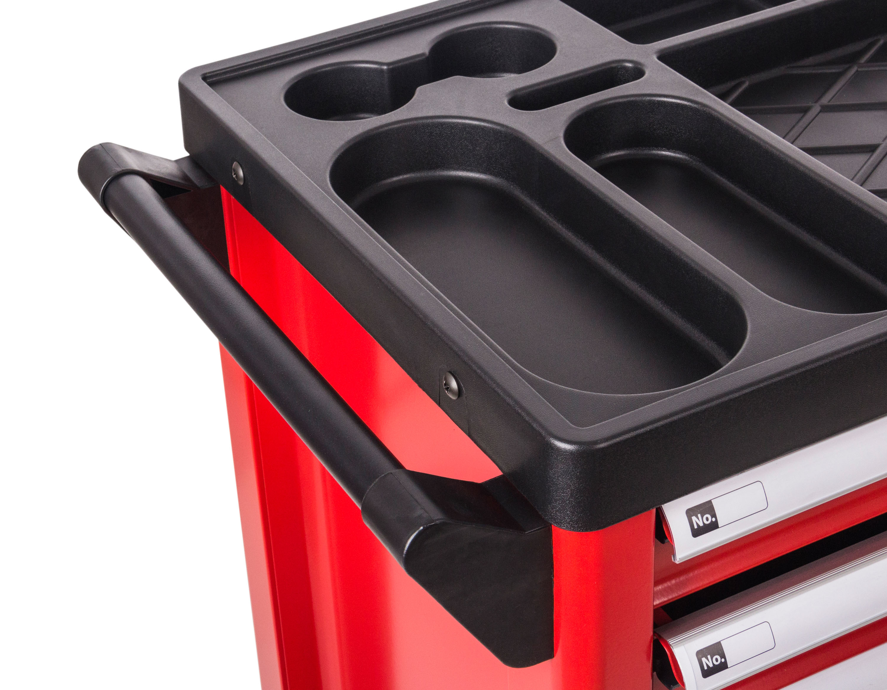 Díky promyšlenému řešení horní strany můžete mít na pracovní desce odložené věci, aniž by spadly při pohybu vozíku. V pracovní desce jsou zapuštěné přihrádky, ve kterých můžete mít uloženy nejčastěji používané nářadí, šrouby a díly, které potřebujete mít stále při ruce a podobně.