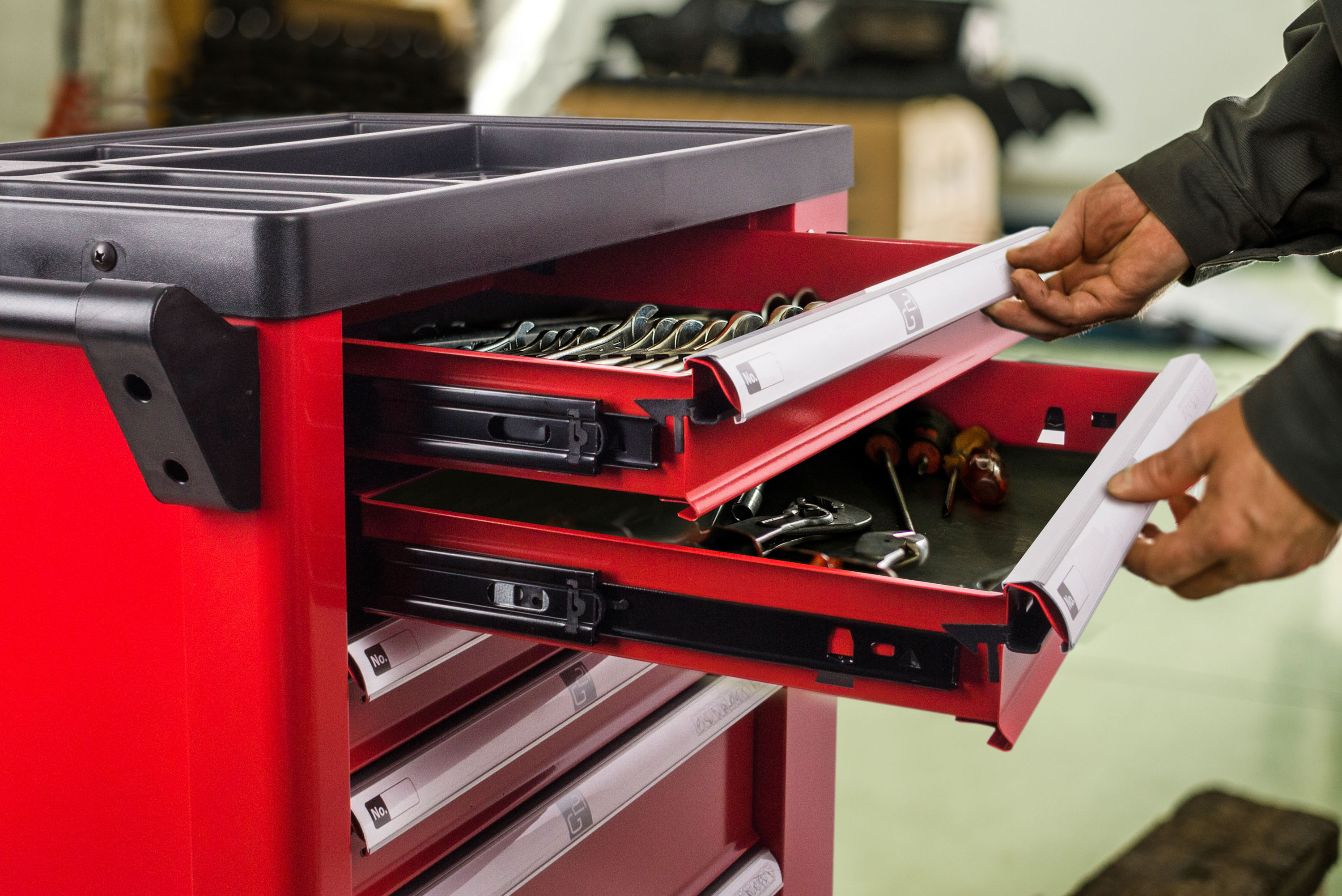 Náhodného otevření při přesouvání se bát nemusíte – všechny zásuvky jsou opatřeny bezpečnostní pojistkou, která nežádoucímu otevření zásuvek zabrání. Pro větší bezpečí uloženého nářadí jsme dílenský vozík navíc vybavili i centrálním zámkem pro zásuvky a zámkem pro boční skříňku.